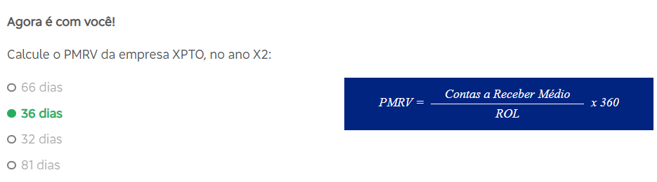 Agora é com você! Calcule PMRV da empresa XPTO, no ano X2: 66 dias Contas a Receber Médio PMRV = x 360 36 dias ROL 32 dias 81 dias