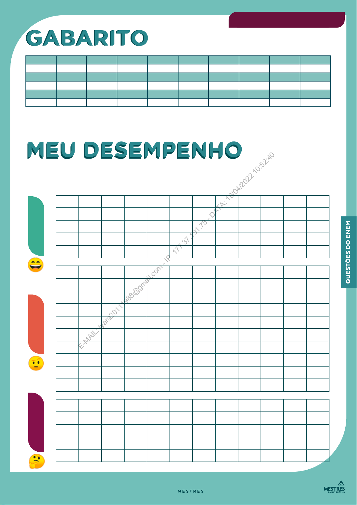 RAIO-X DOS191 1) C 2) B 3) C 4) C 5) C 6) C 7) D 8) A 9) C 10) C 11) E 12) D 13) D 14) E 15) B 16) D 17) C 18) D 19) B 20) C 21) C 22) A 23) D 24) C 25) B 26) D 27) E 28) A 29) C 30) A 31) D 32) E 33) A 34) A 35) B 36) D 37) D 38) B 39) D 40) E 41) E 42) B 43) C 44) D Marque as questões que VOCÊ ERROU com o número das questões no quadro, de acordo com a graduação. FÁ CE IS M ÉD IA S DI FÍ CE IS 1) C 2) B 3) C 4) C 5) C 6) C 7) D 8) A 9) C 10) C 11) E 12) D 13) D 14) E 15) B 16) D 17) C 18) D 19) B 20) C 21) C 22) A 23) D 24) C 25) B 26) D 27) E 28) A 29) C 30) A 31) D 32) E 33) A 34) A 35) B 36) D 37) D 38) B 39) D 40) E 41) E 42) B 43) C 44) D Marque as questões que VOCÊ ERROU com o número das questões no quadro, de acordo com a graduação. FÁ CE IS M ÉD IA S DI FÍ CE IS PORCENTAGEM E JUROS RAZÃO E PROPORÇÃO 1) E 2) D 3) B 4) E 5) E 6) C 7) B 8) D 9) C 10) B 11) B 12) B 13) E 14) C 15) D 16) B 17) B 18) E 19) C 20) A 21) D 22) B 23) D 24) A 25) D 26) A 27) B 28) D 29) B 30) A 31) D 32) C 33) D 34) E 35) B 36) D 37) E 38) A 39) C 40) D 41) D 42) B 43) C 44) B 45) A 46) D 47) D 48) B 49) A 50) D 51) E 52) A 53) B 54) B 55) A 56) B 57) E 58) E 59) C 60) B 61) E 62) C 63) C 64) B 65) A 66) D 67) D 68) B 69) E 70) A 71) B 72) A 73) B 74) C 75) C 76) E 77) A 78) B 79) E 80) B 81) C 82) B 83) C 84) A 85) C 86) B 87) D 88) D 89) B 90) B 91) E 92) C 93) B 94) C 95) A 96) C 97) C 98) C 99) B 100) D 101) C 102) B 103) A 104) D 105) C ESTATÍSTICA E MÉDIAS 1) C 2) A 3) D 4) B 5) B 6) E 7) B 8) C 9) B 10) D 11) B 12) E 13) E 14) C 15) B 16) D 17) C 18) C 19) B 20) A 21) B 22) D 23) A 24) B 25) B 26) C 27) D 28) B 29) B 30) E 31) D 32) D 33) A 34) D 35) C 36) B 37) D 38) D 39) B 40) D 41) D 42) C 43) E 44) A 45) B 46) D 47) C 48) C 49) C 50) D 51) D 52) C 53) E 54) D 55) B 56) C 57) D 58) C 59) C 60) C 61) E GEOMETRIA PLANA 1) E 2) B 3) D 4) C 5) C 6) D 7) A 8) C 9) B 10) B 11) B 12) E 13) C 14) A 15) E 16) C 17) C 18) D 19) A 20) C 21) E 22) A 23) E 24) A 25) A 26) B 27) C 28) A 29) B 30) B 31) D 32) B 33) C 34) D 35) A 36) A 37) E 38) A 39) D 40) B 41) A 42) C 43) D 44) B 45) A 46) C 47) B 48) D 49) E 50) D 51) C 52) A 53) E 54) D PORCENTAGEM E JUROS 1) C 2) B 3) C 4) C 5) C 6) C 7) D 8) A 9) C 10) C 11) E 12) D 13) D 14) E 15) B 16) D 17) C 18) D 19) B 20) C 21) C 22) A 23) D 24) C 25) B 26) D 27) E 28) A 29) C 30) A 31) D 32) E 33) A 34) A 35) B 36) D 37) D 38) B 39) D 40) E 41) E 42) B 43) C 44) D 45) C 46) D 47) C 48) A 49) D 50) B 51) C GEOMETRIA ESPACIAL 1) D 2) B 3) B 4) A 5) A 6) E 7) D 8) B 9) E 10) D 11) C 12) E 13) C 14) A 15) A 16) D 17) E 18) B 19) A 20) E 21) D 22) E 23) B 24) C 25) C 26) C 27) A 28) D 29) E 30) D 31) C 32) B 33) E 34) C 35) D 36) D 37) A 38) A 39) D 40) B 41) E 42) A 43) B 44) C 45) B 46) E 47) B 48) D 49) C E-M AIL : t ya ra 20 11 19 88 @ gm ail .co m - IP : 1 77 .3 7. 19 1. 78 - DATA: 1 0/ 04 /2 02 2 10 :5 2: 40