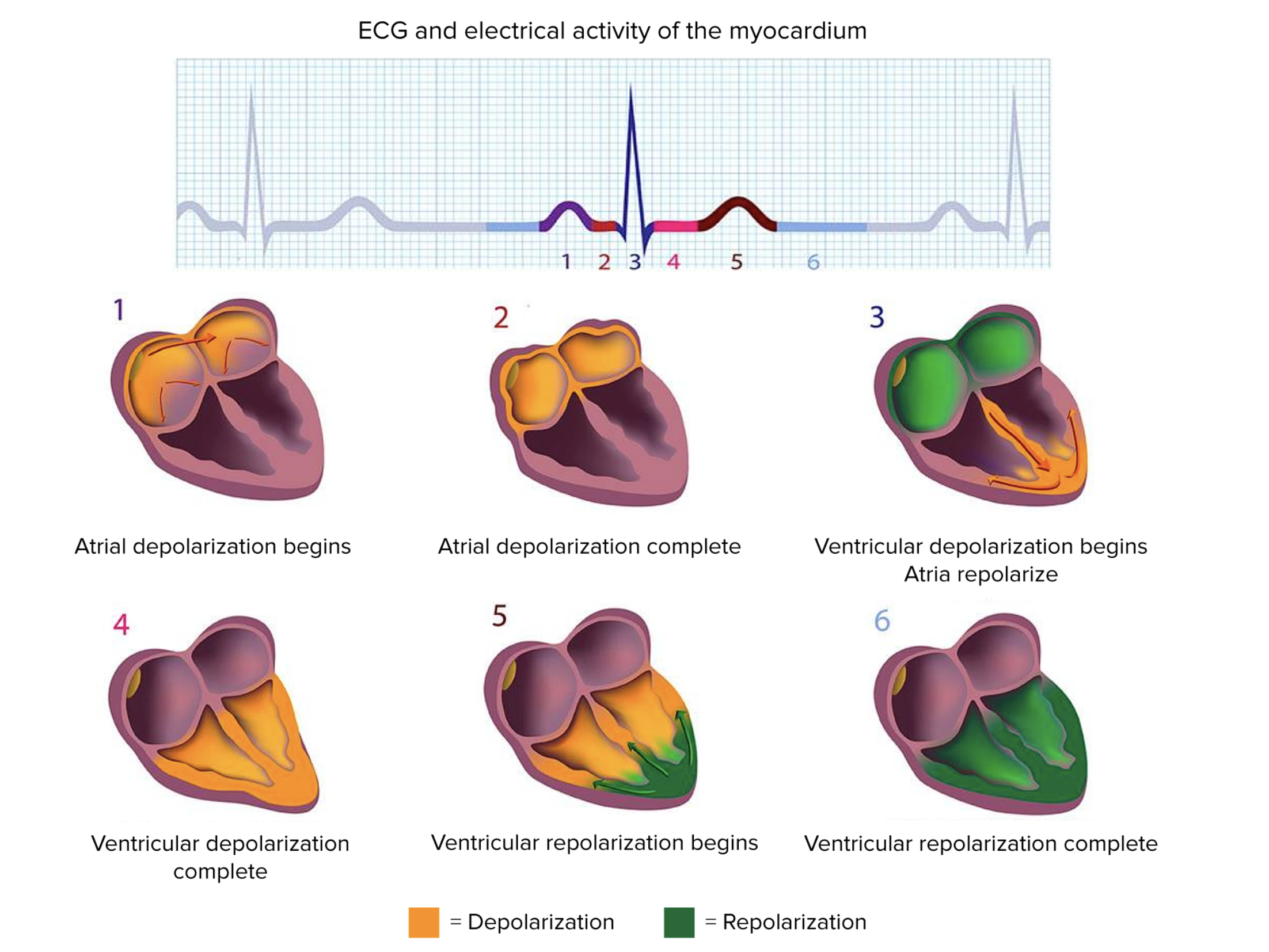 ECG and electrical activity of the myocardium 2 3 5 6 1 2 3 Atrial depolarization begins Atrial depolarization complete Ventricular depolarization begins Atria repolarize 4 5 6 Ventricular depolarization Ventricular repolarization begins Ventricular repolarization complete complete = Depolarization = Repolarization