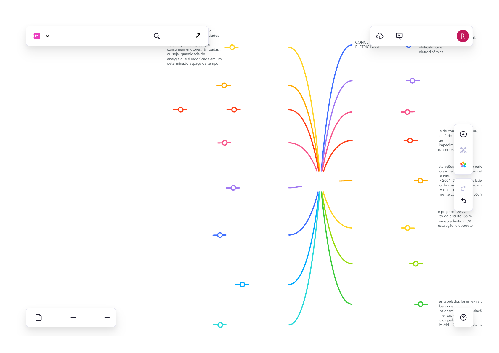 Meu novo mapa mentalInstalações Elétricas FUNDAMENTOS DAS INSTALAÇÕES ELÉTRICAS Os equipamentos elétricos normalmente são diferenciados pelas potências que geram (geradores) ou que consomem (motores, lâmpadas), ou seja, quantidade de energia que é modificada em um determinado espaço de tempo FORNECIMENTO DE ENERGIA ELÉTRICA Fornecimento de Energia em Alta Tensão (> 75 kW, FP = 0,92), Fornecimento de Energia Elétrica em Baixa Tensão, ASPECTOS DE PROJETOAspectos Relevantes Tomadas de uso geral (TUG,- Tomadas de uso específico (TUE): MATERIAIS E EQUIPAMENTOS EM INSTALAÇÕES ELÉTRICAS Viabilidade: técnica, econômica, executiva. - Eficiência: baixas perdas, atendimento aos requisitos de carga. - Segurança: pessoal, patrimonial, ambiental. DIMENSIONAMENTO DE CONDUTORES Abrigam e encaminham os condutores. As principais funções são direcionamento, sustentação e proteção mecânica. Os tipos mais comuns são os eletrodutos, eletrocalhas, leitos e escadas. CIRCUITO PARA ACIONAMENTO DE MOTORES ELÉTRICOS O dimensionamento dos circuitos exclusivos de motores elétricos considera que este tipo de carga apresenta um comportamento durante o processo de partida que é diferente do comportamento em regime. SISTEMAS PREDIAIS ADICIONAIS Outros sistemas são empregados em edifícios, como redes de telefonia, TV, CFTV e o próprio cabeamento estruturado ligado às redes inteligentes. Iniciando o capítulo, será falado sobre a importância da luminotécnica DIMENSIONAMENTO DE INSTALAÇÃO ELÉTRICA PREDIAL - PARTE 2 O dimensionamento foi realizado para material magnético, conforme estabelecido inicialmente em projeto CONCEITOS BÁSICOS DE ELETRICIDADE A eletricidade, de um modo geral, pode ser subdividida em eletrostática e eletrodinâmica. LEIS DE OHM E KIRCHHOFF As leis de Ohm permitem determinar grandezas físicas, como a tensão, corrente e a resistência elétrica dos mais diversos elementos presentes em um circuito. CIRCUITOS ALGÉBRICOS Resistências em Série e Paralelo, Resistências em Série. CIRCUITOS DE CORRENTE ALTERNADA Nos circuitos de corrente contínua, a resistência elétrica é a única grandeza que expressa o impedimento à passagem da corrente elétrica INTRODUÇÃO ÀS INSTALAÇÕES ELÉTRICAS As instalações elétricas de baixa tensão são regulamentadas pel Norma NBR 5410 / 2004. Considera-se baix tensão de corrente alternadas d 1000 V e tensões de corrente contínua de 1500 V EXEMPLO DE DIMENSIONAMENTO DE CONDUTORES - Corrente de projeto: 125 A. - Comprimento do circuito: 85 m. - Queda de tensão admitida: 3%. - Forma de instalação: eletroduto aparente. - Temperatura ambiente: 40 ºC. - Número de circuitos agrupados no mesmo eletroduto: 3. EXEMPLO PARA CIRCUITO DE MOTORES ELÉTRICOS Fatores de Correção,Para a Queda de Tensão. DIMENSIONAMENTO DE INSTALAÇÃO ELÉTRICA PREDIAL - PARTE 1 Todos os valores obtidos foram coletados através de equações referentes a cada etapa do dimensionado e valores tabelados foram extraíd de tabelas de Dimensionamento de Instalação Baixa Tensão – Uso Geral, fornecida pela empresa PRYSMIAN – Cables & Systems Meu novo mapamentalInstal… Upgrade Compartilhar 64% 17/03/2025, 22:03 Meu novo mapa mentalInstalações Elétricas - MindMeister Mapa mental https://www.mindmeister.com/app/map/3653808060?source=blank 1/1 https://www.mindmeister.com/mind-map-pricing