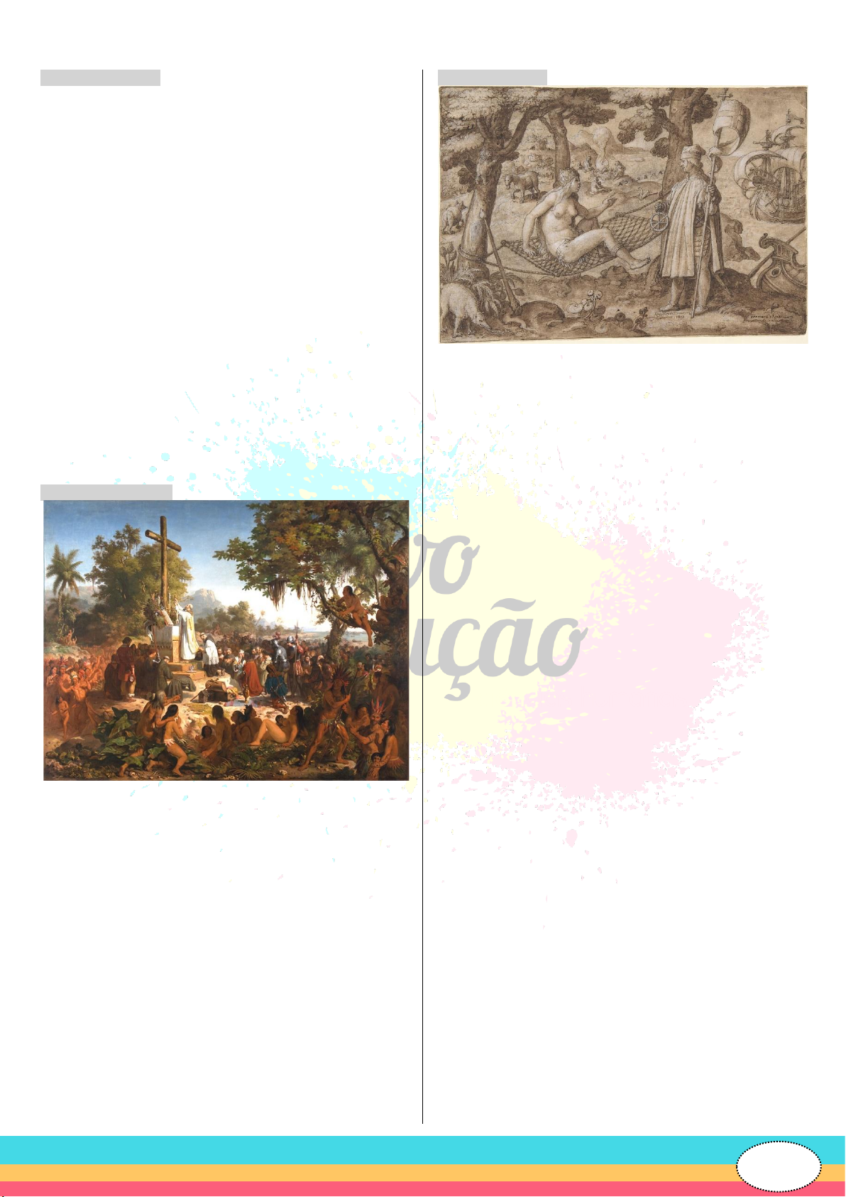 91 344. (ENEM/2017) Os cartógrafos portugueses teriam falseado as representações do Brasil nas cartas geo- gráficas, fazendo concordar o meridiano com os aci- dentes geográficos de forma a ressaltar uma suposta fronteira natural dos domínios lusos. O delineamento de uma grande lagoa que conectava a bacia platina com a amazônica já era visível nas primeiras descrições ge- ográficas e mapas produzidos por Gaspar Viegas, no Atlas de Lopo Homem (1519), nas cartas de Diogo Ri- beiro (1525-27), no planisfério de André Homen (1559), nos mapas de Bartolomeu Velho (1561). KANTOR, Í. Usos diplomáticos da ilha-Brasil: polêmicas cartográficas e historiográficas. Varia Historia, n. 37, 2007 (adaptado). De acordo com a argumentação exposta no texto, um dos objetivos das representações cartográficas menci- onadas era a) garantir o domínio da Metrópole sobre o território cobi- çado. b) demarcar os limites precisos do Tratado de Tordesilhas. c) afastar as populações nativas do espaço demarcado. d) respeitar a conquista espanhola sobre o Império Inca. e) demonstrar a viabilidade comercial do empreendimento colonial. 345. (FUVEST/2015) A respeito da imagem acima, que reproduz um quadro de Victor Meirelles, é correto afirmar que ela representa a) a descoberta do Brasil no século XV, em uma concepção profundamente religiosa, típica da Ditadura Militar. b) os primórdios da presença europeia no Brasil, em uma concepção romântica de exaltação da nacionalidade, típica do século XIX. c) a união entre brancos, negros e indígenas no Brasil, em uma concepção modernista, típica das primeiras décadas do século XX. d) a destruição das populações indígenas a partir do século XVI, em uma concepção crítica, típica de finais do século XIX. e) a união das populações brasileiras contra as invasões holandesas do século XVII, em uma concepção acadêmica, típica da segunda metade do século XVIII. 346. (IFBA/2015) Analise a figura e o texto a seguir: “Descoberta da América: chegada de Américo Vespúcio”. Gravura em metal de Theodor Galle baseada num desenho de Jan van der Straet (ca. 1575). Disponível em: . Acesso em 22 de set. 2014, às 20h47. A história canônica do Brasil começa com o “Descobri- mento”. Nesta cena Américo Vespúcio desperta a Amé- rica, representada por uma índia Tupinambá, deitada na rede. Rede, tacape e cenas de antropofagia, que se veem ao fundo, são emblemáticos dos Tupinambás. De- senho de Jan van der Straet (também chamado Stada- nus), gravura de Theodor Galle (1589). (CUNHA, Manuela Carneiro. Introdução a uma história indígena. In: CUNHA, Manuela Carneiro. História dos Índios no Brasil. SP: Companhia das Letras, 1992. P. 09). Sobre história Indígena do Brasil nos primeiros séculos de colonização é correto afirmar: a) a imagem revela o estranhamento dos europeus sobre os indígenas e a visão celestial sobre os mesmos atribuída ao longo da colonização. b) a História do Brasil oficial começa com a chegada dos portugueses, não sendo possível a compreensão da histó- ria dos índios pela sua quase extinção em tempos coloniais. c) a visão tradicional sobre a História do Brasil narra, comu- mente, a chegada dos europeus como um “despertar” desta “Nova Terra”, menosprezando a história dos indígenas. d) os rituais de antropofagia, representados na imagem, fo- ram alguns dos costumes mais abominados pelos euro- peus, contudo foram posteriormente aceitos e adaptados à cultura europeia. e) a rede e o tacape, presentes na imagem, revelam o atraso tecnológico dos indígenas e a superioridade em to- das as esferas - seja técnica e tecnológica, seja também cultural e religiosa - do colonizador europeu.