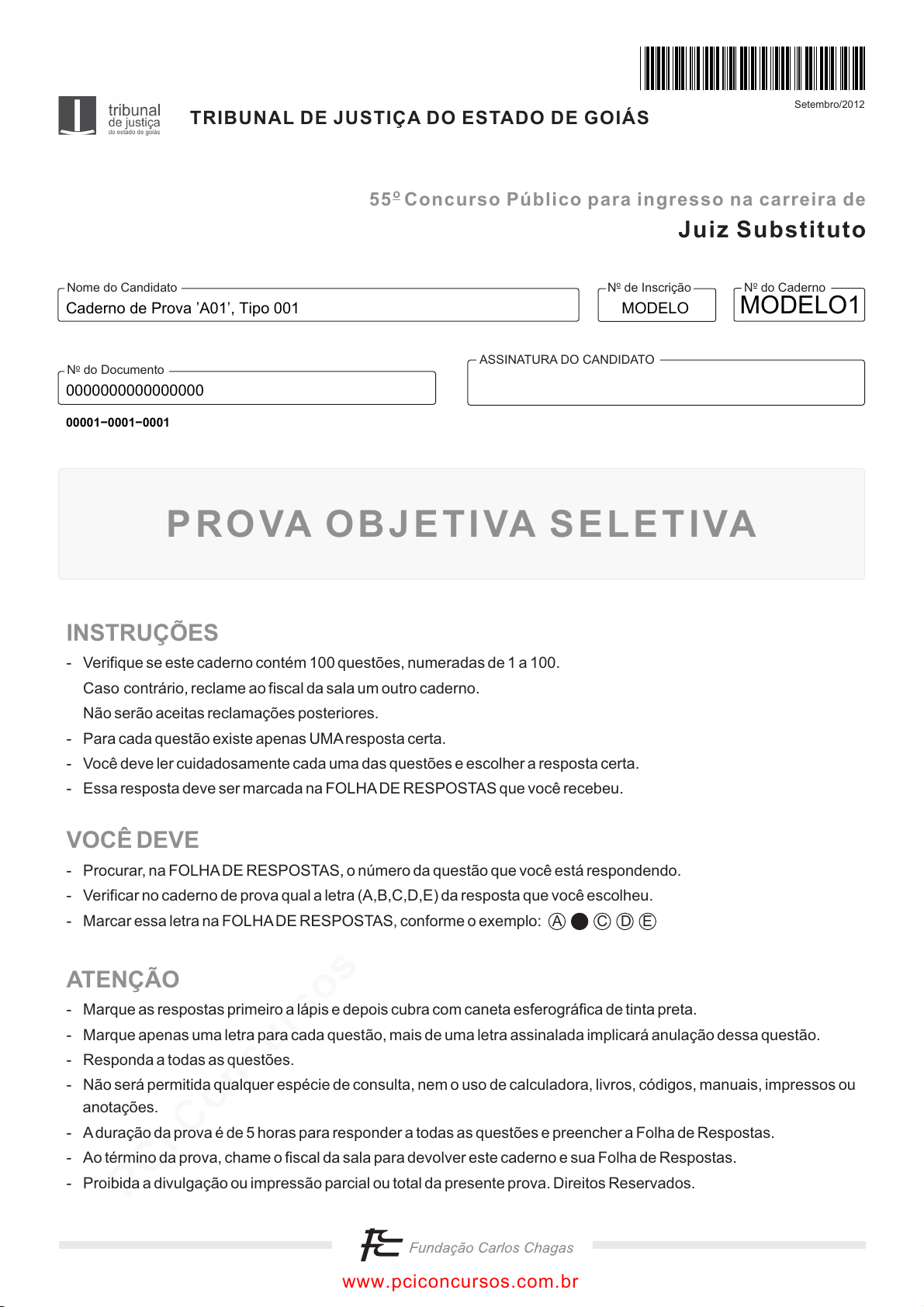 pcimarkpci MDAwMDowMDAwOjAwMDA6MDAwMDowMDAwOmZmZmY6MmQ4YzpjMWIx:U3VuLCAyMyBNYXIgMjAyNSAxODowODo1NiAtMDMwMA== www.pciconcursos.com.br INSTRUÇÕES VOCÊ DEVE ATENÇÃO - Verifique se este caderno contém 100 questões, numeradas de 1 a 100. Caso contrário, reclame ao fiscal da sala um outro caderno. Não serão aceitas reclamações posteriores. - Para cada questão existe apenas UMAresposta certa. - Você deve ler cuidadosamente cada uma das questões e escolher a resposta certa. - Essa resposta deve ser marcada na FOLHADE RESPOSTAS que você recebeu. - Procurar, na FOLHADE RESPOSTAS, o número da questão que você está respondendo. - Verificar no caderno de prova qual a letra (A,B,C,D,E) da resposta que você escolheu. - Marcar essa letra na FOLHADE RESPOSTAS, conforme o exemplo: - Marque as respostas primeiro a lápis e depois cubra com caneta esferográfica de tinta preta. - Marque apenas uma letra para cada questão, mais de uma letra assinalada implicará anulação dessa questão. - Responda a todas as questões. - Não será permitida qualquer espécie de consulta, nem o uso de calculadora, livros, códigos, manuais, impressos ou anotações. - Aduração da prova é de 5 horas para responder a todas as questões e preencher a Folha de Respostas. - Ao término da prova, chame o fiscal da sala para devolver este caderno e sua Folha de Respostas. - Proibida a divulgação ou impressão parcial ou total da presente prova. Direitos Reservados. A C D E N do CadernooN de Inscriçãoo ASSINATURA DO CANDIDATO N do Documentoo Nome do Candidato Setembro/2012 TRIBUNAL DE JUSTIÇA DO ESTADO DE GOIÁS 55 Concurso Público para ingresso na carreira deo Juiz Substituto PROVA OBJETIVA SELETIVA Caderno de Prova ’A01’, Tipo 001 MODELO 0000000000000000 MODELO1 00001−0001−0001 www.pciconcursos.com.br pcimarkpci MDAwMDowMDAwOjAwMDA6MDAwMDowMDAwOmZmZmY6MmQ4YzpjMWIx:U3VuLCAyMyBNYXIgMjAyNSAxODowODo1NiAtMDMwMA== www.pciconcursos.com.br 2 TJUGO-Juiz Substituto BLOCO UM Direito Civil 1. A hipoteca (A) poderá ter como objeto navios e aeronaves. (B) impede o proprietário de alienar o imóvel sobre o qual está constituída. (C) não poderá ter como objeto bens que não sejam de propriedade do devedor. (D) não poderá ser constituída para garantia de dívida futura. (E) cancela, a partir de seu registro, necessariamente, todos os ônus reais constituídos e registrados ante- riormente. _________________________________________________________ 2. Renato, Messias e Augusto são proprietários de frações ideais iguais de uma casa, por força de sucessão de seu pai. Augusto pretende doar sua fração a Conceição, que foi uma enfermeira muito dedicada a seu pai, por muitos anos. Neste caso (A) Augusto deve oferecer a Renato e Messias sua fra- ção ideal antes de doá-la a Conceição, sob pena de nulidade da doação. (B) Renato e Messias têm preferência na aquisição da fração ideal de Augusto e podem anular a doação por terem sido preteridos. (C) tendo Renato e Messias frações iguais, poderá ha- ver a fração de Augusto aquele que depositar pri- meiro o preço. (D) tendo Renato e Messias frações iguais, poderá ha- ver a fração de Augusto aquele que depositar valor maior. (E) não há direito de preferência em favor de Renato e Messias no caso em testilha. _________________________________________________________ 3. O TITULAR é obrigado a conservar, como se sua própria fora, a coisa objeto do contrato, não podendo usá-la senão de acordo com o contrato ou a natureza dela, sob pena de responder por perdas e danos. O TITULAR constituído em mora, além de por ela responder, pagará, até restituí-la, o aluguel da coisa que for arbitrado pelo OUTRO CONTRATANTE. O TITULAR e o OUTRO CONTRATANTE dos quais trata a sentença acima são, respectivamente, o (A) locatário e o locador. (B) usufrutuário e o nu proprietário. (C) comodatário e o comodante. (D) depositário e o depositante. (E) mandatário e o mandante. _________________________________________________________ 4. Quando a lei dispuser que determinado ato é anulável, sem estabelecer prazo para pleitear-se a anulação, será este de (A) três anos, no caso de erro. (B) cinco anos, no caso de fraude contra credores. (C) dois anos, a contar da data da conclusão do ato. (D) três anos, a contar da data da conclusão do ato. (E) cinco anos, contados da data da conclusão do ato. 5. NÃO constitui direito do credor pignoratício (A) ter a posse da coisa empenhada. (B) apropriar-se dos frutos da coisa empenhada que se encontra em seu poder. (C) promover a venda antecipada, mediante prévia auto- rização judicial, sempre que haja receio fundado de que a coisa empenhada se perca ou deteriore. (D) ressarcir-se do prejuízo que houver sofrido por vício da coisa empenhada. (E) ficar com o objeto da garantia, se a dívida não for paga no vencimento. _________________________________________________________ 6. No que se refere à classificação dos bens, analise as as- sertivas abaixo. I. O uso comum dos bens públicos pode ser retribuí- do, conforme for estabelecido legalmente pela enti- dade a cuja administração pertencerem. II. Os bens públicos de uso comum do povo e os de uso especial são inalienáveis, enquanto conserva- rem a sua qualificação, na forma que a lei deter- minar. III. Os bens públicos dominicais podem ser alienados, observadas as exigências da lei. Está correto o que se afirma em (A) II e III, apenas. (B) I, II e III. (C) I, apenas. (D) I e III, apenas. (E) II, apenas. _________________________________________________________ 7. O regime da separação de bens obrigatória no casamento (A) é escolhido através de manifestação no pacto ante- nupcial. (B) aplica-se à pessoa maior de sessenta anos. (C) importa na comunicação de todos os bens futuros dos cônjuges. (D) exclui da comunhão apenas os bens anteriores ao casamento. (E) prescinde da celebração de pacto antenupcial. ____________