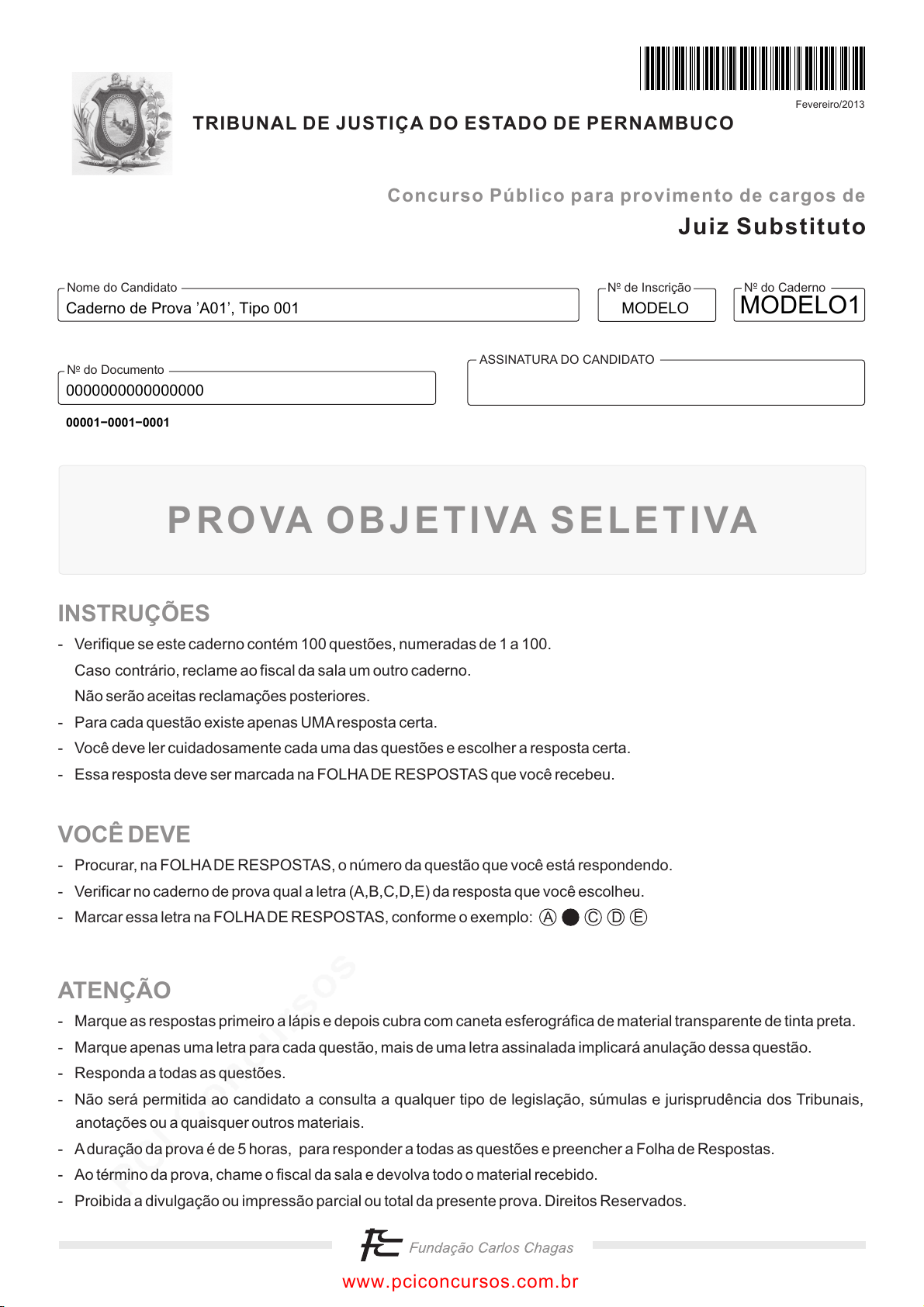 pcimarkpci MDAwMDowMDAwOjAwMDA6MDAwMDowMDAwOmZmZmY6MmQ4YzpjMWIx:U3VuLCAyMyBNYXIgMjAyNSAxODowODo0MiAtMDMwMA== www.pciconcursos.com.br INSTRUÇÕES VOCÊ DEVE ATENÇÃO - Verifique se este caderno contém 100 questões, numeradas de 1 a 100. Caso contrário, reclame ao fiscal da sala um outro caderno. Não serão aceitas reclamações posteriores. - Para cada questão existe apenas UMAresposta certa. - Você deve ler cuidadosamente cada uma das questões e escolher a resposta certa. - Essa resposta deve ser marcada na FOLHADE RESPOSTAS que você recebeu. - Procurar, na FOLHADE RESPOSTAS, o número da questão que você está respondendo. - Verificar no caderno de prova qual a letra (A,B,C,D,E) da resposta que você escolheu. - Marcar essa letra na FOLHADE RESPOSTAS, conforme o exemplo: - Marque as respostas primeiro a lápis e depois cubra com caneta esferográfica de material transparente de tinta preta. - Marque apenas uma letra para cada questão, mais de uma letra assinalada implicará anulação dessa questão. - Responda a todas as questões. - Não será permitida ao candidato a consulta a qualquer tipo de legislação, súmulas e jurisprudência dos Tribunais, anotações ou a quaisquer outros materiais. - Aduração da prova é de 5 horas, para responder a todas as questões e preencher a Folha de Respostas. - Ao término da prova, chame o fiscal da sala e devolva todo o material recebido. - Proibida a divulgação ou impressão parcial ou total da presente prova. Direitos Reservados. A C D E N do CadernooN de Inscriçãoo ASSINATURA DO CANDIDATO N do Documentoo Nome do Candidato Juiz Substituto Concurso Público para provimento de cargos de PROVA OBJETIVA SELETIVA Fevereiro/2013 TRIBUNAL DE JUSTIÇA DO ESTADO DE PERNAMBUCO Caderno de Prova ’A01’, Tipo 001 MODELO 0000000000000000 MODELO1 00001−0001−0001 www.pciconcursos.com.br pcimarkpci MDAwMDowMDAwOjAwMDA6MDAwMDowMDAwOmZmZmY6MmQ4YzpjMWIx:U3VuLCAyMyBNYXIgMjAyNSAxODowODo0MiAtMDMwMA== www.pciconcursos.com.br 2 TJUPE-Juiz Substituto-Prova Objetiva Seletiva BLOCO I Direito Civil 1. No caso de publicação para corrigir texto de lei publicado com incorreção, (A) não haverá novo prazo de vacatio legis depois da nova publicação, se ocorrer antes de a lei ter entra- do em vigor. (B) tratando-se de lei já em vigor, as correções consi- deram-se lei nova. (C) não se considerarão lei nova as correções, tenha ou não já entrado em vigor o texto incorreto. (D) deverá, necessariamente, ser estabelecido um prazo para sua nova entrada em vigor, além de disciplinar as relações jurídicas estabelecidas antes da nova publicação. (E) deve o conflito entre os textos ser resolvido pelo juiz por equidade, porque a Lei de Introdução às Normas do Direito Brasileiro não regula os efeitos da nova publicação de texto de lei. _________________________________________________________ 2. São pessoas jurídicas de direito privado, segundo o Có- digo Civil, (A) os partidos políticos e as empresas individuais de responsabilidade limitada. (B) as fundações e os condomínios em edificação. (C) as pessoas jurídicas que forem regidas pelo direito internacional público, quando as respectivas sedes se acharem em países estrangeiros. (D) as associações, inclusive as associações públicas, em razão da atividade que exercerem. (E) as organizações religiosas e as autarquias. _________________________________________________________ 3. Dispondo o artigo 2.043 do Código Civil que continuam em vigor as disposições de natureza processual cujos pre- ceitos de natureza civil hajam sido incorporados ao Código Civil, até que por outra forma se disciplinem, autoriza afir- mar que (A) o juiz pode, de ofício, reconhecer a decadência le- gal e a decadência convencional. (B) ainda não é possível o juiz conhecer de ofício da prescrição. (C) ainda prevalece legalmente a exigência do arti- go 585, II, do Código de Processo Civil, segundo a qual para configurar título executivo extrajudicial o documento particular assinado pelo devedor tem de ser também assinado por duas testemunhas. (D) não mais se considera título executivo qualquer do- cumento particular subscrito por duas testemunhas, firmado após a vigência do Código Civil de 2002. (E) embora tendo a transação sido qualificada como contrato, pelo Código Civil, ainda não se admite a transação extrajudicial, porque sempre deve ser ce- lebrada depois de o processo achar-se em curso e homologada pelo juiz. 4. Invalidam os negócios jurídicos que lhes são subordinados as condições (A) ilícitas, mas não as de fazer coisa ilícita, porque, neste caso, apenas a condição é inválida e não os negócios. (B) física ou juridicamente impossíveis, quando resolu- tivas. (C) incompreensíveis ou contraditórias. (D) impossíveis e as de não fazer coisa impossível, quando resolutivas. (E) suspensivas quando juridicamente impossíveis, mas não as que forem apenas fisicamente impossíveis. _________________________________________________________ 5. A teoria do adimplemento substancial, adotada em alguns julgados, sustenta que (A) o cumprimento parcial de um contrato impede sua resolução em qualquer circunstância, porque a lei exige a preservação do contrato. (B) a prestação imperfeita, mas significativa de adim- plemento substancial da obrigação, por parte do de- vedor, autoriza apenas a resolução do contrato, mas sem a composição de perdas e danos. (C) o adimplemento substancial de um contrato, por par- te do devedor, livra-o das consequências da mora, no tocante à parte não cumprida, por ser de menor valor. (D) independentemente da extensão da parte da obri- gação cumprida pelo devedor, manifestando este a intenção de cumprir o restante do contrato e dando garantia, o credor não pode pedir a sua rescisão. (E) a prestação imperfeita, mas significativa de adim- plemento substancial da obrigação, por parte do de- vedor, autoriza a com