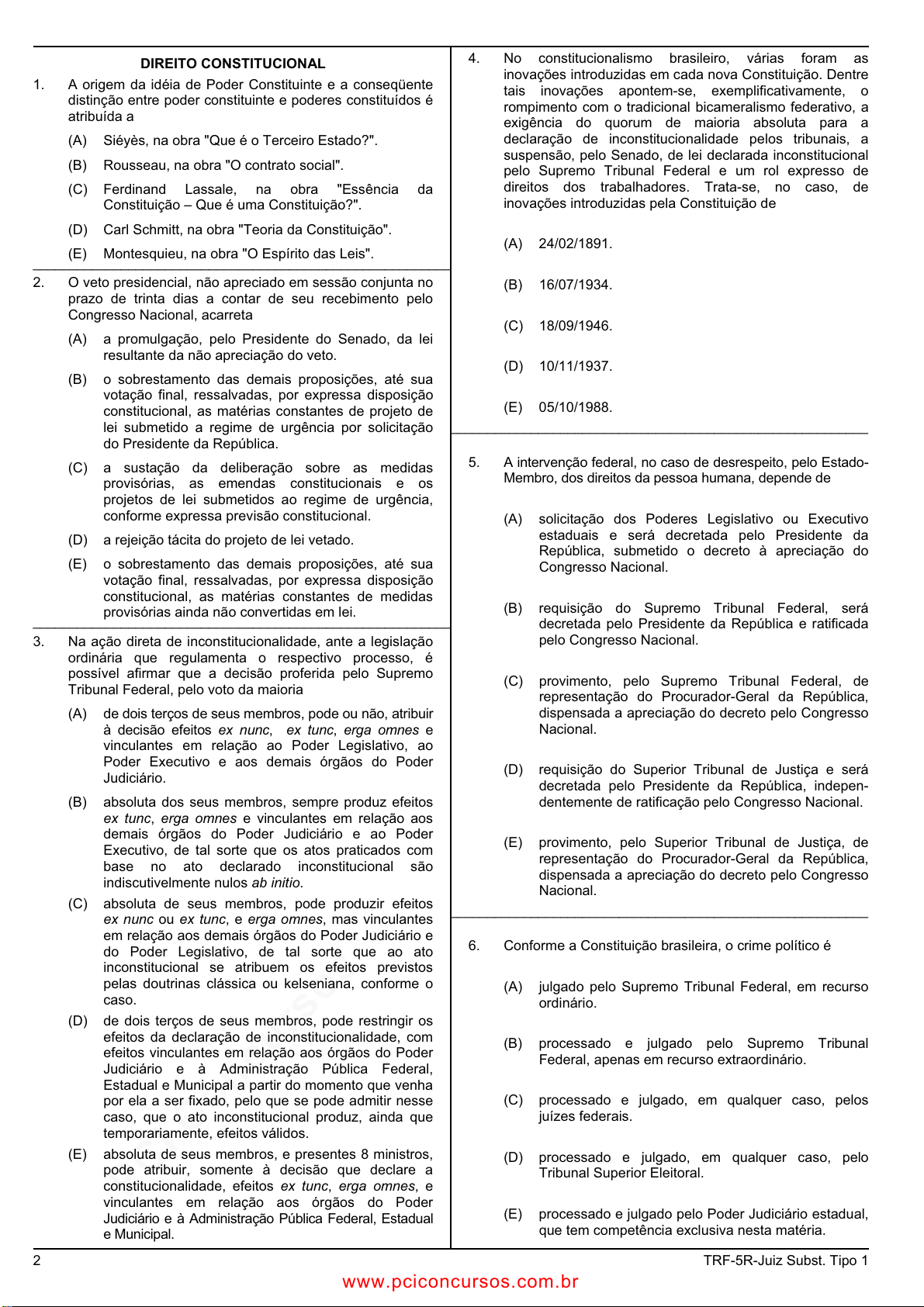 pcimarkpci MDAwMDowMDAwOjAwMDA6MDAwMDowMDAwOmZmZmY6YjViZjozZTlj:U3VuLCAyMyBNYXIgMjAyNSAwNTowOToxMiAtMDMwMA== www.pciconcursos.com.br 23/5/2008 - 4:58 2 TRF-5R-Juiz Subst. Tipo 1 DIREITO CONSTITUCIONAL 1. A origem da idéia de Poder Constituinte e a conseqüente distinção entre poder constituinte e poderes constituídos é atribuída a (A)) Siéyès, na obra "Que é o Terceiro Estado?". (B) Rousseau, na obra "O contrato social". (C) Ferdinand Lassale, na obra "Essência da Constituição – Que é uma Constituição?". (D) Carl Schmitt, na obra "Teoria da Constituição". (E) Montesquieu, na obra "O Espírito das Leis". _________________________________________________________ 2. O veto presidencial, não apreciado em sessão conjunta no prazo de trinta dias a contar de seu recebimento pelo Congresso Nacional, acarreta (A) a promulgação, pelo Presidente do Senado, da lei resultante da não apreciação do veto. (B) o sobrestamento das demais proposições, até sua votação final, ressalvadas, por expressa disposição constitucional, as matérias constantes de projeto de lei submetido a regime de urgência por solicitação do Presidente da República. (C) a sustação da deliberação sobre as medidas provisórias, as emendas constitucionais e os projetos de lei submetidos ao regime de urgência, conforme expressa previsão constitucional. (D) a rejeição tácita do projeto de lei vetado. (E)) o sobrestamento das demais proposições, até sua votação final, ressalvadas, por expressa disposição constitucional, as matérias constantes de medidas provisórias ainda não convertidas em lei. _________________________________________________________ 3. Na ação direta de inconstitucionalidade, ante a legislação ordinária que regulamenta o respectivo processo, é possível afirmar que a decisão proferida pelo Supremo Tribunal Federal, pelo voto da maioria (A) de dois terços de seus membros, pode ou não, atribuir à decisão efeitos ex nunc, ex tunc, erga omnes e vinculantes em relação ao Poder Legislativo, ao Poder Executivo e aos demais órgãos do Poder Judiciário. (B) absoluta dos seus membros, sempre produz efeitos ex tunc, erga omnes e vinculantes em relação aos demais órgãos do Poder Judiciário e ao Poder Executivo, de tal sorte que os atos praticados com base no ato declarado inconstitucional são indiscutivelmente nulos ab initio. (C) absoluta de seus membros, pode produzir efeitos ex nunc ou ex tunc, e erga omnes, mas vinculantes em relação aos demais órgãos do Poder Judiciário e do Poder Legislativo, de tal sorte que ao ato inconstitucional se atribuem os efeitos previstos pelas doutrinas clássica ou kelseniana, conforme o caso. (D)) de dois terços de seus membros, pode restringir os efeitos da declaração de inconstitucionalidade, com efeitos vinculantes em relação aos órgãos do Poder Judiciário e à Administração Pública Federal, Estadual e Municipal a partir do momento que venha por ela a ser fixado, pelo que se pode admitir nesse caso, que o ato inconstitucional produz, ainda que temporariamente, efeitos válidos. (E) absoluta de seus membros, e presentes 8 ministros, pode atribuir, somente à decisão que declare a constitucionalidade, efeitos ex tunc, erga omnes, e vinculantes em relação aos órgãos do Poder Judiciário e à Administração Pública Federal, Estadual e Municipal. 4. No constitucionalismo brasileiro, várias foram as inovações introduzidas em cada nova Constituição. Dentre tais inovações apontem-se, exemplificativamente, o rompimento com o tradicional bicameralismo federativo, a exigência do quorum de maioria absoluta para a declaração de inconstitucionalidade pelos tribunais, a suspensão, pelo Senado, de lei declarada inconstitucional pelo Supremo Tribunal Federal e um rol expresso de direitos dos trabalhadores. Trata-se, no caso, de inovações introduzidas pela Constituição de (A) 24/02/1891. (B)) 16/07/1934. (C) 18/09/1946. (D) 10/11/1937. (E) 05/10/1988. _________________________________________________________ 5. A intervenção federal, no caso de desrespeito, pelo Estado- Membro, dos direitos da pessoa humana, depende de (A) solicitação dos Poderes Legislativo ou Executivo estaduais e será decretada pelo Presidente da República, submetido o decreto à apreciação do Congresso Nacional. (B) requisição do Supremo Tribunal Federal, será decretada pelo Presidente da República e ratificada pelo Congresso Nacional. (C)) provimento, pelo Supremo Tribunal Federal, de representação do Procurador-Geral da República, dispensada a apreciação do decreto pelo Congresso Nacional. (D) requisição do Superior Tribunal de Justiça e será decretada pelo Presidente da República, indepen- dentemente de ratificação pelo Congresso Nacional. (E) provimento, pelo Superior Tribunal de Justiça, de representação do Procurador-Geral da República, dispensada a apreciação do decreto pelo Congresso Nacional. _________________________________________________________ 6. Conforme a Constituição brasileira, o crime político é (A)) julgado pelo Supremo Tribunal Federal, em recurso ordinário. (B) processado e julgado pelo Supremo Tribunal Federal, apenas em recurso extraordinário. (C) processado e julgado, em qualquer caso, pelos juízes federais. (D) processado e julgado, em qualquer caso, pelo Tribunal Superior Eleitoral. (E) processado e julgado pelo Poder Judiciário estadual, que tem competência exclusiva nesta matéria. www.pciconcursos.com.br pcimarkpci MDAwMDowMDAwOjAwMDA6MDAwMDowMDAwOmZmZmY6YjViZjozZTlj:U3VuLCAyMyBNYXIgMjAyNSAwNTowOToxMiAtMDMwMA== www.pciconcursos.com.br 23/5/2008 - 4:58 TRF-5R-Juiz Subst. – Tipo 1 3 7. A cláusula do devido processo legal (A) sempre esteve presente, de modo expresso, em todas as constituições brasileiras, com o sentido formal e substancial de proteção dos direitos fundamentais. (B) foi introduzida, expressamente, no plano consti- tucional, pela Constitui