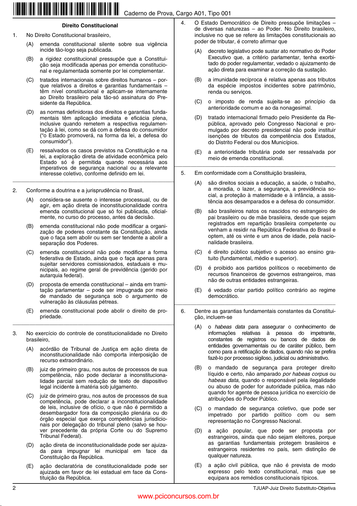 pcimarkpci MDAwMDowMDAwOjAwMDA6MDAwMDowMDAwOmZmZmY6YjViZjozZTlj:U3VuLCAyMyBNYXIgMjAyNSAwNTowNzoxNSAtMDMwMA== www.pciconcursos.com.br 2 TJUAP-Juiz Direito Substituto-Objetiva Direito Constitucional 1 . N o Direito C on stituc ion al brasileiro, (A) em en d a c on stituc ion al silen te sobre sua vig ê n c ia in c id e tã o-log o seja p ublic ad a. (B ) a rig id ez c on stituc ion al p ressup õ e q ue a C on stitui- ç ã o seja m od ific ad a ap en as p or em en d a c on stituc io- n al e reg ulam en tad a som en te p or lei c om p lem en tar. (C ) tratad os in tern ac ion ais sobre d ireitos h um an os – p or- q ue relativos a d ireitos e g aran tias fun d am en tais – tê m n ível c on stituc ion al e ap lic am -se in tern am en te ao Direito brasileiro p ela tã o-só assin atura d o Pre- sid en te d a R ep ú blic a. (D) as n orm as d efin id oras d os d ireitos e g aran tias fun d a- m en tais tê m ap lic aç ã o im ed iata e efic á c ia p len a, in c lusive q uan d o rem etem a resp ec tiva reg ulam en - taç ã o à lei, c om o se d á c om a d efesa d o c on sum id or (“o E stad o p rom overá , n a form a d a lei, a d efesa d o c on sum id or”). (E ) ressalvad os os c asos p revistos n a C on stituiç ã o e n a lei, a ex p loraç ã o d ireta d e ativid ad e ec on ô m ic a p elo E stad o só é p erm itid a q uan d o n ec essá ria aos im p erativos d e seg uran ç a n ac ion al ou a relevan te in teresse c oletivo, c on form e d efin id o em lei. _ _ _ _ _ _ _ _ _ _ _ _ _ _ _ _ _ _ _ _ _ _ _ _ _ _ _ _ _ _ _ _ _ _ _ _ _ _ _ _ _ _ _ _ _ _ _ _ _ _ _ _ _ _ _ _ _ 2. C on form e a d outrin a e a jurisp rud ê n c ia n o B rasil, (A) c on sid era-se ausen te o in teresse p roc essual, ou d e ag ir, em aç ã o d ireta d e in c on stituc ion alid ad e c on tra em en d a c on stituc ion al q ue só foi p ublic ad a, ofic ial- m en te, n o c urso d o p roc esso, an tes d a d ec isã o. (B ) em en d a c on stituc ion al n ã o p od e m od ific ar a org an i- zaç ã o d e p od eres c on stan te d a C on stituiç ã o, ain d a q ue o faç a sem abolir ou sem ser ten d en te a abolir a sep araç ã o d os Pod eres. (C ) em en d a c on stituc ion al n ã o p od e m od ific ar a form a fed erativa d e E stad o, ain d a q ue o faç a ap en as p ara sujeitar servid ores c om ission ad os, estad uais e m u- n ic ip ais, ao reg im e g eral d e p revid ê n c ia (g erid o p or autarq uia fed eral). (D) p rop osta d e em en d a c on stituc ion al – ain d a em tram i- taç ã o p arlam en tar – p od e ser im p ug n ad a p or m eio d e m an d ad o d e seg uran ç a sob o arg um en to d e vuln eraç ã o à s c lá usulas p é treas. (E ) em en d a c on stituc ion al p od e abolir o d ireito d e p ro- p ried ad e. _ _ _ _ _ _ _ _ _ _ _ _ _ _ _ _ _ _ _ _ _ _ _ _ _ _ _ _ _ _ _ _ _ _ _ _ _ _ _ _ _ _ _ _ _ _ _ _ _ _ _ _ _ _ _ _ _ 3 . N o ex erc íc io d o c on trole d e c on stituc ion alid ad e n o Direito brasileiro, (A) ac ó rd ã o d e Tribun al d e Justiç a em aç ã o d ireta d e in c on stituc ion alid ad e n ã o c om p orta in terp osiç ã o d e rec urso ex traord in á rio. (B ) juiz d e p rim eiro g rau, n os autos d e p roc essos d e sua c om p etê n c ia, n ã o p od e d ec larar a in c on stituc ion a- lid ad e p arc ial sem red uç ã o d e tex to d e d isp ositivo leg al in c id en te à m até ria sob julg am en to. (C ) juiz d e p rim eiro g rau, n os autos d e p roc essos d e sua c om p etê n c ia, p od e d ec larar a in c on stituc ion alid ad e d e leis, in c lusive d e ofíc io, o q ue n ã o é p erm itid o a d esem barg ad or fora d a c om p osiç ã o p len á ria ou d o ó rg ã o esp ec ial q ue ex erç a c om p etê n c ias jurisd ic io- n ais p or d eleg aç ã o d o tribun al p len o (salvo se h ou- ver p rec ed en te d a p ró p ria C orte ou d o Sup rem o Tribun al F ed eral). (D) aç ã o d ireta d e in c on stituc ion alid ad e p od e ser ajuiza- d a p ara im p ug n ar lei m un ic ip al em fac e d a C on stituiç ã o d a R ep ú blic a. (E ) aç ã o d ec larató ria d e c on stituc ion alid ad e p od e ser ajuizad a em favor d e lei estad ual em fac e d a C on s- tituiç ã o d a R ep ú blic a. 4 . O E stad o Dem oc rá tic o d e Direito p ressup õ e lim itaç õ es – d e d iversas n aturezas – ao Pod er. N o Direito brasileiro, in c lusive n o q ue se refere à s lim itaç õ es c on stituc ion ais ao p od er d e tributar, é c orreto afirm ar q ue (A) d ec reto leg islativo p od e sustar ato n orm ativo d o Pod er E x ec utivo q ue, a c rité rio p arlam en tar, ten h a ex orbi- tad o d o p od er reg ulam en tar, ved ad o o ajuizam en to d e aç ã o d ireta p ara ex am in ar a c orreç ã o d a sustaç ã o. (B ) a im un id ad e rec íp roc a é relativa ap en as aos tributos d a esp é c ie im p ostos in c id en tes sobre p atrim ô n io, ren d a ou serviç os. (C ) o im p osto d e ren d a sujeita-se ao p rin c íp io d a an teriorid ad e c om um e ao d a n on ag esim al. (D) tratad o in tern ac ion al firm ad o p elo Presid en te d a R e- p ú blic a, ap rovad o p elo C on g resso N ac ion al e p ro- m ulg ad o p or d ec reto p resid en c ial n ã o p od e in stituir isen ç õ es d e tributos d a c om p etê n c ia d os E stad os, d o Distrito F ed eral ou d os M un ic íp ios. (E ) a an teriorid ad e tributá ria p od e ser ressalvad a p or m eio d e em en d a c on stituc ion al. _ _ _ _ _ _ _ _ _ _ _ _ _ _ _ _ _ _ _ _ _ _ _ _ _ _ _ _ _ _ _ _ _ _ _ _ _ _ _ _ _ _ _ _ _ _ _ _ _ _ _ _ _ _ _ _ _ 5 . E m c on form id ad e c om a C on stituiç ã o brasileira, (A) sã o d ireitos soc iais a ed uc aç ã o, a saú d e, o trabalh o, a m orad ia, o lazer, a seg uran ç a, a p revid ê n c ia so- c ial, a p roteç ã o à m atern id ad e e à in fâ n c ia, a assis- tê n c ia aos d esam p arad os e a d efesa d o c on sum id or. (B ) sã o brasileiros n atos os n asc id os n o estran g eiro d e p ai brasileiro ou d e m ã e brasileira, d esd 