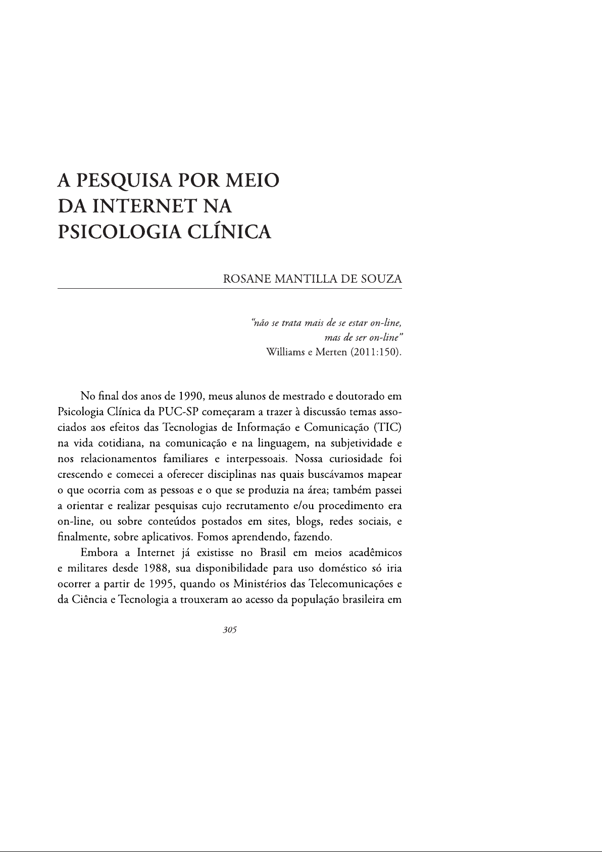 A PESQUISA POR MEIO DA INTERNET NA PSICOLOGIA CLÍNICA ROSANE MANTILLA DE SOUZA "não se trata mais de se estar on-line, mas de ser on-line" Williams e Merten (2011:150). No final dos anos de 1990, meus alunos de mestrado e doutorado em Psicologia Clínica da PUC-SP começaram a trazer à discussão temas asso- ciados aos efeitos das Tecnologias de Informação e Comunicação (TIC) na vida cotidiana, na comunicação e na linguagem, na subjetividade e nos relacionamentos familiares e interpessoais. Nossa curiosidade foi crescendo e comecei a oferecer disciplinas nas quais buscávamos mapear o que ocorria com as pessoas e o que se produzia na área; também passei a orientar e realizar pesquisas cujo recrutamento e/ou procedimento era on-line, ou sobre conteúdos postados em sites, blogs, redes sociais, e finalmente, sobre aplicativos. Fomos aprendendo, fazendo. Embora a Internet já existisse no Brasil em meios acadêmicos e militares desde 1988, sua disponibilidade para uso doméstico só iria ocorrer a partir de 1995, quando os Ministérios das Telecomunicações e da Ciência e Tecnologia a trouxeram ao acesso da população brasileira em 305306 ROSANE MANTILLA DE SOUZA geral. Ainda assim, a disseminação do uso só começou no ano seguinte (Rede Nacional de Ensino e Pesquisa), de modo que, diferentemente de outros países, no nosso país, os microcomputadores e a Internet entraram mais ou menos simultaneamente na casa dos brasileiros Leitão e Nicolaci- da-Costa, 2001). Os primeiros microcomputadores eram comparativamente muito mais caros e a internet muito menos acessível do que hoje. Embora produzisse a sensação de que tínhamos acesso a tudo, a busca online limitava-se a informações ou notícias e a interatividade ocorria pela troca de e-mail ou frequência às salas de "bate-papo". Apesar de chamados micro, os computadores eram comparativamente grandes (desktop), a conexão era por linha discada, o que impedia o uso conco- mitante do telefone (fixo); um download podia demorar horas, e a expressão normalmente usada era "entrar na internet", o que conotava a existência de contextos diversos, o real e o virtual. E ainda mais, a produção de material exigia softwares específicos e especialistas em programação gerando custos elevados. Essa primeira geração da Internet foi denominada Web 1.0 e seu usuário era basicamente um consumidor do conteúdo (Coutinho e Bottentuit Junior, 2007). Em torno de 2004 o que foi denominada Web 2.0 - a Internet como plataforma ou união de vários aplicativos passou a permitir que as pessoas produzissem facilmente seus próprios materiais e os publi- cassem na rede. O usuário da Web 2.0 passou a ser tanto consumidor quanto produtor da informação, o que tornou o ambiente cada vez mais dinâmico e colaborativo (Coutinho e Bottentuit Junior, 2007). A segunda geração da Internet (Web 2.0) trouxe consigo os blogs e congêneres, bem como as redes sociais. A diferenciação entre real e virtual tornou-se borrada. Deixamos de "entrar na internet" para "ser na internet" pois há ações, comportamentos e relações que só existem na rede. Atualmente estamos conectados todo o tempo (always on). Nossos aparelhos celulares, individuais e individualizados, não só permitem a busca instantânea de informações, de localizações, compras, pagamentos, etc., como a troca instantânea de mensagens, produção e compartilhamento de imagens, uso de aplicativos notícias, lazer e promoção de saúde.A PESQUISA POR MEIO DA INTERNET NA PSICOLOGIA CLÍNICA 307 Em pouco mais de duas décadas, as TICs transformaram alguns aspectos básicos da existência humana: a identidade, a sociabilidade e a pertinência; os limites do que é público e o que é privado; a formação, manutenção e rompimento de vínculos; o espaço, o tempo e o ritmo do viver e do vivido; os relacionamentos interpessoais, conjugais e familiares; além do fazer político. Todas estas mudanças precisaram entrar na pauta de trabalho dos psicólogos clínicos e dos pesquisadores clínicos. Embora possamos ser mais ou menos inclinados à incorporação das TICs no cotidiano, embora possamos desde demonizá-las a tornar- mo-nos delas dependentes, "navegar é preciso" e o cenário de produção de conhecimento psicológico vem mudando rapidamente. Sassenberg e Ditrich (2019) analisaram as publicações em quatro periódicos de grande impacto em Psicologia Social de 2009 a 2018. Embora não seja em Psicologia Clínica, observando as dissertações e teses postadas na Capes na última década identificamos algo semelhante na nossa área: há um uso crescente de grandes amostras e de procedimentos disponibilizadas on-line principalmente com questionários e escalas. Como este processo vem sendo conduzido? Metodologia de pesquisa é disciplina obrigatória da graduação e da pós-graduação em psicologia. Há grandes manuais metodológicos que são reeditados com poucas modificações ao longo de décadas, mas poucos analisam as particularidades da pesquisa realizada por meio da internet. Frequentemente indicam como fazer revisões de literatura e destacam os programas estatísticos mais rápidos, ou de análises de texto cada vez mais sofisticadas utilizando programas de computador. Mas, podemos transpor as abordagens metodológicas do mundo face-a-face diretamente para o mundo on-line? Riley et al. (2013) comentam que se considerarmos o período de tempo entre a proposição de uma pesquisa e sua publicação (sem considerar quando exige follow-up) leva cerca de cinco anos e meio. Durante este período a mudança tecnológica pode tornar um trabalho obsoleto. Só para ilustrar, quem se lembra do Orkut? Há jovens que nem sabem o que era. Mas, há várias pesquisas, dissertações e teses que analisaram postagens do Orkut. Há artigos que tratam da captação de308 ROSANE MANTILLA DE SOUZA participantes via e-mail dos idos dos computadores (desk ou laptop), mas hoje a maioria das pessoas 