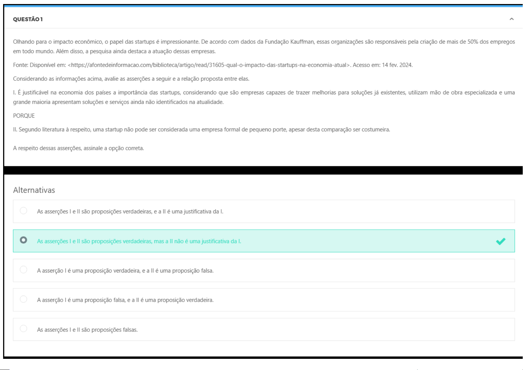 Olhando para o impacto econômico, o papel das startups é impressionante. De acordo com dados da Fundação Kauffman, essas organizações são responsáveis pela criação de mais de 50% dos empregos em todo mundo. Além disso, a pesquisa ainda destaca a atuação dessas empresas. Fonte: Disponível Acesso em: 14 fev. 2024. Considerando as informações acima, avalie as asserções a seguir e a relação proposta entre elas. I. É justificável na economia dos países a importância das startups, considerando que são empresas capazes de trazer melhorias para soluções já existentes, utilizam mão de obra especializada e uma grande maioria apresentam soluções e serviços ainda não identificados na atualidade. PORQUE II. Segundo literatura à respeito, uma startup não pode ser considerada uma empresa formal de pequeno porte, apesar desta comparação ser costumeira. A respeito dessas asserções, assinale a opção correta. Alternativas As asserções e são proposições verdadeiras, e a é uma justificativa da As asserções e são proposições verdadeiras, mas a não é uma justificativa da A asserção é uma proposição verdadeira, e a é uma proposição falsa. A asserção é uma proposição falsa, e a é uma proposição verdadeira. As asserções e são proposições falsas.QUESTÃO 2 Existem algumas diferenças entre realizar gestão da inovação ou inovar na gestão de uma empresa. Na primeira situação, o gestor deve criar um ambiente, ou um ecossistema, que permita que a inovação seja aplicada em todos seus aspectos tanto na inovação incremental, na radical quanto na disruptiva (ZEN, 2017). Sullivan e Zutavern (2017) afirmam que o futuro da gestão passa por uma parceria harmoniosa entre a inteligência da máquina, que denominamos inteligência artificial, e intelecto do ser humano, sociedade que determinará o modelo de negócios dos próximos tempos. Fonte: adaptada de: ZUCCO, A. et al. Mentalidade Criativa e Empreendedora. Indaial, SC: Arqué, 2023. Diante do exposto, analise alguns dos benefícios que os gestores podem conseguir, utilizando inteligência artificial em suas atividades administrativas: I. Facilita aprofundamento das pesquisas de mercado. II. Ressalta engajamento e fidelização dos clientes. III. Aumenta a produtividade das equipes. IV. Diminui a quantidade de funcionários. V. Minimiza, de forma considerável, os erros. É correto o que se afirma em: Alternativas e III, apenas. I, III e IV, apenas. II, III e V, apenas. II, III e V, apenas. I, II, III, IV e V.QUESTÃO 3 Vamos diferenciar a atividade empreendedora e a atividade empresarial? Para o senso comum, as palavras empreendedor e empresário podem significar a mesma coisa ou serem sinônimas, porém, para muitos autores, são coisas distintas. Um empreendedor pode não ser um empresário, e um empresário pode não ser um empreendedor. Fonte: ZUCCO, A. et al. Mentalidade Criativa e Empreendedora. Indaial, SC: Arqué, 2023. Em relação ao conceito de Empreendedorismo, avalie as afirmações abaixo: I. Muitos autores trazem diversos conceitos na busca da explicação da atividade do empreendedorismo. A maioria deles converge como o empreendedorismo sendo um processo de criar e executar um plano de negócio. II. Empreender envolve também a capacidade de gerir recursos limitados, criar um ambiente de trabalho eficaz, encontrando novos meios de crescimento empresarial. III. Outro conceito apresenta empreendedorismo como a habilidade de criar e constituir algo a partir de muito pouco ou de quase nada. É correto o que se afirma em: Alternativas I, apenas. II, apenas. e II, apenas.QUESTÃO 4 A criatividade, no mundo dos negócios, é uma das habilidades mais valorizadas. De acordo com um levantamento da Consultoria McKinsey, até 2030, a demanda por profissionais criativos aumentará em até 40% no Brasil, na Europa e nos Estados Unidos. Afinal, embora a tecnologia esteja em franco desenvolvimento, a inventividade humana faz parte desse processo e potencializa as soluções diante de demandas mais complexas e abstratas. Quando surge a necessidade de inovar e aprimorar produtos, processos ou serviços, a criatividade é a base para propor ideias que vão além do No mundo do empreendedorismo, ser criativo é um diferencial competitivo diante do fácil acesso a insumos, ferramentas e estrutura de negócio. em: 4 fev. 2025. Com base no exposto, sobre o empreendedorismo criativo, analise as afirmativas a seguir: I. líder precisa desenvolver competências e habilidades para estimular lado criativo na equipe. II. Valoriza a competição entre as equipes, para ver quem desenvolve a melhor ideia. III. Busca incluir a criatividade, exclusivamente na área de marketing da empresa. IV. Para estimular a criatividade, é importante ter um ambiente que acolha a diversidade. É correto que se afirma em: Alternativas e II, apenas. le IV, apenas. e III, apenas. III e IV, apenas.QUESTÃO 5 João é um empreendedor que faturava R$ 70.000 por ano como MEI e decidiu migrar para o Simples Nacional para expandir seu negócio. O novo regime permite um limite de faturamento de até R$ 4,8 milhões anuais, mas também traz novas obrigações tributárias e maior complexidade administrativa. Elaborado pelo professor. Com base no exposto, qual a lógica mais apropriada para João decidir se a migração é vantajosa? Alternativas Avaliar apenas a redução de impostos na nova categoria. Desistir da expansão e permanecer como MEI para evitar novos custos. Focar exclusivamente no aumento de clientes, sem considerar impostos. Expandir faturamento sem planejamento, já que novo limite é muito alto. Comparar o aumento do limite de faturamento com os custos e complexidade tributária do Simples Nacional.QUESTÃO 6 Historicamente, os modelos de gestão foram se adaptando às exigências e ao dinamismo dos mercados que cada vez mais exigem rapidez nas soluções oferecidas pelas empresas. A gestão compartilhada promove 