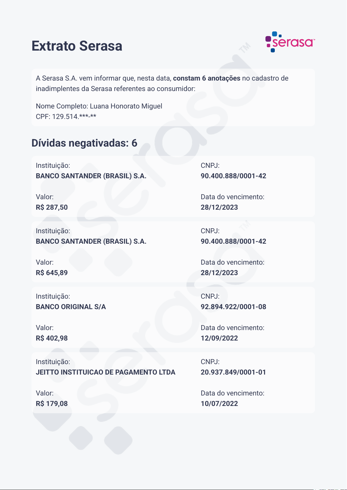 Extrato Serasa A Serasa S.A. vem informar que, nesta data, constam 6 anotações no cadastro de inadimplentes da Serasa referentes ao consumidor: Nome Completo: Luana Honorato Miguel CPF: 129.514.***-** Dívidas negativadas: 6 Instituição: BANCO SANTANDER (BRASIL) S.A. Valor: R$ 287,50 CNPJ: 90.400.888/0001-42 Data do vencimento: 28/12/2023 Instituição: BANCO SANTANDER (BRASIL) S.A. Valor: R$ 645,89 CNPJ: 90.400.888/0001-42 Data do vencimento: 28/12/2023 Instituição: BANCO ORIGINAL S/A Valor: R$ 402,98 CNPJ: 92.894.922/0001-08 Data do vencimento: 12/09/2022 Instituição: JEITTO INSTITUICAO DE PAGAMENTO LTDA Valor: R$ 179,08 CNPJ: 20.937.849/0001-01 Data do vencimento: 10/07/2022 Instituição: ATIVOS S.A. SECURITIZADORA DE CREDITOS FINANCEIROS Valor: R$ 7.202,93 CNPJ: 05.437.257/0001-29 Data do vencimento: 08/07/2022 Instituição: SOCIEDADE DE ENSINO SUPERIOR ESTACIO DE SA LTDA Valor: R$ 253,91 CNPJ: 34.075.739/0001-84 Data do vencimento: 10/06/2022 Protestos: 0 Nenhum protesto pendente Cheques sem fundo: 0 Nenhum cheque sem fundo pendente Ações judiciais: 0 Nenhuma ação judicial pendente Falências: 0 Nenhuma participação em falência Este extrato foi emitido em 04/02/2025 às 16:03:38 do horário de Brasília e está disponível para consulta no endereço de internet https://www.serasa.com.br/area- cliente/meu-cpf/pendencias/extrato. Código de autenticidade: 2JYL.TKFS.OZEH.WMLD O extrato tem as informações que constam no Cadastro de Inadimplentes da Serasa no momento da consulta. A Serasa Experian não possui qualquer atuação sobre o uso do extrato ou sobre qualquer processo de concessão de crédito ou realização de negócio. A empresa credora é responsável pela solicitação de baixa das dívidas negativadas em até 5 dias úteis após a confirmação do pagamento. Após esse prazo, se a dívida ainda estiver anotada, ou no caso de não reconhecimento de alguma das informações do extrato, deve-se entrar em contato diretamente com a empresa ou com a Serasa por meio do telefone 3003 6300, de segunda a sexta, das 8h às 20h. Extrato Serasa