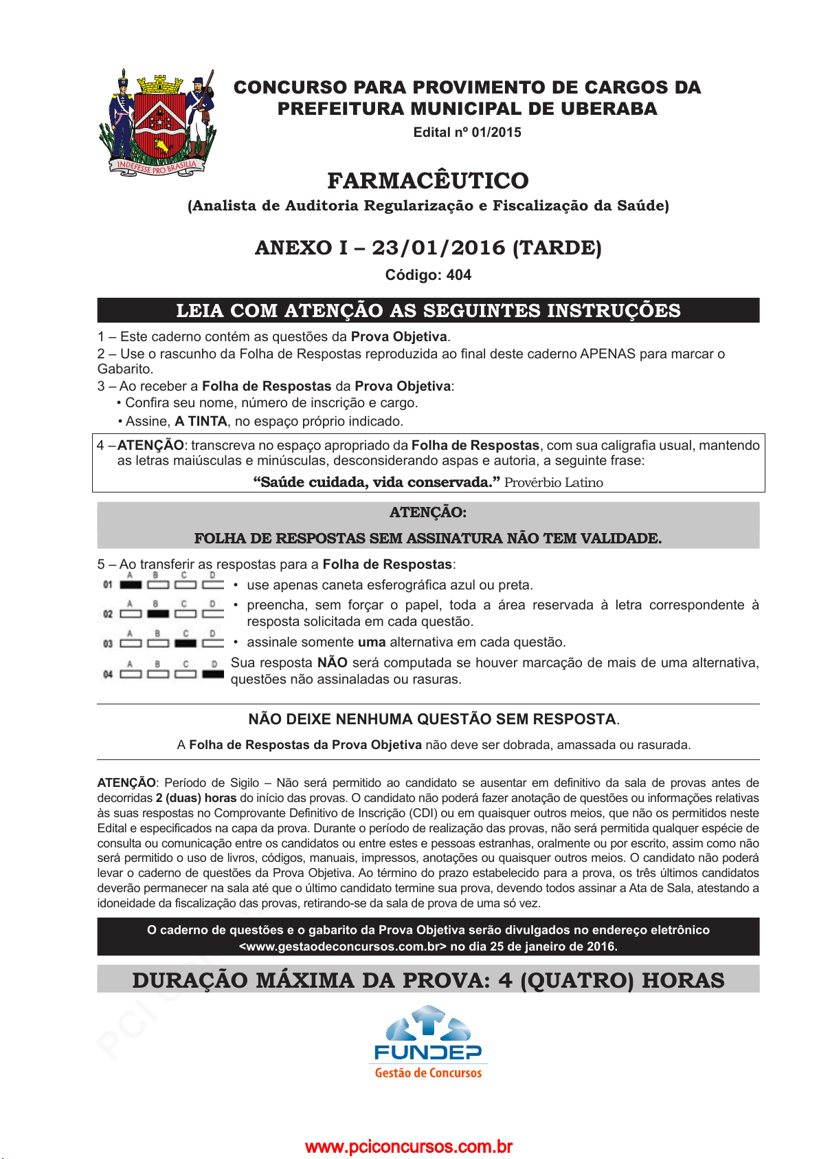 pcimarkpci MjgwNDoxZTY4OjgyMDE6MzI5ODo4MGRkOjg5ZTM6ZjgxNTozZTMx:TW9uLCAyNCBNYXIgMjAyNSAyMDoyMTowNyAtMDMwMA== www.pciconcursos.com.br CONCURSO PARA PROVIMENTO DE CARGOS DA PREFEITURA MUNICIPAL DE UBERABA Edital nº 01/2015 FARMACÊUTICO (Analista de Auditoria Regularização e Fiscalização da Saúde) ANEXO I – 23/01/2016 (TARDE) Código: 404 LEIA COM ATENÇÃO AS SEGUINTES INSTRUÇÕES 1 – Este caderno contém as questões da Prova Objetiva. 2 – Use o rascunho da Folha de Respostas reproduzida ao final deste caderno APENAS para marcar o Gabarito. 3 – Ao receber a Folha de Respostas da Prova Objetiva: • Confira seu nome, número de inscrição e cargo. • Assine, A TINTA, no espaço próprio indicado. 4 – ATENÇÃO: transcreva no espaço apropriado da Folha de Respostas, com sua caligrafia usual, mantendo as letras maiúsculas e minúsculas, desconsiderando aspas e autoria, a seguinte frase: “Saúde cuidada, vida conservada.” Provérbio Latino ATENÇÃO: FOLHA DE RESPOSTAS SEM ASSINATURA NÃO TEM VALIDADE. 5 – Ao transferir as respostas para a Folha de Respostas: • use apenas caneta esferográfica azul ou preta. • preencha, sem forçar o papel, toda a área reservada à letra correspondente à resposta solicitada em cada questão. • assinale somente uma alternativa em cada questão. Sua resposta NÃO será computada se houver marcação de mais de uma alternativa, questões não assinaladas ou rasuras. NÃO DEIXE NENHUMA QUESTÃO SEM RESPOSTA. A Folha de Respostas da Prova Objetiva não deve ser dobrada, amassada ou rasurada. ATENÇÃO: Período de Sigilo – Não será permitido ao candidato se ausentar em definitivo da sala de provas antes de decorridas 2 (duas) horas do início das provas. O candidato não poderá fazer anotação de questões ou informações relativas às suas respostas no Comprovante Definitivo de Inscrição (CDI) ou em quaisquer outros meios, que não os permitidos neste Edital e especificados na capa da prova. Durante o período de realização das provas, não será permitida qualquer espécie de consulta ou comunicação entre os candidatos ou entre estes e pessoas estranhas, oralmente ou por escrito, assim como não será permitido o uso de livros, códigos, manuais, impressos, anotações ou quaisquer outros meios. O candidato não poderá levar o caderno de questões da Prova Objetiva. Ao término do prazo estabelecido para a prova, os três últimos candidatos deverão permanecer na sala até que o último candidato termine sua prova, devendo todos assinar a Ata de Sala, atestando a idoneidade da fiscalização das provas, retirando-se da sala de prova de uma só vez. O caderno de questões e o gabarito da Prova Objetiva serão divulgados no endereço eletrônico no dia 25 de janeiro de 2016. DURAÇÃO MÁXIMA DA PROVA: 4 (QUATRO) HORAS www.pciconcursos.com.brwww.pciconcursos.com.br pcimarkpci MjgwNDoxZTY4OjgyMDE6MzI5ODo4MGRkOjg5ZTM6ZjgxNTozZTMx:TW9uLCAyNCBNYXIgMjAyNSAyMDoyMTowNyAtMDMwMA== www.pciconcursos.com.br ATENÇÃO Sr.(a) Candidato(a), Antes de começar a fazer a prova, confira se este caderno contém, ao todo, 40 (quarenta) questões de múltipla escolha, cada uma constituída de 4 (quatro) alternativas de respostas, assim distribuídas: 10 (dez) questões de Português, 5 (cinco) questões de Atualidades, 5 (cinco) questões de Legislação e 20 (vinte) questões de Conhecimentos Específicos, todas perfeitamente legíveis. Havendo algum problema, informe imediatamente ao aplicador de provas para que ele tome as providências necessárias. Caso não observe essa recomendação, não lhe caberá qualquer reclamação ou recursos posteriores. www.pciconcursos.com.brwww.pciconcursos.com.br pcimarkpci MjgwNDoxZTY4OjgyMDE6MzI5ODo4MGRkOjg5ZTM6ZjgxNTozZTMx:TW9uLCAyNCBNYXIgMjAyNSAyMDoyMTowNyAtMDMwMA== www.pciconcursos.com.br 1 PORTUGUÊS QUESTÃO 1 Leia o e-mail a seguir, enviado por um funcionário ao seu setor de trabalho. Boa tarde, segue em anexo o relatório da última reunião e a sua ata. Se houverem dúvidas estou a disposição. Atenciosamente. Assinale a alternativa em que a reescrita desse e-mail está adequada à norma padrão. A) Boa tarde, seguem em anexo o relatório da última reunião e a sua ata. Se houverem dúvidas, estou à disposição. Atenciosamente. B) Boa tarde, segue em anexo, o relatório da última reunião e a sua ata. Se houverem dúvidas, estou a disposição. Atenciosamente. C) Boa tarde, seguem, em anexo, o relatório da última reunião e a sua ata. Se houver dúvidas, estou à disposição. Atenciosamente. D) Boa tarde, segue, em anexo, o relatório da última reunião e a sua ata. Se houver dúvidas, estou a disposição. Atenciosamente. QUESTÃO 2 Analise os trechos textuais a seguir. I. Meu cheiro é de cravo Minha cor de canela A minha bandeira É verde e amarela Pimenta de cheiro Cebola em rodela Um beijo na boca Feijão na panela Gabriela.... “Gabriela” – Tom Jobim II. Me ame devagarinho Sem fazer nenhum esforço Tô doido por seu carinho. “Maçã do rosto” – Lenine III. E no salão social; Festas que lembram velório. Meia dúzia de parentes; E a panelinha do escritório. “Paradoxo” – Gabriel, o pensador A comparação pode ser feita de forma explícita ou implícita. Nesse contexto, há comparação nos trechos: A) I e II, apenas. B) I e III, apenas. C) II e III, apenas. D) I, II e III. INSTRUÇÃO: Leia o texto a seguir para responder às questões de 3 a 7. O homem que sabe Para Anatol Rosenfeld, a concretização de muitas ideias kantianas apenas esboçadas coube a Schiller, especialmente no domínio da estética. O homem, pensa Friedrich Schiller, é determinado pelas forças da natureza e, na grande maioria das vezes, perde para ela. A única liberdade humana consiste em não se deixar escravizar, o que implica exercer o senso moral por meio da linguagem e do pensamento. A capacidade humana de criar valores representa o domínio próprio do homem; eles são o modo