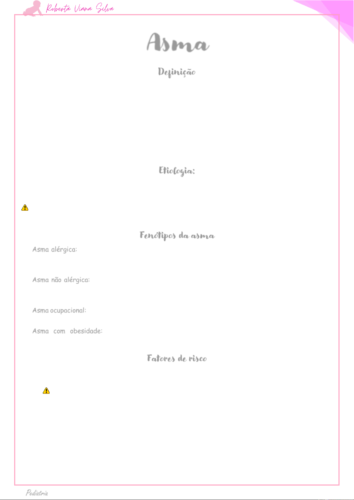 1 Pediatria Asma Definição Doença heterogênea, geralmente caracterizada por inflamação crônica das vias aéreas. É definida pela história de sintomas respiratórios, como sibilância, falta de ar, aperto no peito e tosse, que vão variar no tempo e intensidade conforme a limitação do fluxo aéreo expiratório. Geralmente vai ter um quadro de hiperresponsividade/inflamação das vias aéreas. Os sintomas podem resolver espontaneamente ou em resposta à medicação, podendo estar assintomático por semanas ou meses. Por outro lado, os pacientes podem apresentar crises ou exarcebações que podem ser fatais. Etiologia: Não possui uma causa clara, mas sabe-se que essa inflamação crônica gera hipersensibilidade a diferentes tipos de estímulos, desencadeando o broncoespasmo. Processo crônico inflamatório → remodelamento brônquico → alteração irreversível da estrutura pulmonar → obstrução fixa do fluxo aéreo Fenótipos da asma 1. Asma alérgica: forma mais comum. Geralmente, inicia na infância. Associado a história pessoal ou familiar de atopia, bem como à predisposição genética a uma resposta de hipersensibilidade tipo 1 ou imediata. A via aérea é infiltrada de eosinófilos e tem boa resposta ao corticoide inalatório. 2. Asma não alérgica: geralmente vai iniciar na vida adulta, associado a pólipo nasal ou sinusite, sem sinais de atopia. A invasão da via aérea pode ser por neutrófilos ou eosinófilos. Responde mal ao corticoide inalatório. 3. Asma ocupacional: devido a exposições no trabalho. Deve ser um diagnóstico diferencial em pacientes com asma de início tardio. 4. Asma com obesidade: obesos tem sintomas respiratórios proeminentes e pouca inflamação eosinofílica das vias aéreas. Fatores de risco → Fatores genéticos e história familiar → Atopia: principal fator de risco para o desenvolvimento da asma. Tríade atópica: dermatite atópica → rinite alérgica →asma. (Marcha atópica) → Alérgenos: ácaros de poeira, baratas, fungos, alérgenos de gato e cachorro → Obesidade → Fatores ocupacionais: enfermagem, profissionais de limpeza e trabalhos que possam estar expostos a acidentes inalatórios. → Exposição pré-natal ao tabagismo materno → Ingesta elevada de açúcar → Medicamentos durante a gravidez, como paracetamol → Prematuridade → Crianças não amamentada 2 Pediatria → Agentes infecciosos Quadro clínico e diagnóstico Tosse Predominantemente seca, sendo mais comum pela manhã e à noite. Suspeitar em casos de tosse persistente ou que piora durante exercício ou riso. Em > 3 anos → asma é a principal causa de tosse crônica Sibilos É produzido quando o ar entra pela via estreita → geralmente são sibilos generalizados, podendo ser apenas expiratórios. Tórax silencioso em contexto de exacerbação da asma = grave limitação do fluxo aéreo. Dispneia O desconforto respiratório torna-se evidente nas exacerbações, podendo ser notado retrações torácicas, gemência, batimento de asa de nariz, retração de fúrcula e taquipneia. Aperto no peito (opressão torácica) Tríade clássica: tosse, dispneia e sibilância. Exacerbação da asma = aumento progressivo nos sintomas + perda progressiva da função pulmonar, sob risco de causar insuficiência respiratória. Exame físico: procurar sinais de atopia. Diagnóstico em crianças ≥ 6 anos Provável asma: paciente com tosse, dor no peito, dispneia e sibilância que variam de frequência e intensidade, pioram pela manhã e à noite, bem como são desencadeados por frio, exercício físico, infecções virais, exposição a alérgenos... A confirmação do diagnóstico é baseada em 3 elementos: 1. Confirmação de limitação variável do fluxo aéreo expiratório (por espirometria, se possível) 2. Documentação de obstrução reversível 3. Exclusão de diagnósticos alternativos Espirometria normal não exclui diagnóstico de asma. ❖ Diagnóstico funcional Feito através da espirometria e do pico de fluxo expiratório (PFE). Espirometria: Deve ser feita antes e após uso de broncodilatador. Aumento após uso de broncodilatador do volume expiratório forçado no primeiro segundo (VEF1) é um critério diagnóstico de asma. Capacidade vital forçada (CVF) → está reduzida 3 Pediatria Índice Tifffenau (relação VEF1/CVF) → reduzido pois o VEF1 diminui muito mais que a CVF. ( 12% constitui um defeito pulmonar obstrutivo reversível e apoia o diagnóstico de asma. Pico de fluxo expiratório (PFE) Medido por um aparelho portátil, é um parâmetro menos fidedigno que o VEF1. Pode ser mais útil para monitorar sintomas de um paciente e a resposta à terapia ao longo tempo. ❖ Diagnóstico de alergia Pode ser confirmado com a determinação da IgE específica → pelo prick test (teste cutâneo) como pelo in vitro (dosagem sérica de IgE). Exames de imagem só devem ser solicitados se suspeita de complicações ou diagnósticos diferenciais. Diagnóstico para crianças com idade 10 dias durante infecção de vias aéreas superiores; > 3 episódios/ano ou episódios severos e/ou piora durante a noite; sintomas quando brinca ou quando dá risadas; sensibilização alérgica, dermatite atópica, alergia alimentar ou história familiar. Avaliação da asma Classificação do controle da asma em ≥ 6 anos. Pode ser classificada em: controlada, parcialmente controlada e não controlada; de acordo com a sintomatologia do paciente e uso de medicação de resgaste nas últimas 4 semanas. Tratamento Medidas não farmacológicas: Manter o ambiente limpo, arejado e livre de mofo Não varrer a casa ou tirar poeira dos móveis Trocar constatemente roupas de cama e banho Usar capa protetora nos travesseiros e colchoes. 4 Pediatria ❖ Medicações de controle Usadas para diminuir a inflamação causada pela asma, controlar sintomas e reduzir riscos futuros Principal droga: corticoide inalatório ❖ Medicações de resgate: Usadas na exacerbação de as