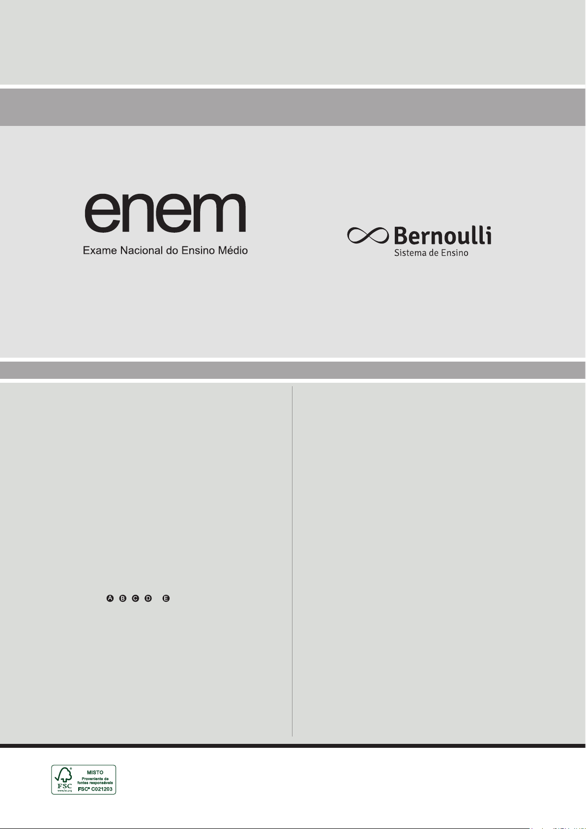 PROVA DE CIÊNCIAS DA NATUREZA E SUAS TECNOLOGIAS PROVA DE MATEMÁTICA E SUAS TECNOLOGIAS 1 Este CADERNO DE QUESTÕES contém 90 questões numeradas de 91 a 180, dispostas da seguinte maneira: a. as questões de número 91 a 135 são relativas à área de Ciências da Natureza e suas Tecnologias; b. as questões de número 136 a 180 são relativas à área de Matemática e suas Tecnologias. 2 Confira se o seu CADERNO DE QUESTÕES contém a quantidade de questões e se essas questões estão na ordem mencionada na instrução anterior. Caso o caderno esteja incompleto, tenha qualquer defeito ou apresente divergência, comunique ao aplicador da sala para que ele tome as providências cabíveis. 3 Escreva e assine seu nome nos espaços próprios do CARTÃO-RESPOSTA com caneta esferográfica de tinta preta. 4 Não dobre, não amasse nem rasure o CARTÃO-RESPOSTA, pois ele não poderá ser substituído. 5 Para cada uma das questões objetivas, são apresentadas 5 opções identificadas com as letras , , , e . Apenas uma responde corretamente à questão. 6 Use o código presente nesta capa para preencher o campo correspondente no CARTÃO-RESPOSTA. 7 Com seu RA (Registro Acadêmico), preencha o campo correspondente ao código do aluno. Se o seu RA não apresentar 7 dígitos, preencha os primeiros espaços e deixe os demais em branco. 8 No CARTÃO-RESPOSTA, preencha todo o espaço destinado à opção escolhida para a resposta. A marcação em mais de uma opção anula a questão, mesmo que uma das respostas esteja correta. 9 O tempo disponível para estas provas é de cinco horas. 10 Reserve os 30 minutos finais para marcar seu CARTÃO-RESPOSTA. Os rascunhos e as marcações assinaladas no CADERNO DE QUESTÕES não serão considerados na avaliação. 11 Quando terminar as provas, acene para chamar o aplicador e entregue este CADERNO DE QUESTÕES e o CARTÃO-RESPOSTA. 12 Você poderá deixar o local de prova somente após decorridas duas horas do início da aplicação e poderá levar seu CADERNO DE QUESTÕES ao deixar em definitivo a sala de provas nos últimos 30 minutos que antecedem o término das provas. 13 Você será excluído do Exame, a qualquer tempo, no caso de: a. prestar, em qualquer documento, declaração falsa ou inexata; b. agir com incorreção ou descortesia para com qualquer participante ou pessoa envolvida no processo de aplicação das provas; c. perturbar, de qualquer modo, a ordem no local de aplicação das provas, incorrendo em comportamento indevido durante a realização do Exame; d. se comunicar, durante as provas, com outro participante verbalmente, por escrito ou por qualquer outra forma; e. portar qualquer tipo de equipamento eletrônico e de comunicação durante a realização do Exame; f. utilizar ou tentar utilizar meio fraudulento, em benefício próprio ou de terceiros, em qualquer etapa do Exame; g. utilizar livros, notas ou impressos durante a realização do Exame; h. se ausentar da sala de provas levando consigo o CADERNO DE QUESTÕES antes do prazo estabelecido e / ou o CARTÃO-RESPOSTA a qualquer tempo. LEIA ATENTAMENTE AS INSTRUÇÕES SEGUINTES *de acordo com o horário de Brasília 2024 Simulado 0 – Prova II EXAME NACIONAL DO ENSINO MÉDIO CIÊNCIAS DA NATUREZA E SUAS TECNOLOGIAS Questões de 91 a 135 QUESTÃO 91 O fantasma de Pepper é uma das ilusões de óptica mais conhecidas em todo o mundo. Baseado na projeção da imagem de um objeto oculto do observador, através de uma placa de vidro plana inclinada em 45º, o funcionamento do aparato é semelhante ao que se observa quando se está à noite em um quarto iluminado olhando através da vidraça de uma janela para um quintal escuro. As imagens dos objetos bastante iluminados no quarto parecem flutuar no escuro do quintal. Na versão original levada aos palcos no século XIX pelo professor John Henry Pepper, a imagem de um fantasma era produzida com o auxílio de uma espécie de projetor colocado no piso inferior do teatro, como mostra a figura. MEDEIROS, A. A História e a Física do Fantasma de Pepper. Caderno Brasileiro de Ensino de Física, v. 23, n. 3, p. 329-344, 2006 (Adaptação). Na ilusão de óptica descrita, a imagem formada do fantasma é: A. Real, maior e direta. B. Virtual, igual e direta. C. Virtual, menor e direta. D. Real, igual e invertida. E. Virtual, igual e invertida. QUESTÃO 92 O cimento é um material muito utilizado na construção civil e a sua formulação é composta majoritariamente de óxidos metálicos, sendo que o óxido de cálcio compõe 90% desse material. O óxido de cálcio é obtido a partir da calcinação da calcita (CaCO3), um mineral cuja pureza é igual a 85%. A reação de calcinação está representada a seguir: CaCO3(s) → CaO(s) + CO2(g) 63CQ EZ6V Considerando que o rendimento dessa reação é de 90%, a quantidade de calcita, em tonelada, que deve ser extraída para produzir uma tonelada de cimento é de, aproximadamente, Dados: Massas molares em g.mol–1: C = 12; O = 16; Ca = 40. A. 1,4. B. 1,6. C. 1,8. D. 2,1. E. 2,2. QUESTÃO 93 Olhe aí a palafita crescendo sobre a maré. O homem que nela habita caranguejo ou peixe é. Caranguejo que se irmana com os bichos dos lamaçais, na condição desumana de caminhar para trás, [...] Caranguejo ou peixe, o fato é que o homem posto na lama não sabe o seu nome exato e também ninguém o chama, nem o batiza de novo com esse sal de maré. Não se sabe de que povo nem de que raça ele é, ali entre vida e morte, caranguejo ou peixe ou nada do que seja fraco ou forte na maré, sua enteada, mãe segunda que o cativa, que como filho o adota, para a solidão nativa mar sem porto e sem rota. CHAGAS, J. Antologia poética. Rio de Janeiro: Editora Topbooks, 1998. Considerando os fenômenos naturais descritos pelo poema, a vegetação característica desse bioma é A. caducifólia, modificada pela sazonalidade. B. xerófita, resistente a temperaturas elevadas. C. arbustiva, limitada pela escassez de nutriente