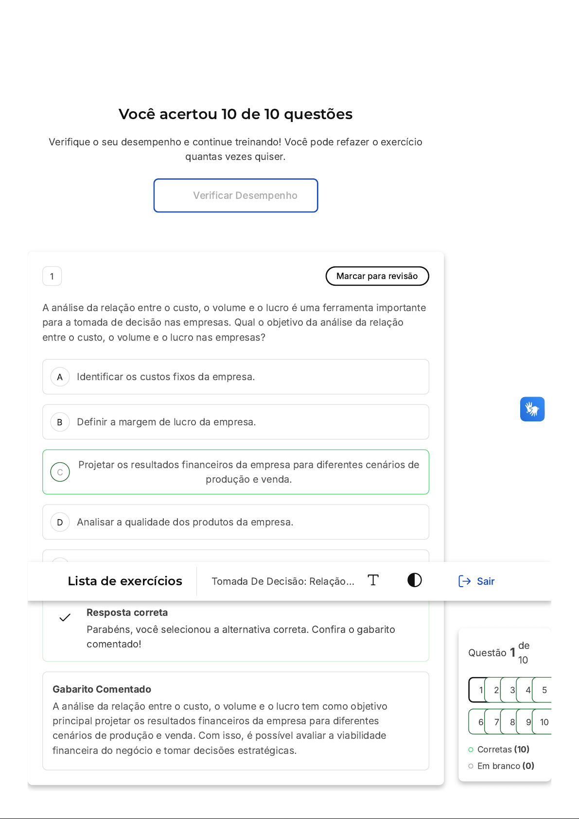 Você acertou 10 de 10 questões Verifique o seu desempenho e continue treinando! Você pode refazer o exercício quantas vezes quiser. Verificar Desempenho A B C D E 1 Marcar para revisão A análise da relação entre o custo, o volume e o lucro é uma ferramenta importante para a tomada de decisão nas empresas. Qual o objetivo da análise da relação entre o custo, o volume e o lucro nas empresas? Identificar os custos fixos da empresa. Definir a margem de lucro da empresa. Projetar os resultados financeiros da empresa para diferentes cenários de produção e venda. Analisar a qualidade dos produtos da empresa. Avaliar o desempenho dos funcionários da empresa. Resposta correta Parabéns, você selecionou a alternativa correta. Confira o gabarito comentado! Gabarito Comentado A análise da relação entre o custo, o volume e o lucro tem como objetivo principal projetar os resultados financeiros da empresa para diferentes cenários de produção e venda. Com isso, é possível avaliar a viabilidade financeira do negócio e tomar decisões estratégicas. Questão 1 de 10 Corretas (10) Em branco (0) 1 2 3 4 5 6 7 8 9 10 Lista de exercícios Tomada De Decisão: Relação… Sair A B C D E 2 Marcar para revisão A análise da relação de custo x volume x lucro é muito utilizada na tomada de decisão e na avaliação dos componentes de custos dos produtos, além de ser muito útil para a elaboração de orçamentos. Uma empresa apresenta a seguinte estrutura dos seus gastos de produção: Preço de venda unitário: $ 15,00 Custos e despesas variáveis por unidade: $ 9,50. Custos e despesas fixas totais: $ 11.000,00. A partir desses dados, pode-se concluir que: A empresa deverá produzir 2.500 unidades para cobrir seus custos totais. A margem de contribuição unitária é de $ 5,00. Se produzir 2.300 unidades, terá uma margem de segurança de 300 unidades. A empresa deverá produzir e vender 1.900 unidades para cobrir seus custos totais. Se produzir 2.500 unidades, terá uma margem de segurança de 450 unidades. Resposta correta Parabéns, você selecionou a alternativa correta. Confira o gabarito comentado! Gabarito Comentado Para resolver a questão, é necessário calcular a margem de contribuição unitária do produto, que é a diferença entre o preço de venda e os custos e despesas variáveis unitárias. Nesse caso, a margem de contribuição unitária é de $ 5,50 (15 - 9,5). Em seguida, divide-se os custos fixos pela margem de contribuição unitária para encontrar o ponto de equilíbrio, que é a quantidade de unidades que a empresa precisa vender para cobrir todos os seus custos. Nesse caso, o ponto de equilíbrio é de 2.000 unidades (11.000 / 5,5). Portanto, se a empresa produzir 2.300 unidades, ela estará produzindo 300 unidades acima do ponto de equilíbrio, o que significa que terá uma margem de segurança de 300 unidades. Isso indica que a empresa pode vender até 300 unidades a menos do que o planejado sem incorrer em prejuízo. Assim, a A B C D E alternativa correta é a C: "Se produzir 2.300 unidades, terá uma margem de segurança de 300 unidades". 3 Marcar para revisão A taxa de retorno do ativo, junto com a margem de contribuição são indicadores importantes para a gestão contábil e financeira de um empreendimento. O que é a taxa de retorno do ativo? É a capacidade da empresa de gerar lucro a partir dos seus passivos. É a capacidade da empresa de gerar lucro a partir dos seus ativos. É a capacidade da empresa de gerar lucro a partir do seu patrimônio líquido. É a capacidade da empresa de gerar lucro a partir dos seus custos variáveis. É a capacidade da empresa de gerar lucro a partir dos seus custos fixos. Resposta correta Parabéns, você selecionou a alternativa correta. Confira o gabarito comentado! Gabarito Comentado Taxa de retorno do ativo é outro conceito que pode ser utilizado em conjunto com a margem de contribuição. Significa a capacidade da empresa de gerar lucro a partir dos seus ativos. A taxa de retorno do ativo demonstra o quanto de resultado o ativo da empresa gerou para ela. 4 Marcar para revisão Uma indústria tem o nível de produção atual de 80.000 peças com preço de venda de $ 55/unidade. Para isso ela incorre nos seguintes custos: Custos fixos: $ 11.500 Custos variáveis: $ 400.000 A B C D E A B C Qual a margem de contribuição unitária? $ 40,00 $ 42,00 $ 48,00 $ 50,00 $ 54,00 Resposta correta Parabéns, você selecionou a alternativa correta. Confira o gabarito comentado! Gabarito Comentado A margem de contribuição unitária é calculada subtraindo o custo variável unitário do preço de venda unitário. No caso desta indústria, o custo variável total é de $ 400.000 para 80.000 peças, o que resulta em um custo variável unitário de $ 5. O preço de venda unitário é de $ 55, então a margem de contribuição unitária é de $ 55 - $ 5 = $ 50. Portanto, a alternativa correta é a letra D, que indica o valor de $ 50,00. 5 Marcar para revisão Uma empresa de tecnologia tem custos fixos de R$200.000 por mês. Ela vende um software por R$1.000, com custos variáveis de R$200 por licença vendida. Qual é o ponto de equilíbrio em número de licenças vendidas? 250 licenças. 200 licenças. 300 licenças. D E A B C D E 350 licenças. 400 licenças. Resposta correta Parabéns, você selecionou a alternativa correta. Confira o gabarito comentado! Gabarito Comentado O ponto de equilíbrio é alcançado quando a receita total cobre exatamente os custos totais. A margem de contribuição por licença é de R$800 (R$1.000 - R$200). Portanto, a empresa precisa vender 250 licenças (R$200.000 / R$800) para atingir o ponto de equilíbrio. 6 Marcar para revisão Na contabilidade empresarial, existem diferentes tipos de pontos de equilíbrio. Nesse contexto, para uma empresa atingir o seu ponto de equilíbrio financeiro, ela precisa: Igualar seus desembolsos financeiros com suas receitas. Produzir a quantidade mínima d