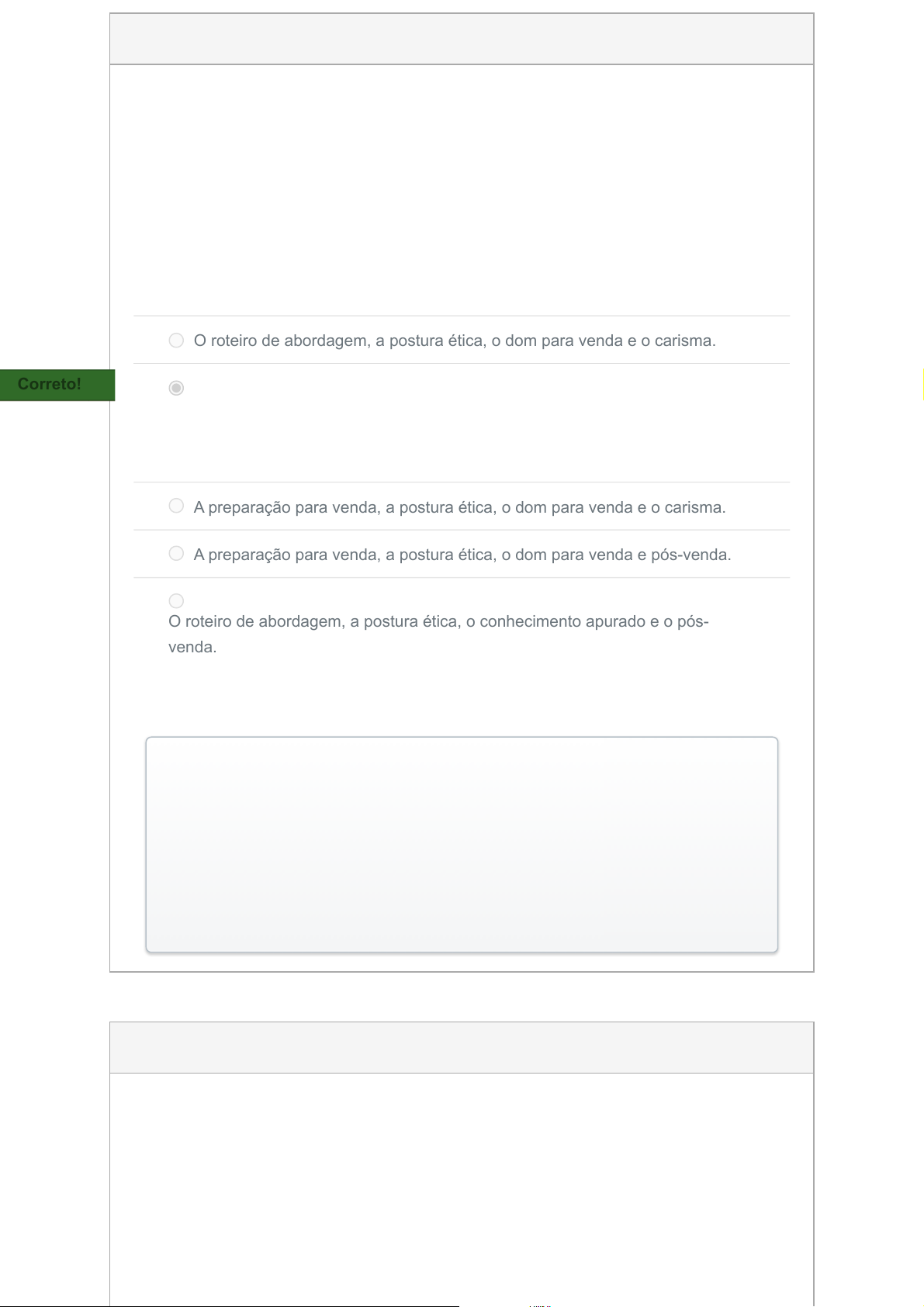 20 / 20 ptsPergunta 1 Saber conversar, sendo capaz de despertar interesse nas pessoas, prender sua atenção, atraí-las, naturalmente, pela superioridade da capacidade de conversação, é algo que proporciona uma satisfação muito grande. A comunicação é sim um mecanismo bastante relevante no que diz respeito também às técnicas de vendas. Mas há outras importantes habilidades, outros comportamentos e outras atitudes essenciais para a prática de vendas. Dentre elas podemos citar: O roteiro de abordagem, a postura ética, o dom para venda e o carisma. A preparação para venda, a postura ética, o conhecimento apurado e o pós- venda. Correto!Correto! A preparação para venda, a postura ética, o dom para venda e o carisma. A preparação para venda, a postura ética, o dom para venda e pós-venda. O roteiro de abordagem, a postura ética, o conhecimento apurado e o pós- venda. Dentre algumas habilidades que podemos citar que são necessárias para um bom vendedor, temos a preparação para a venda, que se trata da análise anterior sobre o cliente, o seu comportamento, dentre outras informações; a postura ética, demonstrada por meio do trabalho sério e honesto a ser desenvolvido; o conhecimento apurado, seja da empresa à qual representa como também do produto ou serviço; e um bom atendimento de pós-venda, que visa à criação de laços com o cliente, para sua fidelização com a empresa. 20 / 20 ptsPergunta 2 Ao compreender as especificidades do processo de venda entre empresas, ou seja, B2B, verifica-se sobre a necessidade de realização de planejamento, alocação de estoque, direcionamento de recursos e o tipo de comunicação ou ação de vendas e marketing específicos para abordar o público-alvo empresarial da melhor forma possível. Diante do exposto, qual ferramenta abaixo corresponde àquela que busca a construção de um elo forte entre as empresas? Vendas internacionais. Marketing de relacionamento. Correto!Correto! Gestão de equipes B2B. Gestão de equipes de alta performance. Técnicas de visitação e apresentação. Apesar de todas as ferramentas ou das proposições citadas serem de extrema relevância no contexto da gestão de vendas, quando abordamos sobre técnicas de vendas de forma geral, e, em especial, quanto às particularidades das vendas B2B, o marketing de relacionamento é fator principal a ser utilizado nesse processo. 0 / 20 ptsPergunta 3 O processo para que as organizações atuem no mercado externo pode acontecer de duas maneiras: 1) a empresa pode promover suas vendas por meio da exportação; 2) a empresa investe diretamente no mercado internacional, por meio da instalação de representações comerciais próprias ou, então, da instalação de uma unidade de produção nesse mercado externo. Mesmo assim, há uma série de especificidades para as vendas internacionais que as empresas devem levar em conta, principalmente quanto a: Características da marca, à diferenciação de produto, à adequação de embalagens e ao comportamento de consumo. Características culturais, aos aspectos de mercado, à diferenciação de produto, à adequação de embalagens e ao comportamento de colaboradores. Características culturais, à localização do escritório, à adaptação de produto, à adequação de embalagens e ao comportamento de consumo. Resposta corretaResposta correta Características culturais, aos aspectos legais, aos aspectos de mercado, à produção, à contratação de funcionários e ao comportamento de consumo. Características culturais, aos aspectos legais, aos aspectos de mercado, à adaptação de produto, à adequação de embalagens e ao comportamento de consumo. Você respondeuVocê respondeu De acordo com a leitura “Gestão de equipe de vendas de alta performance”, da lição 5, características da marca, diferenciação de produto, comportamento de colaboradores, localização do escritório e contratação de funcionários, embora sejam fatores que as organizações em processo de internacionalização devam se preocupar, isto não deve ocorrer quando ela está iniciando este processo, são questões que serão consideradas em um segundo momento. 20 / 20 ptsPergunta 4 No caso das vendas internacionais e suas particularidades, verifica-se que se trata de um ambiente que apresenta um grande desafio para as empresas. Elas precisam estar preparadas interna e operacionalmente para vislumbrar e entrar em outros mercados, em especial por se tratar de outros países, que precisam ser conhecidos devido também às suas individualidades. Na exportação indireta, há empresas que intermediam o processo de exportação, sendo elas as chamadas: Trading companies, empresas comerciais exclusivamente exportadoras, empresas comerciais do mercado interno e externo, associações exportadoras, ou também chamadas de consórcios de exportação. Correto!Correto! Trading companies, as próprias empresas estabelecidas em outro país, empresas comerciais do mercado interno e externo, associações exportadoras, ou também chamadas de consórcios de exportação. Sales companies, empresas comerciais exclusivamente exportadoras, empresas comerciais do mercado interno e externo, associações exportadoras, ou também chamadas de consórcios de exportação. Soft companies, empresas comerciais exclusivamente exportadoras, empresas comerciais do mercado interno e externo, associações exportadoras, ou também chamadas de consórcios de exportação. Sales companies, as próprias empresas estabelecidas em outro país, empresas comerciais do mercado interno e externo, associações exportadoras, ou também chamadas de consórcios de exportação. As principais empresas intermediárias que atuam no processo de vendas internacionais são as trading companies, empresas comerciais exclusivamente exportadoras, empresas comerciais do mercado interno e externo, associações exportadoras, ou também chamadas de consórcios de exportação. 