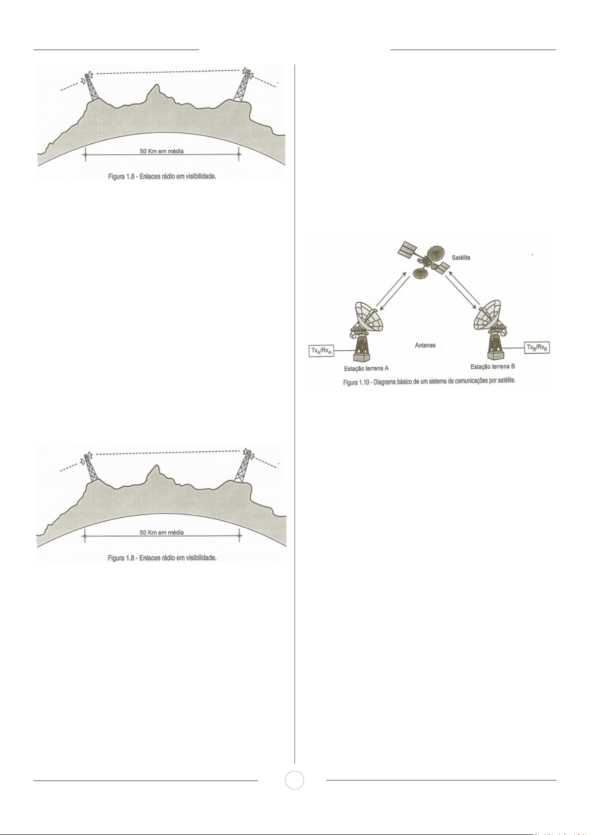 INFORMÁTICA 48 Quase sempre, os sistemas em visibilidade transportam uma grande quantidade de informações em canais multiplexados numa única onda portadora. Sistemas de baixa capacidade em canais po- dem operar em frequências mais baixas, por exemplo em UHF. Modernamente, enlaces entre pontos distantes em até dois quilômetros sem obstruções no percurso podem ser feitos em visi- bilidade com equipamento transceptor a laser. Sistema de comunicações por tropodifusão É um sistema rádio, na faixa de 900 MHz a 2 GHz, usado para efetuar o enlace entre dois pontos distantes de 100 até cerca de 400 quilômetros, valendo-se da reflexão das ondas no alto da tro- posfera. Uma única onda portadora transporta informações em ca- nais de voz e dados multiplexados, da ordem de 100 a 300 canais. Uma explicação para o fenômeno da tropodifusão ou espalha- mento troposférico refere-se à parte alta da troposfera, região com- preendida entre a superfície da Terra e a tropopausa, a cerca de 10 quilômetro de altura, onde existem elétrons em constante agitação, formando uma região de permanente turbilhonamento (volume co- mum na figura 1.9), capaz de refletir uma pequena fração da ener- gia incidente, irradiada por uma antena transmissora terrena, em freqüência da faixa mencionada. É um sistema pouco usado em relação aos demais, mas é efi- ciente em regiões tecnicamente inviáveis ao emprego de outros ti- pos de sistemas terrestres, por exemplo, a Região Amazônica (den- sa floresta, grandes volumes de água e grandes distâncias entre as cidades). As emissões são feitas com potências que variam de 50 W a 50 kW. As antenas usadas são de grande porte e bastante pesadas, podendo chegar a pesar duas toneladas. Ao contrário do sistema em visibilidade, uma antena não vê a outra e por esta razão as comunicações troposféricas são conheci- das também por comunicações transorizontes. Sistema de comunicações por satélite Lançado por foguete ou liberado de um veículo espacial, o sa- télite artificial de comunicações é colocado em órbita da Terra para receber as ondas de rádio emitidas de transmissores terrenos e en- viá-las de volta à Terra, em outra freqüência. Desta forma, o satélite de comunicações nada mais é que uma estação radiorrepetidora (radio-telay) posicionada no espaço, para iluminar, com ondas de rádio, uma calota terrestre de extensão considerável. O acesso ao satélite é múltiplo. De qualquer ponto da área de cobertura do satélite, podem ser estabelecidos enlaces via satélite entre estações terrenas. Sendo o percurso satélite-Terra livre de obstruções, as trans- missões podem ser feitas, relativamente, com pouca potência. Geralmente, as antenas são montadas sobre refletores parabóli- cos, para assegurar a diretividade e o elevado ganho da antena. Os diâmetros dos refletores costumam variar de 60 cm, para recepção de sinais digitais de televisão, por exemplo, até 30 m, aplicado em modelo encontrado nos principais centros de comunicações de sis- temas satélites. O transponder é a unidade rádio do satélite, que recebe o sinal captado pela antena, converte a freqüência, amplifica em potência e devolve à antena. Um satélite costuma ter vários transponders. A potência de transmissão do satélite é da ordem de 10 watts e das estações terrestres bem mais. Os satélites estão posicionados, no espaço, em três tipos dife- rentes de órbitas: - Órbita baixa (Leo - low earth orbit), distante da Terra de 150 à cerca de 1.500 quilômetros. Satélites em Leo levam até cerca de 100 minutos para comple- tar uma volta em torno da Terra. Nessa órbita são encontrados, em diferentes planos, por exemplo, os satélites de sistemas de telefonia móvel. - Órbita média (Meo - médium earth orbit), distante da Terra de 20.000 a 25.000 quilômetros. Nesta situação os satélites levam de 5 a 12 horas para percorrer a órbita. Em Meo são encontrados, por exemplo, satélites do siste- ma GPS - sistema de posicionamento global. - Órbita geossíncrona (Geo) ou cinturão de Clarke (Arthur C.), no plano do equador terrestre, a 36.000 quilômetros de distância da Terra. Em Geo o satélite permanece parado no espaço, sobre um ponto fixo da Terra, acompanhando-a em seu movimento de rotação. Por este motivo o satélite é denominado geoestacionário ou geossíncrono. Em Geo encontram-se os satélites domésticos de comunica- ções de diversos países, inclusive do Brasil. Um satélite de comunicações geoestacionário típico funciona com 24 transponders e mais seis de reserva, totalizando 30 trans- ponders. Um transponder costuma ter uma banda B = 36 MHz, que permite a operação com cerca de 900 canais analógicos de voz mul- INFORMÁTICA 49 tiplexados ou apenas um canal analógico de televisão e, se em co- municações digitais, da ordem de 120 Mbits/s de tráfego ou cinco canais de televisão. As frequências de operação são de 6 GHz para transmissão ter- rena ao satélite e 4 GHz do satélite para a Terra. A referência usual das frequências é escrita na forma 4/6 GHz (desce na menor e sobe na maior freqüência). Outras faixas de frequências disponíveis são: 7/8, 10/12,12/14,14/18, 20/27 GHz. O tempo de vida útil de um satélite varia de oito a dez anos, em função de diversos fatores, como a duração da bateria e o funciona- mento dos transponders. Um sistema satélite doméstico geralmente opera com o míni- mo de dois satélites. Sistemas de telefonia móvel operam com mais de 60 satélites girando em volta da Terra, em órbitas distintas. A enorme quantidade de satélites lançados, em operação ou já inativos, constitui um sério problema. Desde o Sputnik, da então União Soviética, o primeiro satélite a entrar em órbita, em 1957, até os dias de hoje, já houve mais de 27.000 lançamentos de satélites e espaçonaves. O destino final desses objetos espaciais, alguns pe- sando tonela