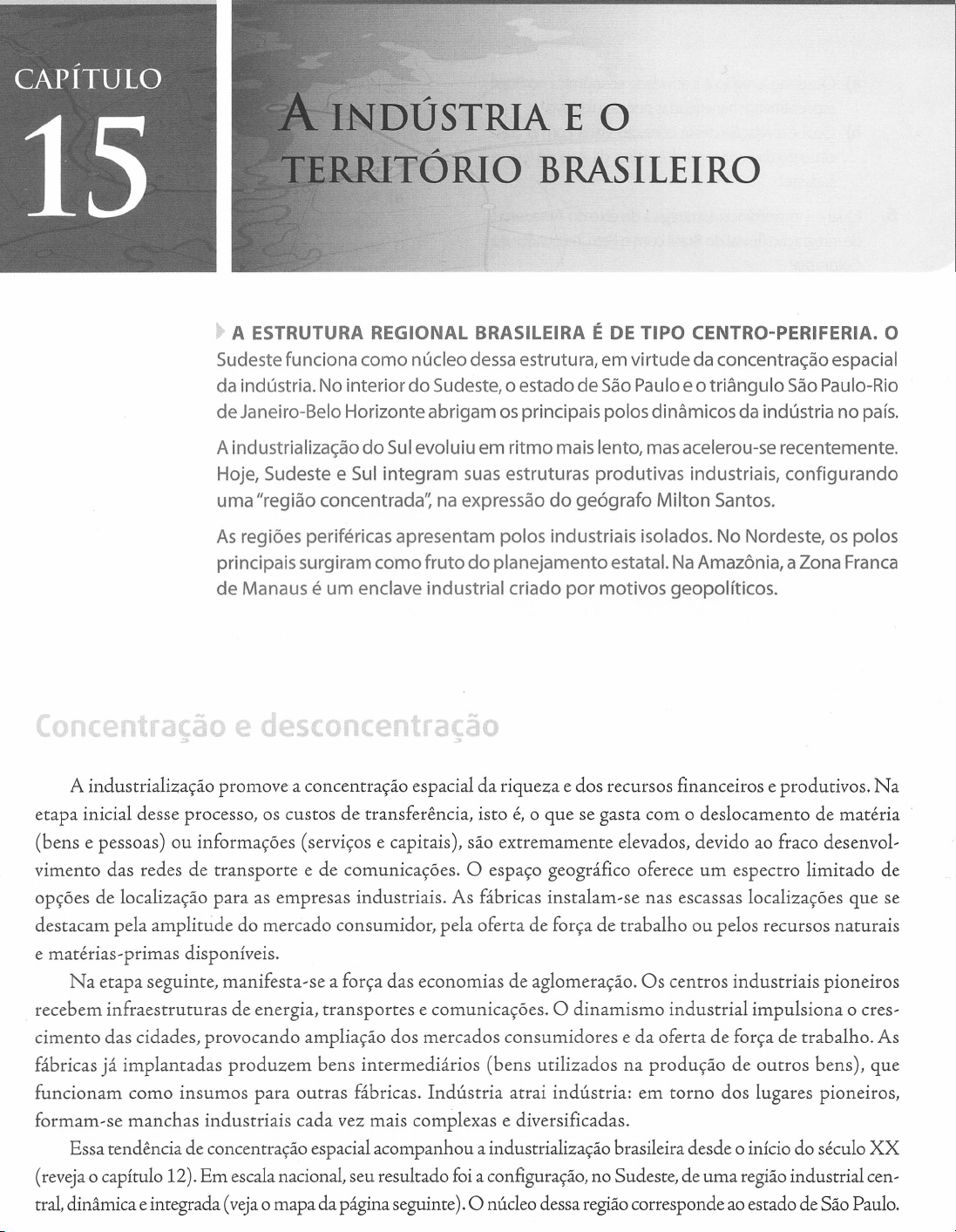 ~ INDUSTRlA E O ..JI..~'''-L''--LTÓRIO BRASILEIRO A ESTRUTURA REGIONAL BRASILEIRA É DE TIPO CENTRO-PERIFERIA. O Sudeste funciona como núcleo dessa estrutura, em virtude da concentração espacial da indústria. No interior do Sudeste, o estado de São Paulo e o triângulo São Paulo-Rio de Janeiro-Belo Horizonte abrigam os principais polos dinâmicos da indústria no país. A industrialização do Sul evoluiu em ritmo mais lento, mas acelerou-se recentemente. Hoje, Sudeste e Sul integram suas estruturas produtivas industriais, configurando uma "região concentrada'; na expressão do geógrafo Milton Santos. As regiões periféricas apresentam polos industriais isolados. No Nordeste, os polos principais surgiram como fruto do planejamento estatal. Na Amazônia, a Zona Franca de Manaus é um enclave industrial criado por motivos geopolíticos. ao esco cent a ao A industrialização promove a concentração espacial da riqueza e dos recursos financeiros e produtivos. Na etapa inicial desse processo, os custos de transferência, isto é, o que se gasta com o deslocamento de matéria (bens e pessoas) ou informações (serviços e capitais), são extremamente elevados, devido ao fraco desenvol- vimento das redes de transporte e de comunicações. O espaço geográfico oferece um espectro limitado de opções de localização para as empresas industriais. As fábricas instalam-se nas escassas localizações que se destacam pela amplitude do mercado consumidor, pela oferta de força de trabalho ou pelos recursos naturais e matérias-primas disponíveis. Na etapa seguinte, manifesta-se a força das economias de aglomeração. Os centros industriais pioneiros recebem infraestruturas de energia, transportes e comunicações. O dinamismo industrial impulsiona o cres- cimento das cidades, provocando ampliação dos mercados consumidores e da oferta de força de trabalho. As fábricas já implantadas produzem bens intermediários (bens utilizados na produção de outros bens), que funcionam como insumos para outras fábricas. Indústria atrai indústria: em torno dos lugares pioneiros, formam-se manchas industriais cada vez mais complexas e diversificadas. Essa tendência de concentração espacial acompanhou a industrialização brasileira desde o início do século XX (reveja o capítulo 12). Em escala nacional, seu resultado foi a configuração, no Sudeste, de uma região industrial cen- tral, dinâmica e integrada (veja o mapa da página seguinte). O núcleo dessa região corresponde ao estado de São Paulo. 298 \ OCEANO ATLÂNTICO ® Capital estadual • Capital federal Maior concentração industrial DOutras concentrações industriais N A Fonte: INSTITUTO Brasileiro de Geografia e Estatística. Atlas nacional do Brasil. Rio de Janeiro: IBGE, 1992. p. XVII-? A geografia industrial depende, em grande medida, dos investimentos diretos das empresas estatais e das estratégias de desenvolvimento regional do Estado. A política governamental de implantação da siderurgia moderna, entre as décadas de 1940 e 1960, reforçou a concentração espacial da indústria no Sudeste. O poder multiplicado r da siderurgia e as infraestruturas de transportes a ela associadas aprofundaram as desi- gualdades econômicas entre a região industrial central e o restante do país. No Sul e no Nordeste, Iormaram-se regiões industriais periféricas, bastante distintas uma da outra. Na Amazônia e no Centro-Oeste, as indús- trias estabeleceram-se como enclaves isolados. Em escala regional, o movimento concentrado r gerou aglomerações industriais associadas às metrópoles e às capitais estaduais. Em certo ponto do desenvolvimento econômico, a tendência de concentração espacial da indústria arre- fece e dá lugar a movimentos de desconcentração. A evolução das tecnologias e infraestruturas de transpor~ tes e comunicações reduz significativamente os custos de transferência. O espaço geográfico torna-se mais fluido, descortinando inúmeras novas localizações atraentes para as empresas industriais. A indústria e o território brasileiro. CAPíTULO15 Nessa etapa, manifesta-se a força das deseconomias de aglomeração. Nas regiões industriais tradicionais, crescem os custos dos terrenos, assim como os impostos municipais. A força de trabalho, organizada em sindica- tos, consegue aumentos salariais. Diversos custos exter- nos, de difícil mensuração, originam-se do congestiona- mento de tráfego e da poluição ambiental e dos custos gerais de aluguéis, transportes e alimentação típicos das metrópoles. Em busca do melhor retorno para o capital, os investimentos empresariais são desviados para novas localizações. No Brasil, esse fenômeno começou a se desenvolver na década de 1970. Seus sintomas transpa~ recem na perda de participação do Sudeste na força de trabalho da indústria de transformação e no valor total da produção industrial (veja os gráficos a seguir). Participação regional na força de trabalho industrial (%) 70 69,7 ~3 60 - 53,3 50 - 40 - 30 - 20 - 20,0--n 10 210,813,0 10 - 11 ~. Acesso em: 6 mar. 2012. Os números da participação na força de trabalho industrial parecem indicar um vigoroso processo de 299 UNIDADE 2 • Brasil: Estado e espaço geográfico desconcentração, mas as perdas relativas do Sudeste se refletem quase apenas em aumento expressivo da parti- cipação da Região Sul. Já os números da distribuição do valor da produção industrial mostram que o predomínio do Sudeste ainda é muito expressivo e que o processo de desconcentração se desacelerou na primeira década do século XXI. Em conjunto, os dados evidenciam, paralelamente a um processo limitado de desconcentração, a moderni- zação tecnológica das empresas industriais do Sudeste, que provoca redução relativa do emprego de mão de obra. Eles também indicam que a Região Sul abriga diversos focos de novos investimentos industriais. A integração do Centro-Sul As tendências d