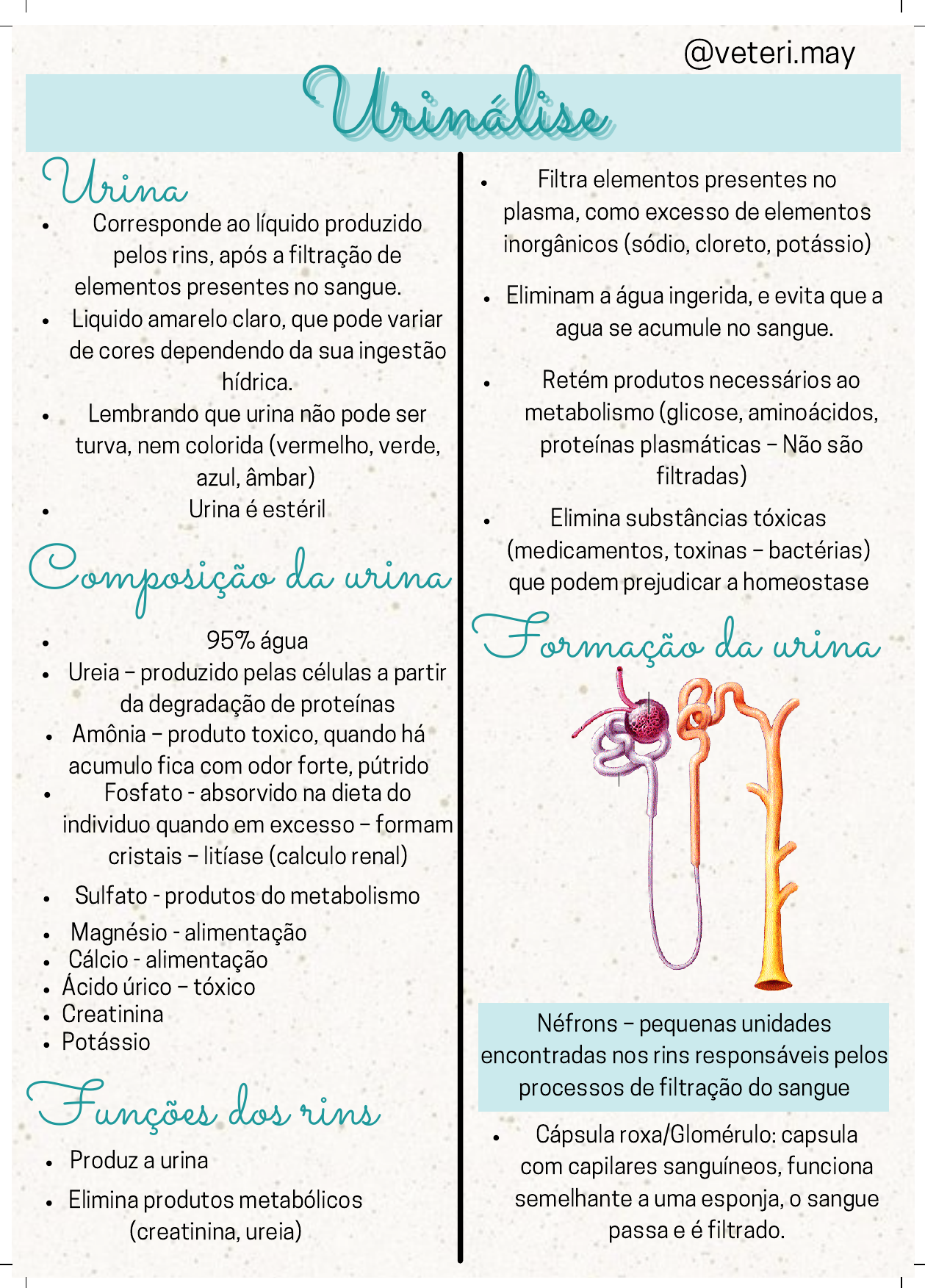 @veteri.may Urinalise Urina Filtra elementos presentes no Corresponde ao líquido produzido plasma, como excesso de elementos pelos rins, após a filtração de inorgânicos (sódio, cloreto, potássio) elementos presentes no sangue. Eliminam a água ingerida, e evita que a Liquido amarelo claro, que pode variar agua se acumule no sangue. de cores dependendo da sua ingestão hídrica. Retém produtos necessários ao Lembrando que urina não pode ser metabolismo (glicose, aminoácidos, turva, nem colorida (vermelho, verde, proteínas plasmáticas - Não são azul, âmbar) filtradas) Urina é estéril Elimina substâncias tóxicas (medicamentos, toxinas - bactérias) da urina que podem prejudicar a homeostase 95% água da urina Ureia - produzido pelas células a partir da degradação de proteínas Amônia - produto toxico, quando há acumulo fica com odor forte, pútrido Fosfato - absorvido na dieta do individuo quando em excesso - formam cristais - litíase (calculo renal) Sulfato - produtos do metabolismo Magnésio alimentação Cálcio alimentação Ácido úrico - tóxico Creatinina Néfrons - pequenas unidades Potássio encontradas nos rins responsáveis pelos dos rins processos de filtração do sangue Cápsula roxa/Glomérulo: capsula Produz a urina com capilares sanguíneos, funciona Elimina produtos metabólicos semelhante a uma esponja, o sangue (creatinina, ureia) passa e é filtrado.