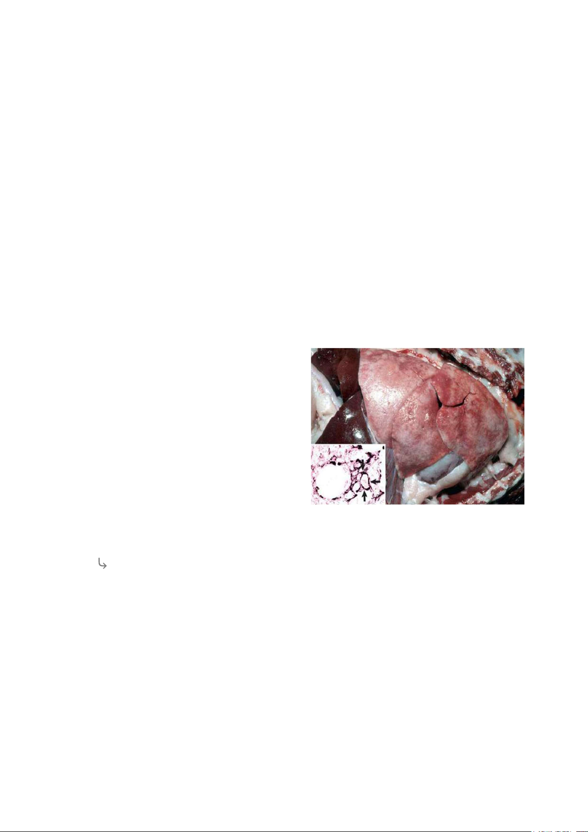 Patologia especial dos animais domésticos Distúrbios pulmonares (Bronquíolos, Brônquios e Alvéolos) em Animais Domésticos Anomalias ➞ As anomalias congênitas dos pulmões são raras em todas as espécies, mas são relatadas com mais frequência em bovinos e ovinos. Distúrbios Metabólicos Calcificação Pulmonar ➞ Também conhecida como “Calcinose” ➞ Geralmente em decorrência de hipervitaminose D ➞ ingestão de plantas tóxicas (hipercalcêmicas) como Solanum malacoxylon (doença depauperante de Manchester), que contêm análogos de vitamina D. ➞ Também é uma sequela comum da uremia, hiperadrenocorticismo e de necrose pulmonar (calcificação distrófica) ➞ Na maioria dos casos, tem pouca importância clínica, embora a sua causa possa ser muito importante. ➞ Os pulmões calcificados não colapsam quando a cavidade torácica é aberta, e apresentam uma textura arenosa” Ex: Pneumopatia Urêmica Resultante de Insuficiência Renal Crônica, Pulmão, Cão de 4 Anos de Idade. ➞ Microscopicamente, as lesões variam da calcificação das membranas basais alveolares à ossificação heterotópica dos pulmões. Distúrbios do Preenchimento Alveolar ➞ constituem um grupo heterogêneo de doenças caracterizadas pelo acúmulo Patologia especial dos animais domésticos de diversos compostos químicos no lúmen alveolar. Pneumonia Lipídica (Lipoide) Endógena ➞ Ocorre frequentemente nas proximidades de lesões neoplásicas do pulmão em seres humanos, gatos e cães. ➞ a patogênese seja desconhecida presume-se que lipídios do surfactante pulmonar e de células degeneradas se acumulem no interior dos macrófagos alveolares. esse acúmulo pode ocorrer devido a incapacidade dos macrófagos alveolares — que normalmente removem parte dos lipídios do surfactante — em sair do pulmão pelo elevador mucociliar ➞ As lesões macroscópicas são nódulos multifocais, brancos e firmes dispersos por todo o pulmão. ➞ Microscopicamente, os alvéolos apresentam-se preenchidos com macrófagos espumosos carregados de lipídios acompanhados por infiltração intersticial de linfócitos e plasmócitos, fibrose, epitelização alveolar e, em alguns casos, fendas de colesterol e granulomas lipídicos. Patologia especial dos animais domésticos Pneumonia Lipídica Exógena ➞ resulta da aspiração de material gorduroso Ex: administram óleo mineral a seus animais na tentativa de remover bolas de pelo ou tratar cólica (pneumonia por aspiração). Distúrbios de Inflação Pulmonar ➞ Para que ocorra troca gasosa, é preciso que haja a presença de uma proporção equilibrada de volume de ar e sangue capilar nos pulmões (relação ventilação/perfusão), e o ar e o sangue capilar devem estar bem próximos na parede alveolar. ➞ Ocorre desproporção entre ventilação e perfusão se o tecido pulmonar estiver colapsado (atelectasia) ou excessivamente inflado ou insuflado (hiperinsuflação e enfisema). Atelectasia (Congênita e Adquirida) ➞ Pulmões que não se expandem com ar no momento do nascimento congênita ou neonatal ou que colapsam após a insuflação adquirida ou colapso alveolar ex: atelectasia pulmonar, bezerro, um dia. Enfisema Pulmonar ➞ geralmente conhecido apenas como enfisema. ➞ é uma doença primária extremamente importante em seres humanos, enquanto em animais é quase Patologia especial dos animais domésticos sempre uma condição secundária resultante de uma variedade de lesões pulmonares. ➞ Na medicina humana, o enfisema é definido como uma dilatação anormal e permanente dos espaços aéreos distais ao bronquíolo terminal acompanhada pela destruição das paredes alveolares (enfisema alveolar). ➞ O enfisema primário não ocorre em animais, razão pela qual nenhuma doença animal deve ser chamada apenas de enfisema. ➞ Em animais, essa lesão é sempre decorrente de obstrução do efluxo de ar ou é de natureza agonal no abate. ➞ O enfisema pulmonar secundário geralmente ocorre em animais com broncopneumonia, na qual o exsudato que obstrui os brônquios e bronquíolos provoca um desequilíbrio no fluxo de ar em que o volume de ar que entra no pulmão excede o volume que sai. Esse desequilíbrio geralmente é promovido pelo chamado efeito de válvula de via única (ou válvula antirretorno) causado pelo exsudato que permite a entrada de ar no pulmão durante a inspiração, mas impede o movimento de saída durante a expiração. Dependendo da localização no pulmão, o enfisema pode ser classificado como alveolar ou intersticial. ➞ O enfisema alveolar, caracterizado pela distensão e ruptura das paredes alveolares formando bolhas de ar de tamanho variável no parênquima pulmonar, ocorre em todas as espécies. ➞ O enfisema intersticial acomete principalmente bovinos, presumivelmente por causa dos amplos septos interlobulares da espécie, e a falta de ventilação colateral nessas espécies não permite a livre movimentação do ar para os lóbulos pulmonares adjacentes. Consequentemente, o ar acumulado penetra nas paredes dos alvéolos e bronquíolos e força sua entrada no tecido conjuntivo Patologia especial dos animais domésticos interlobular, causando notável distensão dos septos interlobulares. Suspeita-se também de que os movimentos respiratórios forçados predispõem a enfisema intersticial quando o ar sob alta pressão invade o tecido conectivo frouxo dos septos interlobulares. ➞ Às vezes, essas bolhas de ar retidas no enfisema alveolar ou intersticial tornam-se confluentes, formando grandes (vários centímetros de diâmetro) bolsas de ar, conhecidas como bolhas. a lesão é denominada enfisema bolhoso. Ela não é um tipo específico de enfisema nem indica um processo patológico diferente, mas sim um acúmulo de ar um pouco maior em um determinado foco. ➞ Nos casos mais graves, o ar desloca-se dos septos interlobulares para o tecido conjuntivo que envolve os brônquios e vasos principais (feixes bronco