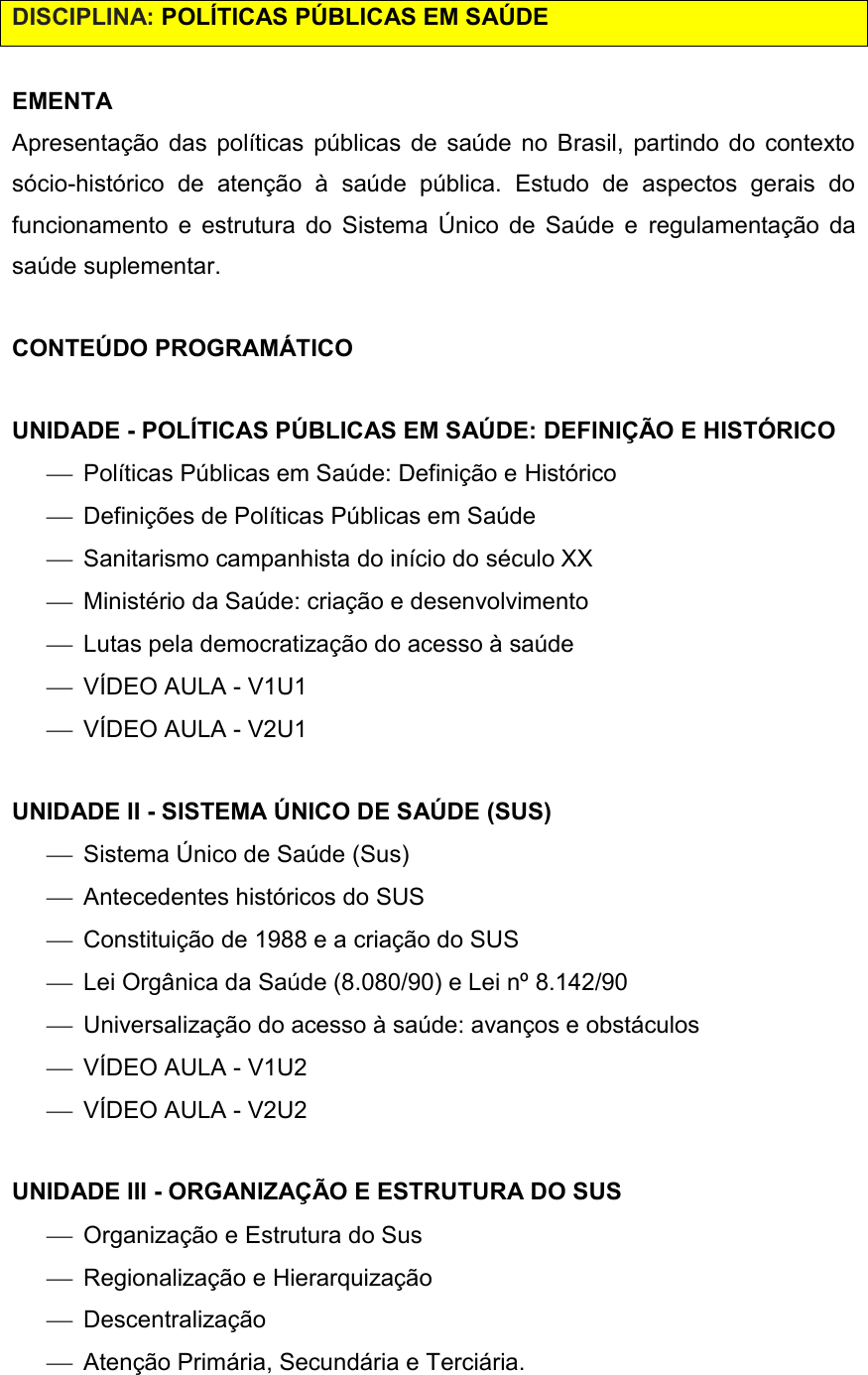 DISCIPLINA: POLÍTICAS PÚBLICAS EM SAÚDE EMENTA Apresentação das políticas públicas de saúde no Brasil, partindo do contexto sócio-histórico de atenção à saúde pública. Estudo de aspectos gerais do funcionamento e estrutura do Sistema Único de Saúde e regulamentação da saúde suplementar. CONTEÚDO PROGRAMÁTICO UNIDADE - POLÍTICAS PÚBLICAS EM SAÚDE: DEFINIÇÃO E HISTÓRICO Políticas Públicas em Saúde: Definição e Histórico Definições de Políticas Públicas em Saúde Sanitarismo campanhista do início do século XX Ministério da Saúde: criação e desenvolvimento Lutas pela democratização do acesso à saúde VÍDEO AULA - V1U1 VÍDEO AULA - V2U1 UNIDADE II - SISTEMA ÚNICO DE SAÚDE (SUS) Sistema Único de Saúde (Sus) Antecedentes históricos do SUS Constituição de 1988 e a criação do SUS Lei Orgânica da Saúde (8.080/90) e Lei nº 8.142/90 Universalização do acesso à saúde: avanços e obstáculos VÍDEO AULA - V1U2 VÍDEO AULA - V2U2 UNIDADE III - ORGANIZAÇÃO E ESTRUTURA DO SUS Organização e Estrutura do Sus Regionalização e Hierarquização Descentralização Atenção Primária, Secundária e Terciária. VÍDEO AULA - V1U3 VÍDEO AULA - V2U3 UNIDADE IV - SAÚDE SUPLEMENTAR E ÓRGÃOS REGULADORES Saúde Suplementar e Órgãos Reguladores Planos de saúde ANVISA (Agência Nacional de Vigilância Sanitária) ANS (Agência Nacional de Saúde) VÍDEO AULA - V1U4 VÍDEO AULA - V2U4 REFERÊNCIAS LOPES. Mario. Políticas de saúde pública: interação dos atores sociais. 2 ed. Rio de Janeiro: Atheneu, 2017. SARRETA, FO. Educação permanente em saúde para os trabalhadores do SUS [online]. São Paulo: Editora UNESP; São Paulo: Cultura Acadêmica, 2009. Disponível em: http://books.scielo.org HACK, Neiva Silvana. Política pública da saúde no Brasil: história, gestão e relação com a profissão do serviço social. Curitiba: InterSaberes, 2019. ROCHA, Juan S. Y. (Ed) Manual de saúde publica e saúde coletiva no Brasil. São Paulo: Atheneu, 2012. Disponível em: BUSATO, Ivana M.S; GARCIA, Ivana de F.; Rodrigues, Izabelle C. G. SUS: estrutura organizacional, controle, avaliação e regulação. Curitiba: InterSaberes, 2019. SCHEIDWEILER, Lourival. Gestão dos serviços de saúde: uma visão setorial sobre contratos, convênios, riscos e pessoas. Curitiba: InterSaberes, 2019. SILVA, Lincoln da; ARCHANJO, Daniela R.; ARCHANJO, Lea R. Saúde da família na atenção primária. Curitiba: InterSaberes, 2019. MATTA, Gustavo Corrêa; PONTES, Ana Lúcia de Moura (Orgs.). Políticas de saúde: organização e operacionalização do sistema único de saúde. Rio de Janeiro: EPSJV / Fiocruz, 2007. Disponível em: http://www6.ensp.fiocruz.br/repositorio/sites/default/files/arquivos/Configura%C 3%A7%C3%A3oInstitucional.pdf http://books.scielo.org/ http://www6.ensp.fiocruz.br/repositorio/sites/default/files/arquivos/Configura%C3%A7%C3%A3oInstitucional.pdf http://www6.ensp.fiocruz.br/repositorio/sites/default/files/arquivos/Configura%C3%A7%C3%A3oInstitucional.pdf