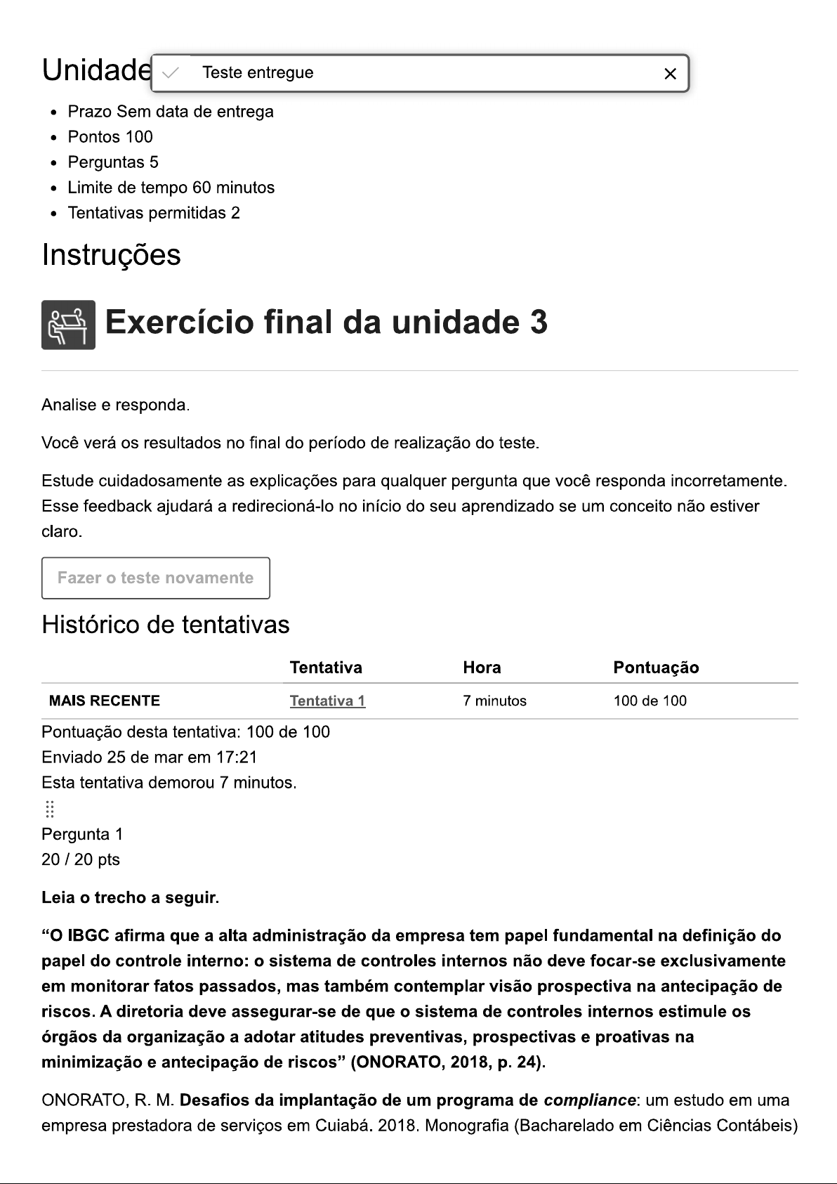 Unidade Teste entregue X Prazo Sem data de entrega Pontos 100 Perguntas 5 Limite de tempo 60 minutos Tentativas permitidas 2 Instruções Exercício final da unidade 3 Analise e responda. Você verá os resultados no final do período de realização do teste. Estude cuidadosamente as explicações para qualquer pergunta que você responda incorretamente. Esse feedback ajudará a redirecioná-lo no início do seu aprendizado se um conceito não estiver claro. Fazer teste novamente Histórico de tentativas Tentativa Hora Pontuação MAIS RECENTE Tentativa 1 7 minutos 100 de 100 Pontuação desta tentativa: 100 de 100 Enviado 25 de mar em 17:21 Esta tentativa demorou 7 minutos. Pergunta 1 20 / 20 pts Leia o trecho a seguir. "O IBGC afirma que a alta administração da empresa tem papel fundamental na definição do papel do controle interno: o sistema de controles internos não deve focar-se exclusivamente em monitorar fatos passados, mas também contemplar visão prospectiva na antecipação de riscos. A diretoria deve assegurar-se de que o sistema de controles internos estimule os órgãos da organização a adotar atitudes preventivas, prospectivas e proativas na minimização e antecipação de riscos" (ONORATO, 2018, p. 24). ONORATO, R. M. Desafios da implantação de um programa de compliance: um estudo em uma empresa prestadora de serviços em Cuiabá. 2018. Monografia (Bacharelado em Ciências Contábeis)Teste entregue 5 mai. 2022. o texto faz uma menção aos papéis da alta cúpula organizacional nos programas de compliance empresarial. A respeito desses papéis, analise as asserções a seguir. I. É necessário patrocinar programa de compliance junto ao público interno e externo, ressaltando a importância dele para a organização, enfatizando a imprescindibilidade do comprometimento de todos os colaboradores e das partes interessadas. II. É preciso determinar políticas e medidas de integridade, destacando recursos humanos, materiais e financeiros suficientes para o pleno desenvolvimento delas. III. A participação da alta administração de uma organização na supervisão de um programa de compliance deve ser direta e sem intermediários, independentemente do perfil da empresa. IV. Compete à alta cúpula administrativa das organizações o monitoramento cotidiano dos comportamentos de todos os colaboradores. Das proposições acima, estão corretas: e III, apenas. Correto! e II, apenas. I, e III. III e IV, apenas. I, apenas. Um programa de compliance empresarial deve ser construído de maneira sistemática, e isso exige a consolidação de uma cultura da conformidade e da integridade dentro do ambiente organizacional. Além disso, os stakeholders que formam o público interno e externo precisam ser sensibilizados em relação ao comprometimento da alta administração nos esforços de compliance. Para que essa cultura floresça, o compromisso e o envolvimento contínuo da alta administração são imprescindíveis, sob pena de o programa não além do design, ou seja, sob o risco de não passar de um conjunto de princípios e de regras corporativas que existem apenas no papel. Pergunta 2 20/20 pts Leia trecho a seguir. "Diversos escândalos de corrupção em empresas multinacionais se tornaram mundialmente conhecidos, como os envolvendo a Petrobrás, Odebrecht e a Siemens, ocasionando em perdas significativas para essas organizações. Tendo em vista que os riscos gerados pela não observância de práticas éticas e legais podem ocasionar riscos reputacionais, financeiros e legais para a organização, uma área dedicada a essa temática é imprescindível dentro das organizações, principalmente ao lidar com um novo cenário" (SILVA, 2020, p. 9).SILVA, P. R. o empresas. 2020. Monogra Teste entregue de Uberlândia, Uberlândia, 2020. Disponível em: https://repositorio.ufu.br/bitstream/123456789/31021/1/ProgramaDeCompliance.pdf Acesso em: 15 mai. 2022. o excerto apresentado menciona escândalos de corrupção corporativa que ocorreram recentemente no Brasil e a importância de ferramentas para gerenciá-los. Vários escândalos corporativos éticos com repercussão mundial foram observados nos últimos anos. Qual das alternativas a seguir expressa uma ferramenta que é considerada pelos cientistas e pelos filósofos administrativos como sendo de grande valia para identificar problemas corporativos éticos? Sigilo. Accountability. Auditoria. Correto! Denúncia. Demissão. A denúncia (whistleblowing) e vista pelos cientistas e pelos filósofos administrativos como sendo uma ferramenta indispensável para que uma corporação possa identificar a ocorrência de problemas éticos que estejam ocorrendo (como assédio moral, assédio sexual, vazamento de dados e informações sigilosos etc.), já que, muitas vezes, não haverá outra maneira de identificar esse tipo de problema senão por meio de denúncias por parte dos colaboradores. Pergunta 3 20/20 pts Leia trecho a seguir. "Dessa forma, a tendência mundial é promover o desenvolvimento de mecanismos para a gestão dos riscos operacionais, tanto para a sobrevivência da empresa, uma vez que uma única operação pode transformar um Banco rentável em insolvente, como para atender órgãos supervisores nacionais e internacionais. Dada a relevância do tema, ou seja, a importância do gerenciamento do risco operacional para uma sociedade, presente artigo tem como objetivo avaliar estágio de gerenciamento do risco operacional, detectando instrumento de medida e análise em instituição financeira nacional, de grande porte, e, principalmente, possuidora de clientes tanto no mercado interno quanto externo" (TRAPP; CORRAR, 2005, p. 25). TRAPP, A. C. G.; CORRAR, L. J. Avaliação e gerenciamento do risco operacional no Brasil: análise de caso de uma instituição financeira de grande porte. Revista Contabilidade & Finanças, São Paulo, V. 16, n. 37, p. 24-36, 2005. Disponível em:Teste entregue m: 15 mai. 2022. o excerto 