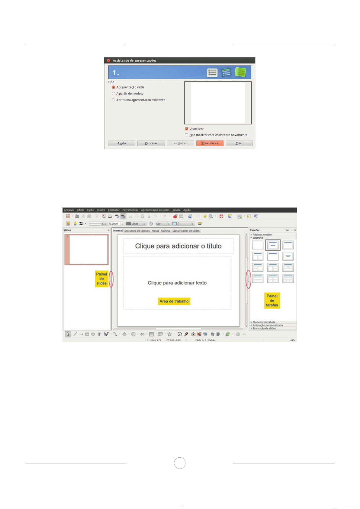 NOÇÕES DE INFORMÁTICA 55 Se desejar não usar o assistente no futuro, você pode selecionar Não mostrar este Assistente novamente. Clique em Criar para abrir a janela principal do Impress. Partes da Janela Principal do Impress A janela principal do Impress (Figura 2) tem três partes: o Painel de Slides, Área de Trabalho, e Painel de Tarefas. Adicionalmente, diversas barras de ferramentas podem ser mostradas ou ocultas durante a criação de uma apresentação. Painel de slides O Painel de Slides contém imagens em miniaturas dos slides de sua apresentação, na ordem em que serão mostrados (a menos que se mude a ordem de apresentação dos slides). Clicando em um slide deste painel, isto o selecione e o coloca na Área de Trabalho. Quando um slide está na Área de Trabalho, pode-se aplicar nele as alterações desejadas. Várias operações adicionais podem ser aplicadas em um ou mais slides simultaneamente no Painel de slides: • Adicionar novos slides para a apresentação. • Marcar um slide como oculto para que ele não seja mostrado como parte da apresentação. • Excluir um slide da apresentação, se ele não é mais necessário. • Renomear um slide. • Duplicar um slide (copiar e colar) ou movê-lo para uma posição diferente na apresentação (cortar e colar). Também é possível realizar as seguintes operações, apesar de existirem métodos mais eficientes do que usando o Painel de Slides: • Alterar a transição de slides para o slide seguinte ou após cada slide em um grupo de slides. • Alterar a sequência de slides na apresentação. • Alterar o modelo do slide. • Alterar a disposição do slide ou para um grupo de slides simultaneamente. 180 NOÇÕES DE INFORMÁTICA 56 Painel de tarefas O Painel de Tarefas tem cinco seções. Para expandir a seção que se deseja, clique no triângulo apontando para a esquerda da legenda. Somente uma seção por vez pode ser expandida. Páginas mestre Aqui é definido o estilo de página para sua apresentação. O Impress contém Páginas Mestre pré-preparadas (slides mestres). Um deles, o padrão, é branco, e os restantes possuem um plano fundo. DICA: Pressione F11 para abrir a janela Estilos e formatação, onde pode-se modificar os estilos usados em qualquer slide mestre para atender aos seus propósitos. Isto pode ser feito a qualquer momento. Layout Os layouts pré-preparados são mostrados aqui. Você pode escolher aquele que se deseja, usá-lo como está ou modificá-lo conforme suas próprias necessidades. Atualmente não é possível criar layouts personalizados. Modelos de tabela Os estilos de tabela padrão são fornecidos neste painel. Pode-se ainda modificar a aparência de uma tabela com as seleções para mostrar ou ocultar linhas e colunas específicas, ou aplicar uma aparência única às linhas ou colunas. Animação personalizada Uma variedade de animações/efeitos para elementos selecionados de um slide são listadas. A animação pode ser adicionada a um slide, e também pode ser alterada ou removida posteriormente. Transição de slide Muitas transições estão disponíveis, incluindo Sem transição. Pode-se selecionar a velocidade de transição (lenta, média, rápida), escolher entre uma transição automática ou manual, e escolher por quanto tempo o slide selecionado será mostrado. Área de trabalho A Área de Trabalho tem cinco guias: Normal, Estrutura de tópicos, Notas, Folheto e Classificador de slide. Estas cinco guias são chama- das botões de Visualização. A Área de Trabalho abaixo dos botões muda dependendo da visualização escolhida. Barras de ferramentas Muitas barras de ferramentas podem ser usadas durante a criação de slides, uma vez que elas podem ser mostradas ou ocultadas clicando em Exibir → Barras de ferramentas e selecionar no menu. Pode-se também selecionar os ícones que se deseja que apareçam em cada barra de ferramenta. Muitas das barras de ferramentas no Impress são semelhantes às barras de ferramentas no Draw. Barra de status A Barra de status, localizada na parte inferior da janela do Impress, contém informações que podem ser úteis quando trabalhamos com uma apresentação. Ela mostra algumas informações sobre o documento e maneiras convenientes de alterar algumas funcionalidades. Ela é parecida, tanto no Writer, como no Calc, Impress e Draw, mas cada componente inclui alguns itens específicos. Número do slide Mostra o número do slide e o número total deles no documento. Clique duas vezes nesse campo para abrir o Navegador. 181 NOÇÕES DE INFORMÁTICA 57 Estilo do slide Mostra o estilo atual do slide. Para editá-lo, clique duas vezes nesse campo. Alterações não salvas Um ícone aparece aqui se alterações feitas no documento não foram salvas. Navegador O Navegador exibe todos os objetos contidos em um documento. Ele fornece outra forma conveniente de se mover em um docu- mento e encontrar itens neste. Para exibir o Navegador, clique no ícone na barra de ferramentas Padrão, ou escolha Exibir → Navegador na barra de menu, ou pressione Ctrl+Shift+F5. O Navegador é mais útil se se der aos slides e objetos (figuras, planilhas, e assim por diante) nomes significativos, ao invés de deixá- los como o padrão “Slide 1” e “Slide 2” mostrado na Figura 6. Exibições da área de trabalho Cada uma das exibições da área de trabalho é projetada para facilitar a realização de determinadas tarefas; portanto, é útil se familia- rizar com elas, a fim de se realizar rapidamente estas tarefas. A exibição Normal é a principal exibição para trabalharmos com slides individuais. Use esta exibição para projetar e formatar e adicio- nar texto, gráficos, e efeitos de animação. Para colocar um slide na área de projeto (Exibição normal), clique na miniatura do slide no Painel de slides ou clique duas vezes no Navegador. Formatando uma apresentação A nova apresentação contém somente um slide em branco. Nesta seçã