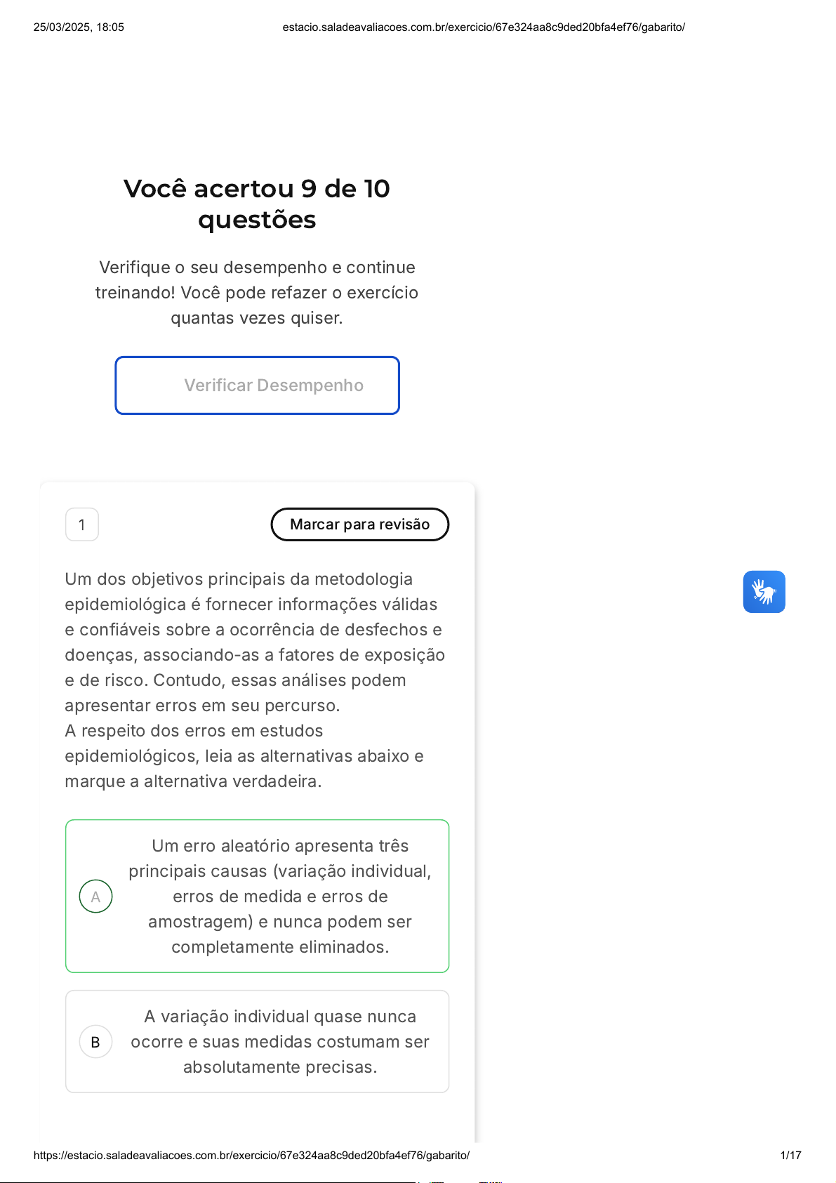 Você acertou 9 de 10 questões Verifique o seu desempenho e continue treinando! Você pode refazer o exercício quantas vezes quiser. Verificar Desempenho A B 1 Marcar para revisão Um dos objetivos principais da metodologia epidemiológica é fornecer informações válidas e confiáveis sobre a ocorrência de desfechos e doenças, associando-as a fatores de exposição e de risco. Contudo, essas análises podem apresentar erros em seu percurso. A respeito dos erros em estudos epidemiológicos, leia as alternativas abaixo e marque a alternativa verdadeira. Um erro aleatório apresenta três principais causas (variação individual, erros de medida e erros de amostragem) e nunca podem ser completamente eliminados. A variação individual quase nunca ocorre e suas medidas costumam ser absolutamente precisas. 25/03/2025, 18:05 estacio.saladeavaliacoes.com.br/exercicio/67e324aa8c9ded20bfa4ef76/gabarito/ https://estacio.saladeavaliacoes.com.br/exercicio/67e324aa8c9ded20bfa4ef76/gabarito/ 1/17 C D E Aumentar o tamanho amostral não impacta no erro aleatório de amostragem. Um estudo com um pequeno erro sistemático apresenta baixa precisão, que é afetada pelo tamanho da amostra. O viés de mensuração ocorre quando há uma diferença sistemática entre as características dos indivíduos selecionados para o estudo e aqueles que não foram selecionados. Resposta correta Parabéns, você selecionou a alternativa correta. Confira o gabarito comentado! Gabarito Comentado Para entender melhor, um erro aleatório ocorre quando o valor obtido na amostra é diferente, por acaso, do valor verdadeiro da população. As causas desses erros podem ser variações biológicas individuais, erros de medida e erros de amostragem. Esses erros nunca podem ser completamente eliminados dos estudos epidemiológicos, pois as análises são conduzidas em uma amostra da população, não na população inteira. Portanto, sempre haverá uma margem de erro. Vale ressaltar que o aumento do tamanho da amostra pode reduzir o erro aleatório, mas não o elimina completamente. Por outro lado, um estudo com um pequeno erro sistemático apresenta alta precisão (acurácia) e essa precisão não é afetada Questão 1 de 10 Corretas �9� Incorretas �1� Em branco �0� 1 2 3 4 5 6 7 8 9 10 Lista de exercícios Metodologia… Sair 25/03/2025, 18:05 estacio.saladeavaliacoes.com.br/exercicio/67e324aa8c9ded20bfa4ef76/gabarito/ https://estacio.saladeavaliacoes.com.br/exercicio/67e324aa8c9ded20bfa4ef76/gabarito/ 2/17 A B C D E pelo tamanho da amostra. O viés de seleção, mencionado na alternativa E, ocorre quando há uma diferença sistemática entre as características dos indivíduos selecionados para o estudo e aqueles que não foram selecionados. 2 Marcar para revisão Um estudo é identificado como válido quando há a ausência de erros sistemáticos e é considerado preciso quando há a ausência ou o mínimo possível de erros aleatórios. A ocorrência, tanto de erros aleatórios quanto sistemáticos, deve-se a muitas fontes. Sobre esse assunto, assinale a alternativa que contém corretamente o tipo de erro e uma possível fonte correspondente. Erro sistemático - variação individual. Erro aleatório - viés de seleção. Erro sistemático - erros de medida. Erro aleatório - viés de informação. Erro aleatório - erros de amostragem. 25/03/2025, 18:05 estacio.saladeavaliacoes.com.br/exercicio/67e324aa8c9ded20bfa4ef76/gabarito/ https://estacio.saladeavaliacoes.com.br/exercicio/67e324aa8c9ded20bfa4ef76/gabarito/ 3/17 Resposta correta Parabéns, você selecionou a alternativa correta. Confira o gabarito comentado! Gabarito Comentado Um erro aleatório ocorre quando o valor medido na amostra analisada no estudo diverge, por acaso, do verdadeiro valor da população. Este tipo de erro tem três principais causas: a variação biológica individual, erros de medida e erros de amostragem. Por outro lado, os erros sistemáticos, também conhecidos como viés, têm três fontes principais: os vieses de seleção, os vieses de informação e a situação de confusão ou confundimento. 3 Marcar para revisão De maneira geral, a incidência de acidentes ofídicos aumenta nos meses correspondentes ao verão (dezembro - fevereiro) em comparação com os meses mais frios. Associa- se esse aumento, por exemplo, à maior atividade humana nos trabalhos de campo durante os períodos mais quentes, facilitando dessa forma o contato acidental entre o indivíduo e as serpentes. Marque a alternativa que apresenta o tipo de variação temporal nos agravos de saúde. 25/03/2025, 18:05 estacio.saladeavaliacoes.com.br/exercicio/67e324aa8c9ded20bfa4ef76/gabarito/ https://estacio.saladeavaliacoes.com.br/exercicio/67e324aa8c9ded20bfa4ef76/gabarito/ 4/17 A B C D E Variação sazonal. Variação irregular. Tendência secular ou histórica. Variação cíclica. Variação reprodutiva. Resposta incorreta Opa! A alternativa correta é a letra A. Confira o gabarito comentado! Gabarito Comentado O enunciado descreve um cenário em que a incidência de acidentes ofídicos aumenta durante os meses de verão, em comparação com os meses mais frios. Isso é um exemplo de variação sazonal, que é a variação da incidência de uma doença que coincide com as estações do ano e depende de um conjunto de fatores, como a radiação solar, temperatura, umidade atmosférica, chuvas, entre outros. Portanto, a alternativa correta é a "Variação sazonal". As outras alternativas não se aplicam ao cenário descrito. A tendência secular ou histórica refere-se à análise das mudanças na frequência de uma doença (incidência, mortalidade etc.) por um longo período de tempo, geralmente décadas. A variação irregular é aquela em que o número de casos não varia de forma previsível. A 25/03/2025, 18:05 estacio.saladeavaliacoes.com.br/exercicio/67e324aa8c9ded20bfa4ef76/gabarito/ https://estacio.saladeavaliacoes.com.br/exercicio/67e324aa8c9ded20bf