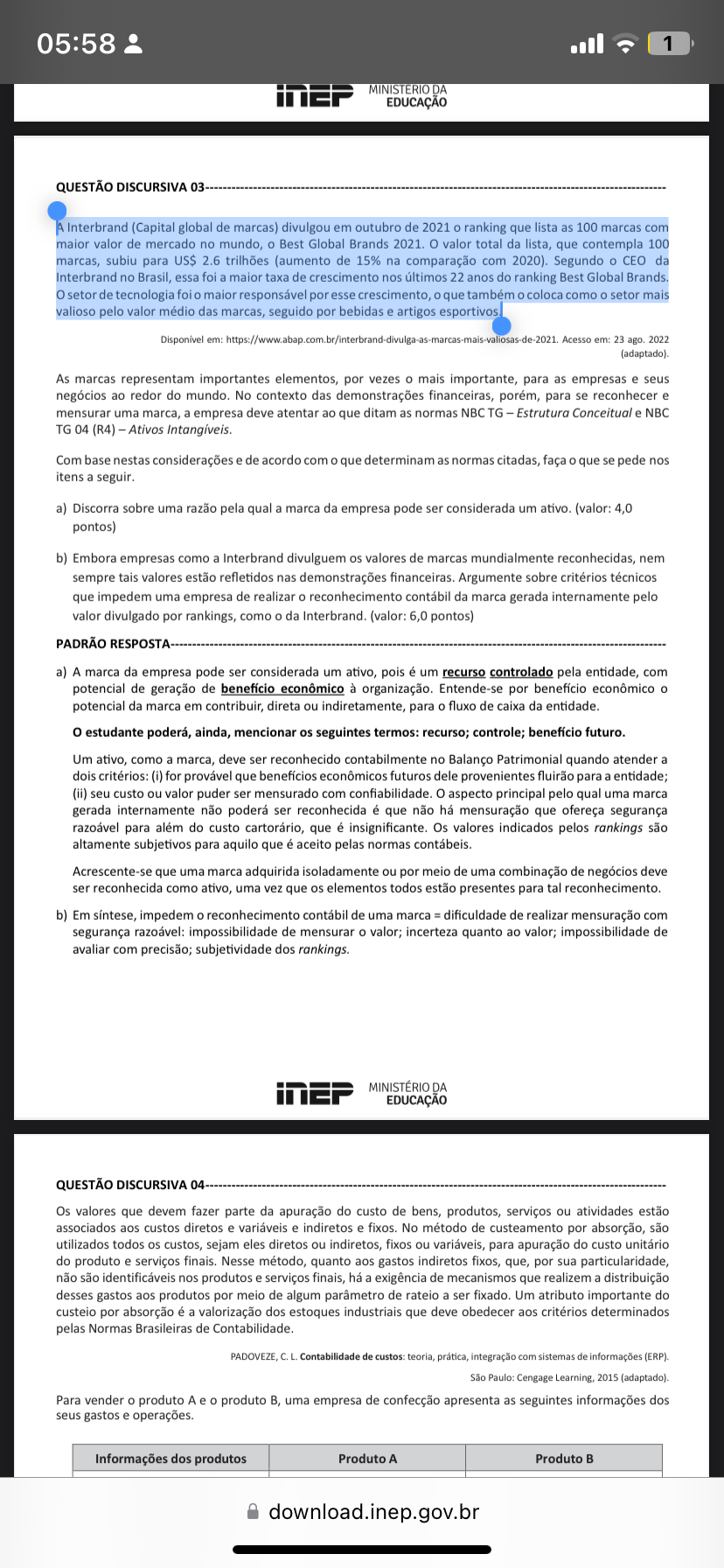 05:58 1 EDUCAÇÃO QUESTÃO DISCURSIVA 03 A Interbrand (Capital global de marcas) divulgou em outubro de 2021 ranking que lista as 100 marcas com maior valor de mercado no mundo, Best Global Brands 2021. o valor total da lista, que contempla 100 marcas, subiu para US$ 2.6 trilhões (aumento de 15% na comparação com 2020). Segundo CEO da Interbrand no Brasil, essa foi a maior taxa de crescimento nos últimos 22 anos do ranking Best Global Brands setor de tecnologia foi o maior responsável por esse crescimento, o que também C coloca como setor mais valioso pelo valor médio das marcas, seguido por bebidas e artigos esportivos Disponível em: Acesso em: 23 ago. 2022 (adaptado) As marcas representam importantes elementos, por vezes mais importante, para as empresas e seus negócios ao redor do mundo. No contexto das demonstrações financeiras, porém, para se reconhecer e mensurar uma marca, a empresa deve atentar ao que ditam as normas NBC TG Estrutura Conceitual e NBC TG 04 (R4) Ativos Intangíveis. Com base nestas considerações e de acordo com que determinam as normas citadas, faça que se pede nos itens a seguir. a) Discorra sobre uma razão pela qual a marca da empresa pode ser considerada um ativo. (valor: 4,0 pontos) b) Embora empresas como a Interbrand divulguem os valores de marcas mundialmente reconhecidas, nem sempre tais valores estão refletidos nas demonstrações Argumente sobre critérios técnicos que impedem uma empresa de realizar reconhecimento contábil da marca gerada internamente pelo valor divulgado por rankings, como o da (valor: 6,0 pontos) PADRÃO RESPOSTA a) A marca da empresa pode ser considerada um ativo, pois é um recurso controlado pela entidade, com potencial de geração de benefício econômico à organização. Entende-se por benefício econômico o potencial da marca em contribuir, direta ou indiretamente, para fluxo de caixa da o estudante poderá, ainda, mencionar os seguintes termos: recurso; controle; benefício futuro. Um ativo, como a marca, deve ser reconhecido contabilmente no Balanço Patrimonial quando atender a dois (i) for provável que benefícios econômicos futuros dele provenientes fluirão para a entidade; (ii) seu custo ou valor puder ser mensurado com o aspecto principal pelo qual uma marca gerada internamente não poderá ser reconhecida é que não há mensuração que ofereça segurança razoável para além do custo cartorário, que é insignificante. Os valores indicados pelos rankings são altamente subjetivos para aquilo que é aceito pelas normas Acrescente-se que uma marca adquirida isoladamente ou por meio de uma combinação de negócios deve ser reconhecida como ativo, uma vez que os elementos todos estão presentes para tal reconhecimento. b) Em impedem reconhecimento contábil de uma marca = dificuldade de realizar mensuração com segurança razoável: impossibilidade de mensurar valor; incerteza quanto ao valor; impossibilidade de avaliar com precisão; subjetividade dos rankings. MINISTÉRIO DA EDUCAÇÃO QUESTÃO DISCURSIVA 04 Os valores que devem fazer parte da apuração do custo de bens, produtos, serviços ou atividades estão associados aos custos diretos e variáveis e indiretos e fixos. No método de custeamento por absorção, são utilizados todos os custos, sejam eles diretos ou indiretos, fixos ou variáveis, para apuração do custo unitário do produto e serviços finais. Nesse método, quanto aos gastos indiretos fixos, que, por sua particularidade, não são identificáveis nos produtos e serviços finais, há a exigência de mecanismos que realizem a distribuição desses gastos aos produtos por meio de algum parâmetro de rateio a ser fixado. Um atributo importante do custeio por absorção é a valorização dos estoques industriais que deve obedecer aos critérios determinados pelas Normas Brasileiras de C.L. Contabilidade de custos: teoria, prática, integração com sistemas de informações São Paulo: Cengage Learning, 2015 Para vender produto A e produto B, uma empresa de confecção apresenta as seguintes informações dos seus gastos e operações. Informações dos produtos Produto A Produto B download.inep.gov.br