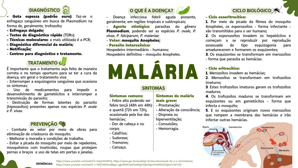 DIAGNÓSTICO QUE É A DOENÇA? CICLO BIOLÓGICO Gota espessa (padrão ouro): faz-se - Doença infecciosa febril aguda presente, Ciclo exoeritrocítico: esfregaço sanguíneo em busca de Plasmodium na geralmente, em regiões tropicais e subtropicais; 1. Por meio da picada da fêmea do mosquito forma de, geralmente, - Agente etiológico: parasitas do gênero Anopheles, os - forma infectante - - Esfregaço delgado; Plasmodium, podendo ser as espécies P. ovale, P. são transmitidos para ser humano; - Testes de diagnóstico rápido (TDRs); vivax, P. falciparum, P. malariae; 2. Os invadem os hepatócitos e - Técnicas moleculares: a mais utilizada é a PCR; - Vetor: mosquito Anopheles; começam a se reproduzir por reprodução - diferencial da malária; - Parasito heteroxênico: assexuada do tipo esquizogonia para Notificação; Hospedeiro intermediário - humanos; amadurecerem e formarem os esquizontes; - Centros para diagnóstico e tratamento. Hospedeiro definitivo - mosquito Anopheles. 3. Os esquizontes se transformam em forma que parasita as TRATAMENTO É importante que tratamento seja feito de maneira MALÁRIA - Ciclo eritrocítico: correta e no tempo oportuno para se ter a cura da 1 invadem as doença, em geral tratamento visa: 2. se transformam em Interromper a esquizogonia sanguínea que ocasiona imaturos; os sintomas; SINTOMAS 3. Estes trofozoitos imaturos geram os Uso de medicamentos para impedir maduros; desenvolvimento de e interromper a Sintomas comuns: Sintomas da malária 4. Os trofozoitos maduros se transformam em transmissão do parasito; Destruição de formas latentes do parasito - Febre alta podendo ser mais grave: esquizontes ou em - forma que presentes apenas nas espécies P. ovale febre terçã (48h em 48h) - Prostanação; infecta mosquito; e P. vivax. e (72h em 72h), - Alteração da consciência; 5. E os esquizontes originam novos merozoítos ocasionada pela lise das - Dispneia ou que rompem a membrana das hemácias e irão hiperventilação; infectar outras PREVENÇÃO - Dor de cabeça e no - Convulsões; Zigoto - Combate ao vetor por meio de obras para - Hemorragia. Gametocitos corpo; eliminação de criadouros do mosquito. Calafrios; Melhorar a moradia e condições de trabalho. Sudorese; - Evitar a picada do mosquito por meio de repelentes, Tremores; mosquiteiros com inseticidas, roupas que protejam Cansaço. Esporozoito Merozoito pernas e braços e uso de telas em portas e janelas.