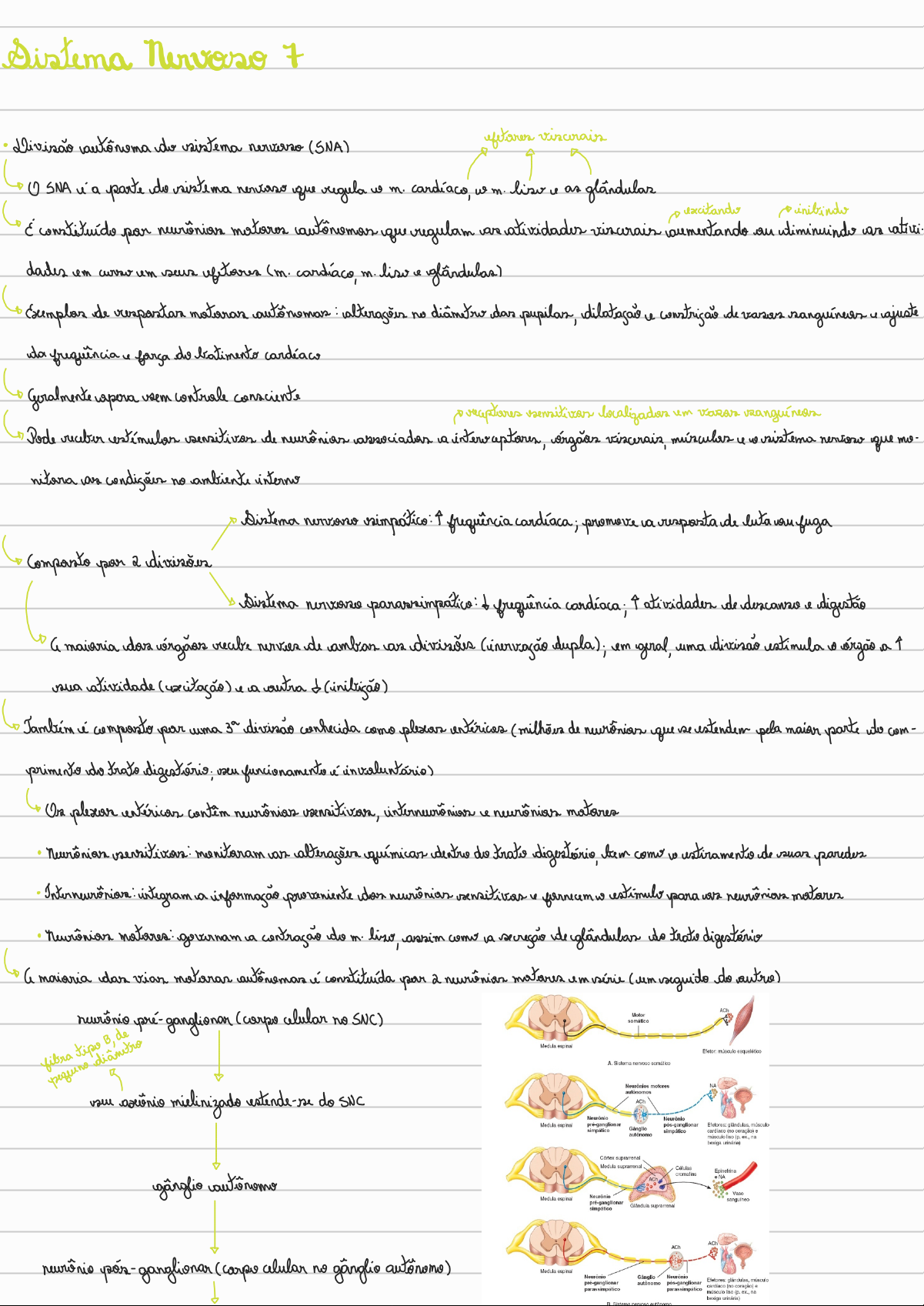 7 do sistema nerverso (SNA) SNA i a parte do sistema w m. m. as glandular inibindo E constituido par que regulam are atividades was dades em um (m. de : no diametro dar de u ajuste frequincia do batimento controle consciente Pode de a u w sistema que nitora as no ambiente interno 4 frequincia cardiaca; promove resporta de luta fuga 2 frequencia 4 atividader de de ambar as dupla); em uma estimula a 4 atividade a outra i divisao como de que se estendem pela parte com- primento trato funcionamento i involuntario) contin u do w estiramento de pareder integram a sensitives w estimulo para a do m assim a do maioria dar viar i par 2 do ACh pre-ganglionan celular no SNC) Motor somático fibra Medula espinal músculo esquelético Sistema somático Neurônios motores NA do SNC Neurônio Medula espinal pré-ganglionar pós-gangliona Efetores músculo Ganglio coração) músculo liso bexiga urinaria) Cortex Medula suprarrenal Células Epinefrina cromafins ganglio Vaso Medula espinal Neurônio pré-ganglionar sanguineo suprarrenal ACh ACh no ganglio autonomo) Medula espinal Neurônio Ganglio Neurônio pré-ganglionar autônomo pós-ganglionar Efetores músculo cardiaco (no liso bexiga Sistemaestende-se do liberam apenar na como man an (m. m. libram tanto ach (NA) Em motor da medula interna das glandular u (NA) dar Componenter nor laterain cingenta uta medula 12 war 2 3 hamada de divisio w Na divisão was celulares ficam VII, IX no na cinzenta lateral sacrain da medula i hamada divisao nacral formam w : locain de entre price um 2 do verticalmente lado da use do acima do como The de cervicair superiores medior I inferiores Como da medula or pre-ganglionares u 2- ia frente caluna a grander arterior do Or principair do do diafragma perto da superior junto a arteria inferior aorticorrenal u renal:a maioria proxima are dentro de Na ganglior w ciliar, demain pre DIVISÃO (toracolombar) Legenda: Distribuidos principalmente para (craniossacral) Legenda: Neurônios pré-ganglionares liso dos vasos sanguíneos destes Neurônios Distribuídos principalmente para Neurônios pós -ganglionares Nervo Neurônios pós-ganglionares músculo liso destes oculomotor (III) terminais Olho Glândula pineal lacrimal Olho Glândula lacrimal Membrana mucosa Glândulas palato Nervo Membrana mucosa facial Ganglio do nariz palato submandibula ciliar parótida sublingual submandibular Coração Fibras musculares atriais Medula No SA/AV pterigopalatino Fibras musculares Fibras musculares Medula Coração atriais ventriculares espinal SA/AV Traqueia submandibular Plexo C4 Nervo Laringe C5 glossofaringeo (IX) Traqueia cervical médio Pulmões Nervo C7 cervical vago (X) C8 Ganglio inferior Pulmões Plexo Pele T1 pulmonar Figado, vesicula C8 T2 biliar e ductos T3 biliares T1 Nervo T4 T2 vesicula biliar T5 maior Estômago T3 e ductos biliares Baço T6 celiaco Colo T4 Pâncreas T7 transvers T5 sudoripara Ganglio T8 T6 Colo Pancreas eretores Nervo do pelo T7 T9 Colo Tecido adiposo T10 descendente T8 Colo ascendente Colo Vasos sanguíneos T11 Nervo T9 T12 Colo sigmoide Colo descendente (cada tronco Reto T10 ascendente inerva L1 imo suprarrenal T11 Colo visceras) L2 superior Rim T12 sigmoide L3 Reto L4 Ureter L1 L5, renal S1 L3 Ureter do L4 Nervos tronco S2 lombar Ganglio esplancnicos (em L5 S3 mesentérico pélvicos ambos lados) inferior Ganglios S2 pré-vertebrais Coccigeo (fundido) S3 Bexiga Genitais S4 externos Plexo S5 hipogástrico Coccigeo Bexiga urinaria Genitais externos Útero para or do podem das Fazendo vainapser com no que atinge primeiramente 2. Pode para inferior de fazer com 3 Pode continuar sem do ganglio simpatico para terminar ganglio ali 4 Pode passar, usem do do simpatico ganglio em fins da medula que nalmente semelhantis Uma vinica fibra pode com + de 20 permitindo todo or or inervam Na fazem dentro w apenar 4 5 que parassimpaticas mair no obdome u was formam was loca- longer que podem Principain supre supre a bronquicau Nervo periarterial cefálico Ramo posterior do nervo espinal Ramo anterior do nervo espinal maior JO inervando esto mago Efetores viscerais: glândulas lacrimais, mucosa nasal vasos sanguíneos músculos eretores do pelo face vesicula Nervo simpatico supre delgado grasso coração Corno posterior Raiz posterior nervo espinal w no Parke de para w Acima de T1 Corno Cadeia lateral Efetores Nervo que supre as Corno vasos espinal anterior eretores Medula espinal do pelo pele do Raiz anterior do (segmento torácico tronco tronco lombar superior) membros Ramo Nervo comunicante renal: supre rins cinzento 3 Ramo comunicante branco pré-vertebral visceral estomago Cortex Medula suprarrenal cromafim Abaixo Legenda: Glândula Neurônios pré-ganglionares simpaticos Neurônios simpaticos Vista anterior do SNA calinergicas adrenirgicar com base no para or integrais da membrana localizadas na membrana do all do SNA liberam (GCh) u pre- ganglionares 2 inervam glandular 3. integrain membrana vesicular i liberada par e se liga a receptores na membrana Existem em cilular cromafins da na pela nicoti- na mm. cardiaces inervadas Receptor Célula efetora nicotínico Receptor maioria das glandular pela muscarina ACh adrenérgico ativa nicatina muscarina para NA Neurônio Neurônio -ganglionar pré-ganglionar Gânglio A. Divisão inervação para maioria dos tecidos efetores de nicotinicar pela ach causa u da cilula Receptor Receptor muscarínico pode ser neuronio autonomo muscular a nicotínico de pela ach causa a per causa a hi- ACh ACh Célula da glândula sudorípara de cibula particular or a actil glândulas B. Divisão simpatica inervação para maioria das Receptor Receptor Célula efetora calina i rapidamente inativada pela enzima nicotínico calinergican curta ACh ACh DivisãoSNA, adrenirgican liberam (NA), chamada ude a maioria dar neuronian Narepinefrina (NA) um On respondem ia atuar user liberada par a epinefrina i em fenda wm u excitam, ligam to B2 On 133, no marrom, na membrana da da a NA i pelo neuronio degradad