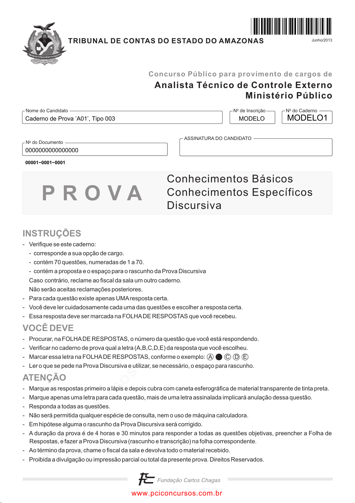 pcimarkpci MjgwNDowMjE0OjkwNjk6NGYyNTphNGFkOmVmZmY6ZmU1YjozNDQ3:U3VuLCAyMyBNYXIgMjAyNSAwMjowOTo1MyAtMDMwMA== www.pciconcursos.com.br N do CadernooN de Inscriçãoo ASSINATURA DO CANDIDATO N do Documentoo Nome do Candidato P R O V A A C D E Junho/2013 Analista Técnico de Controle Externo Ministério Público Concurso Público para provimento de cargos de Conhecimentos Básicos Conhecimentos Específicos Discursiva INSTRUÇÕES VOCÊ DEVE ATENÇÃO - Verifique se este caderno: - corresponde a sua opção de cargo. - contém 70 questões, numeradas de 1 a 70. - contém a proposta e o espaço para o rascunho da Prova Discursiva Caso contrário, reclame ao fiscal da sala um outro caderno. Não serão aceitas reclamações posteriores. - Para cada questão existe apenas UMAresposta certa. - Você deve ler cuidadosamente cada uma das questões e escolher a resposta certa. - Essa resposta deve ser marcada na FOLHADE RESPOSTAS que você recebeu. - Procurar, na FOLHADE RESPOSTAS, o número da questão que você está respondendo. - Verificar no caderno de prova qual a letra (A,B,C,D,E) da resposta que você escolheu. - Marcar essa letra na FOLHADE RESPOSTAS, conforme o exemplo: - Ler o que se pede na Prova Discursiva e utilizar, se necessário, o espaço para rascunho. - Marque as respostas primeiro a lápis e depois cubra com caneta esferográfica de material transparente de tinta preta. - Marque apenas uma letra para cada questão, mais de uma letra assinalada implicará anulação dessa questão. - Responda a todas as questões. - Não será permitida qualquer espécie de consulta, nem o uso de máquina calculadora. - Em hipótese alguma o rascunho da Prova Discursiva será corrigido. - A duração da prova é de 4 horas e 30 minutos para responder a todas as questões objetivas, preencher a Folha de Respostas, e fazer a Prova Discursiva (rascunho e transcrição) na folha correspondente. - Ao término da prova, chame o fiscal da sala e devolva todo o material recebido. - Proibida a divulgação ou impressão parcial ou total da presente prova. Direitos Reservados. TRIBUNAL DE CONTAS DO ESTADO DO AMAZONAS Caderno de Prova ’A01’, Tipo 003 MODELO 0000000000000000 MODELO1 00001−0001−0001 www.pciconcursos.com.br pcimarkpci MjgwNDowMjE0OjkwNjk6NGYyNTphNGFkOmVmZmY6ZmU1YjozNDQ3:U3VuLCAyMyBNYXIgMjAyNSAwMjowOTo1MyAtMDMwMA== www.pciconcursos.com.br 2 TCEAM-An.Tec.Cont.Ext.-Ministério Público-A01 CONHECIMENTOS BÁSICOS Língua Portuguesa Atenção: Para responder às questões de números 1 a 8 con- sidere o texto abaixo. Memórias de um avestruz literário Modéstia à parte, fui um menino bem esquisitinho. De- pois, há quem diga, piorei. Não é verdade. Não daria conta de superar em bizarria − em chatice, vá lá − o frangote que fui na puberdade. O turbilhão de hormônios não explica tudo. Não me lembro de ter conhecido um ser que desfiasse o meu vocabu- lário de então. Talvez o Antônio Houaiss. Não era por acaso que lá no bairro volta e meia alguém me interpelava: − Ei, irmão do Rodrigo, vem falar difícil pra gente! Não cheguei a topar provocações, mas certa vez deixei de queixo caído um tio que veio xeretar o que havia no meu pra- to. − O que temos aí? − Lipídios, glicídios e protídeos. Foi o que bastou para ganhar do tio Samuel o apelido, infelizmente efêmero, de Zé Lipídio. Ouvia entoar a ave galiforme da família dos fasianídeos − ou, se você prefere, ouvia o galo cantar − e tratava logo de uti- lizar o vocábulo recém-aprendido, sem o cuidado de saber o que estava dizendo. Arranquei gargalhadas de meu pai com um “diabo aquático” em vez de “diabo a quatro”. Escaldado, tratei de me tornar freguês do dicionário, que até então, como os ou- tros garotos, folheava apenas para garimpar palavrões, com es- pecial atenção aos que designassem acidentes geográficos da anatomia humana. Ao contrário dos companheiros, porém, mantive o hábito mesmo depois que pudemos encarar ao vivo o que conhe- cíamos apenas do dicionário. Só que agora os palavrões, diga- mos, eram outros: na minha insuportável chatice adolescente, o que eu buscava eram palavras estranhas − abstrusas, diria eu na época − que, jogadas na roda como granada verbal, tives- sem o poder de silenciar a audiência ignara. Meu amigo Jaime e eu chegamos a inventar umas tantas, nenhuma delas mais im- pactante que “cripteriótico”, cujo significado, se é que tinha al- gum, variava conforme a circunstância em que era disparada. Devo ao Laudelino uma coleção de excentricidades vocabu- lares que tive o bom senso de jamais utilizar. Mas ainda sei o que é almadraque. Não, não vou traduzir. Vá catar no dicioná- rio, seu alóbrogo. (Humberto Werneck. Esse inferno vai acabar. Porto Alegre: Arquipélago Editorial, 2011, pp. 123/124) 1. O reconhecimento de que foi um frangote bizarro deve-se ao fato de que o autor (A) obrigava-se a consultar dicionários, como o de Antônio Houaiss, diante de textos difíceis. (B) provocava os colegas lançando-lhes palavrões de cuja significação ninguém suspeitava. (C) lançava mão, sem perder a modéstia, de um voca- bulário pouco usual para sua idade. (D) apregoava sem qualquer modéstia um vasto vocabu- lário que simulava possuir e dominar. (E) fazia uso de um amplo e incomum repertório de pa- lavras, inclusive algumas inventadas. 2. Considerando-se o contexto, traduz-se adequadamente o sentido de um segmento em: (A) a audiência ignara (8 o parágrafo) = a recepção anô- nima (B) superar em bizarria (1 o parágrafo) = ir além na ex- centricidade (C) turbilhão de hormônios (1 o parágrafo) = congestão de excreções (D) infelizmente efêmero (6 o parágrafo) = afortunada- mente transitório (E) para garimpar palavrões (7 o parágrafo) = a fim de discriminar maledicências _________________________________________________________ 3. Atente para as seguintes afirmações: I. No primeiro parágrafo, a afirmação o turbilh