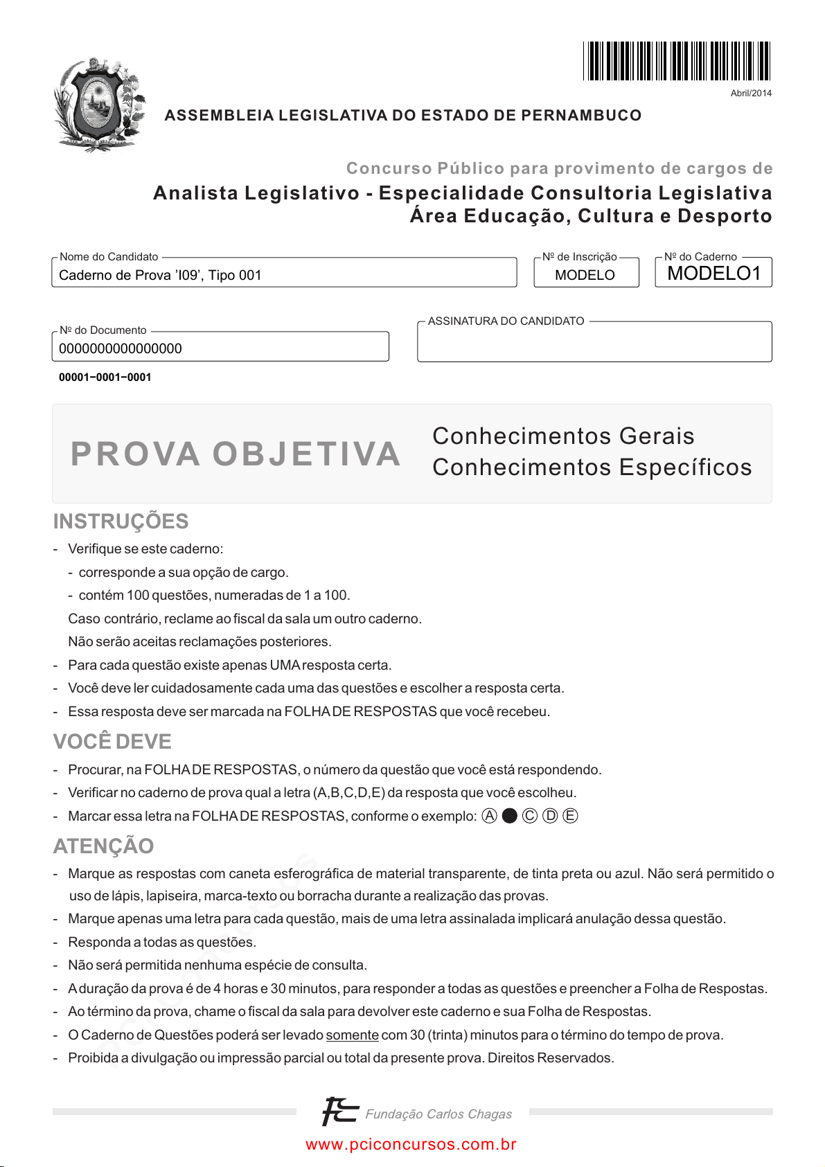 pcimarkpci MjgwNDowMjE0OjkwNjk6NGYyNTphNGFkOmVmZmY6ZmU1YjozNDQ3:U3VuLCAyMyBNYXIgMjAyNSAwMTo1Mjo1MyAtMDMwMA== www.pciconcursos.com.br N do CadernooN de Inscriçãoo ASSINATURA DO CANDIDATO N do Documentoo Nome do Candidato Abril/2014 ASSEMBLEIA LEGISLATIVA DO ESTADO DE PERNAMBUCO Analista Legislativo - Especialidade Consultoria Legislativa Área Educação, Cultura e Desporto Concurso Público para provimento de cargos de PROVA OBJETIVA Conhecimentos Gerais Conhecimentos Específicos INSTRUÇÕES VOCÊ DEVE ATENÇÃO - Verifique se este caderno: - corresponde a sua opção de cargo. - contém 100 questões, numeradas de 1 a 100. Caso contrário, reclame ao fiscal da sala um outro caderno. Não serão aceitas reclamações posteriores. - Para cada questão existe apenas UMAresposta certa. - Você deve ler cuidadosamente cada uma das questões e escolher a resposta certa. - Essa resposta deve ser marcada na FOLHADE RESPOSTAS que você recebeu. - Procurar, na FOLHADE RESPOSTAS, o número da questão que você está respondendo. - Verificar no caderno de prova qual a letra (A,B,C,D,E) da resposta que você escolheu. - Marcar essa letra na FOLHADE RESPOSTAS, conforme o exemplo: - - Marque apenas uma letra para cada questão, mais de uma letra assinalada implicará anulação dessa questão. - Responda a todas as questões. - Não será permitida nenhuma espécie de consulta. - Aduração da prova é de 4 horas e 30 minutos, para responder a todas as questões e preencher a Folha de Respostas. - Ao término da prova, chame o fiscal da sala para devolver este caderno e sua Folha de Respostas. - O Caderno de Questões poderá ser levado com 30 (trinta) minutos para o término do tempo de prova. - Proibida a divulgação ou impressão parcial ou total da presente prova. Direitos Reservados. Marque as respostas com caneta esferográfica de material transparente, de tinta preta ou azul. Não será permitido o uso de lápis, lapiseira, marca-texto ou borracha durante a realização das provas. somente A C D E Caderno de Prova ’I09’, Tipo 001 MODELO 0000000000000000 MODELO1 00001−0001−0001 www.pciconcursos.com.br pcimarkpci MjgwNDowMjE0OjkwNjk6NGYyNTphNGFkOmVmZmY6ZmU1YjozNDQ3:U3VuLCAyMyBNYXIgMjAyNSAwMTo1Mjo1MyAtMDMwMA== www.pciconcursos.com.br 2 ALEPE-Conhecimentos Gerais1 CONHECIMENTOS GERAIS Língua Portuguesa Atenção: O texto abaixo refere-se às questões de números 1 a 5. 1 5 10 15 20 25 30 35 No século VI a.C., os primeiros filósofos gregos preocuparam-se em conhecer os elementos constitutivos das coisas. Eles investigaram a Natureza, à busca de um princípio estável, comum a todos os seres, que explicasse a sua origem e as suas transformações. Físicos, como foram chamados por Aristóteles, esses primeiros filósofos, de Tales a Anaxímenes, fundaram uma tradição de estudo da Natureza, seguida e aprofundada, entre outros, por Heráclito, Pitágoras, Demócrito. Na segunda metade do século V a.C., os Sofistas, professores da juventude ateniense numa época de crise, inspirados mais pelo interesse prático do que por uma intenção teórica pura, debateram, entre outras ideias, o Bem, a Virtude, o Belo, a Lei e a Justiça, formulando, a respeito de seu conteúdo, teses ousadas e contraditórias. Não obstante a falta de rigor e o propósito de confundir os adversários, com a habilidade de raciocínio que os notabilizou, os Sofistas tiveram o indiscutível mérito de introduzir, no estudo da sociedade e da cultura, o ponto de vista reflexivo-crítico que caracteriza a filosofia. Mas seria preciso esperar por Sócrates (470-399 a.C.), misto de pedagogo e de filósofo, que procurou definir os valores morais, as profissões, o governo e o comportamento social, para que esse ponto de vista se insinuasse também na apreciação das artes. Sócrates, que discorria sobre todos os assuntos humanos, entrou, certa vez, no ateliê do pintor Parrásio, e a este perguntou o que a Pintura poderia representar. Platão (427-347 a.C.), discípulo de Sócrates, fez, no seu diálogo A república, um confronto, que se tornou decisivo pelas implicações filosóficas que encerra, entre Arte e Realidade. Levando em conta o caráter representativo da Pintura e da Escultura, o filósofo concluía, nesse diálogo, não só que essas artes estão muito abaixo da verdadeira Beleza que a inteligência humana se destina a conhecer, como também que, em comparação com os objetivos da ciência, é supérflua a atividade daqueles que pintam e esculpem, pois o que 40 produzem é inconsistente e ilusório. Por outro lado, Platão observa que a Poesia e a Música exercem influência muito grande sobre os nossos estados de ânimo, e que afetam, positiva ou negativamente, o comportamento moral dos homens. (Adaptado de: NUNES, Benedito. Introdução à filoso- fia da arte. 4. ed., São Paulo: Ática, 1999, p. 7 e 8) 1. No texto, o autor (A) comenta o percurso da filosofia com o intuito de comprovar que o pensamento filosófico se eleva sobre todas as outras formas de conhecimento, principalmente a relacionada ao universo das artes. (B) objetiva, entre outros aspectos, demonstrar que a denominação que Aristóteles deu aos primeiros filósofos constitui equívoco que a própria história se encarregou de corrigir. (C) debate distintas perspectivas da reflexão filosófica, ao longo dos séculos, para evidenciar o papel decisivo que Platão desempenha na pesquisa da inteligência humana. (D) cita pensadores para evidenciar caminho consti- tutivo do pensamento filosófico, considerando distin- tos aspectos sobre os quais recaíram as inquieta- ções desses intelectuais nesse percurso. (E) firma, respeitando a cronologia, a relevância de cada um dos pensadores que compõem a história da Filosofia até seu apogeu, quando esta reconhece o significativo papel das artes plásticas na área filosófica. _________________________________________________________ 2. Sobre os Sofistas, tal como caracterizados no texto, 
