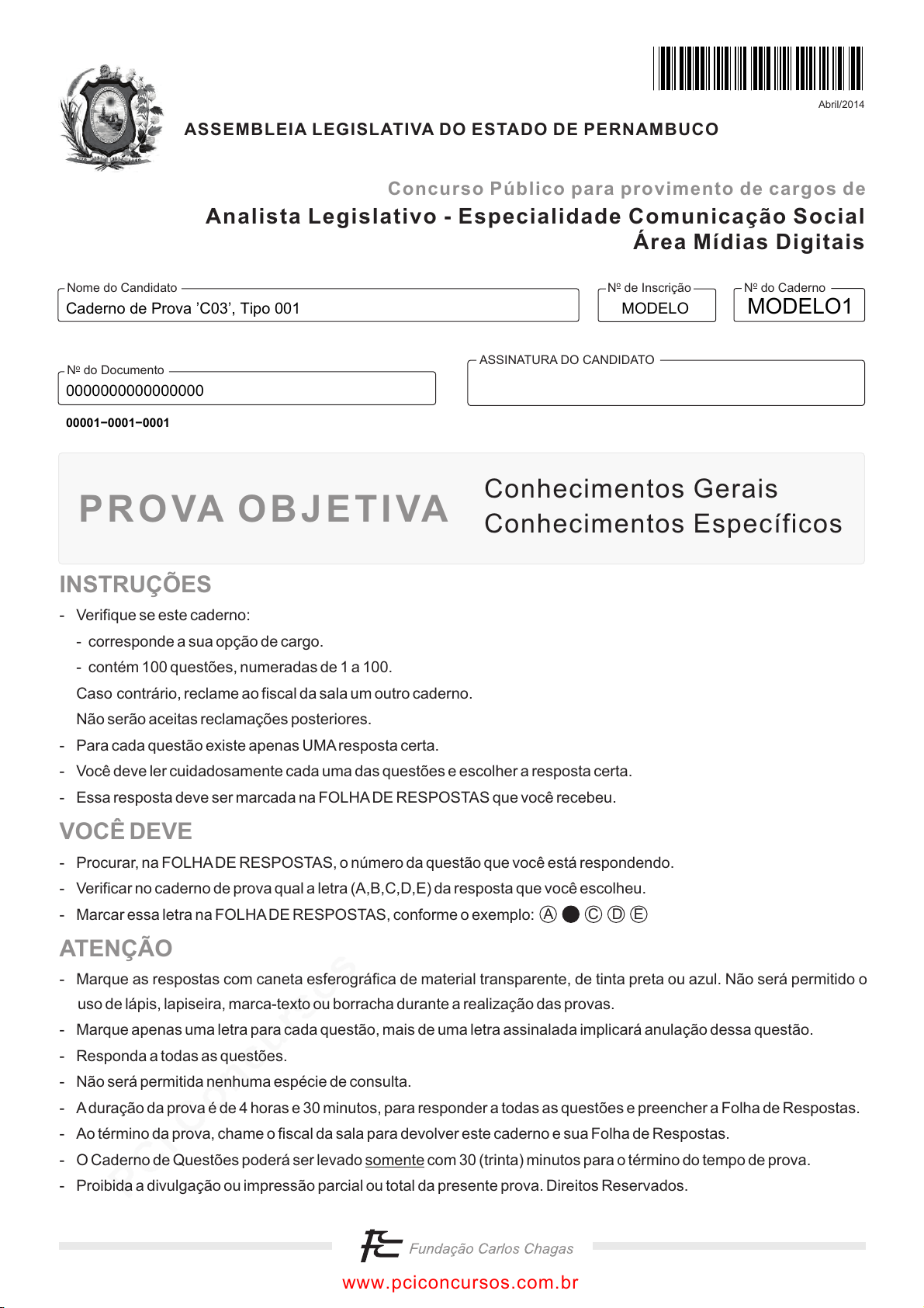 pcimarkpci MjgwNDowMjE0OjkwNjk6NGYyNTphNGFkOmVmZmY6ZmU1YjozNDQ3:U3VuLCAyMyBNYXIgMjAyNSAwMTo1MDo1OCAtMDMwMA== www.pciconcursos.com.br N do CadernooN de Inscriçãoo ASSINATURA DO CANDIDATO N do Documentoo Nome do Candidato Abril/2014 ASSEMBLEIA LEGISLATIVA DO ESTADO DE PERNAMBUCO Analista Legislativo - Especialidade Comunicação Social Área Mídias Digitais Concurso Público para provimento de cargos de PROVA OBJETIVA Conhecimentos Gerais Conhecimentos Específicos INSTRUÇÕES VOCÊ DEVE ATENÇÃO - Verifique se este caderno: - corresponde a sua opção de cargo. - contém 100 questões, numeradas de 1 a 100. Caso contrário, reclame ao fiscal da sala um outro caderno. Não serão aceitas reclamações posteriores. - Para cada questão existe apenas UMAresposta certa. - Você deve ler cuidadosamente cada uma das questões e escolher a resposta certa. - Essa resposta deve ser marcada na FOLHADE RESPOSTAS que você recebeu. - Procurar, na FOLHADE RESPOSTAS, o número da questão que você está respondendo. - Verificar no caderno de prova qual a letra (A,B,C,D,E) da resposta que você escolheu. - Marcar essa letra na FOLHADE RESPOSTAS, conforme o exemplo: - - Marque apenas uma letra para cada questão, mais de uma letra assinalada implicará anulação dessa questão. - Responda a todas as questões. - Não será permitida nenhuma espécie de consulta. - Aduração da prova é de 4 horas e 30 minutos, para responder a todas as questões e preencher a Folha de Respostas. - Ao término da prova, chame o fiscal da sala para devolver este caderno e sua Folha de Respostas. - O Caderno de Questões poderá ser levado com 30 (trinta) minutos para o término do tempo de prova. - Proibida a divulgação ou impressão parcial ou total da presente prova. Direitos Reservados. Marque as respostas com caneta esferográfica de material transparente, de tinta preta ou azul. Não será permitido o uso de lápis, lapiseira, marca-texto ou borracha durante a realização das provas. somente A C D E Caderno de Prova ’C03’, Tipo 001 MODELO 0000000000000000 MODELO1 00001−0001−0001 www.pciconcursos.com.br pcimarkpci MjgwNDowMjE0OjkwNjk6NGYyNTphNGFkOmVmZmY6ZmU1YjozNDQ3:U3VuLCAyMyBNYXIgMjAyNSAwMTo1MDo1OCAtMDMwMA== www.pciconcursos.com.br 2 ALEPE-Conhecimentos Gerais1 CONHECIMENTOS GERAIS Língua Portuguesa Atenção: O texto abaixo refere-se às questões de números 1 a 5. 1 5 10 15 20 25 30 35 No século VI a.C., os primeiros filósofos gregos preocuparam-se em conhecer os elementos constitutivos das coisas. Eles investigaram a Natureza, à busca de um princípio estável, comum a todos os seres, que explicasse a sua origem e as suas transformações. Físicos, como foram chamados por Aristóteles, esses primeiros filósofos, de Tales a Anaxímenes, fundaram uma tradição de estudo da Natureza, seguida e aprofundada, entre outros, por Heráclito, Pitágoras, Demócrito. Na segunda metade do século V a.C., os Sofistas, professores da juventude ateniense numa época de crise, inspirados mais pelo interesse prático do que por uma intenção teórica pura, debateram, entre outras ideias, o Bem, a Virtude, o Belo, a Lei e a Justiça, formulando, a respeito de seu conteúdo, teses ousadas e contraditórias. Não obstante a falta de rigor e o propósito de confundir os adversários, com a habilidade de raciocínio que os notabilizou, os Sofistas tiveram o indiscutível mérito de introduzir, no estudo da sociedade e da cultura, o ponto de vista reflexivo-crítico que caracteriza a filosofia. Mas seria preciso esperar por Sócrates (470-399 a.C.), misto de pedagogo e de filósofo, que procurou definir os valores morais, as profissões, o governo e o comportamento social, para que esse ponto de vista se insinuasse também na apreciação das artes. Sócrates, que discorria sobre todos os assuntos humanos, entrou, certa vez, no ateliê do pintor Parrásio, e a este perguntou o que a Pintura poderia representar. Platão (427-347 a.C.), discípulo de Sócrates, fez, no seu diálogo A república, um confronto, que se tornou decisivo pelas implicações filosóficas que encerra, entre Arte e Realidade. Levando em conta o caráter representativo da Pintura e da Escultura, o filósofo concluía, nesse diálogo, não só que essas artes estão muito abaixo da verdadeira Beleza que a inteligência humana se destina a conhecer, como também que, em comparação com os objetivos da ciência, é supérflua a atividade daqueles que pintam e esculpem, pois o que 40 produzem é inconsistente e ilusório. Por outro lado, Platão observa que a Poesia e a Música exercem influência muito grande sobre os nossos estados de ânimo, e que afetam, positiva ou negativamente, o comportamento moral dos homens. (Adaptado de: NUNES, Benedito. Introdução à filoso- fia da arte. 4. ed., São Paulo: Ática, 1999, p. 7 e 8) 1. No texto, o autor (A) comenta o percurso da filosofia com o intuito de comprovar que o pensamento filosófico se eleva sobre todas as outras formas de conhecimento, principalmente a relacionada ao universo das artes. (B) objetiva, entre outros aspectos, demonstrar que a denominação que Aristóteles deu aos primeiros filósofos constitui equívoco que a própria história se encarregou de corrigir. (C) debate distintas perspectivas da reflexão filosófica, ao longo dos séculos, para evidenciar o papel decisivo que Platão desempenha na pesquisa da inteligência humana. (D) cita pensadores para evidenciar caminho consti- tutivo do pensamento filosófico, considerando distin- tos aspectos sobre os quais recaíram as inquieta- ções desses intelectuais nesse percurso. (E) firma, respeitando a cronologia, a relevância de cada um dos pensadores que compõem a história da Filosofia até seu apogeu, quando esta reconhece o significativo papel das artes plásticas na área filosófica. _________________________________________________________ 2. Sobre os Sofistas, tal como caracterizados no texto, é correto afirmar