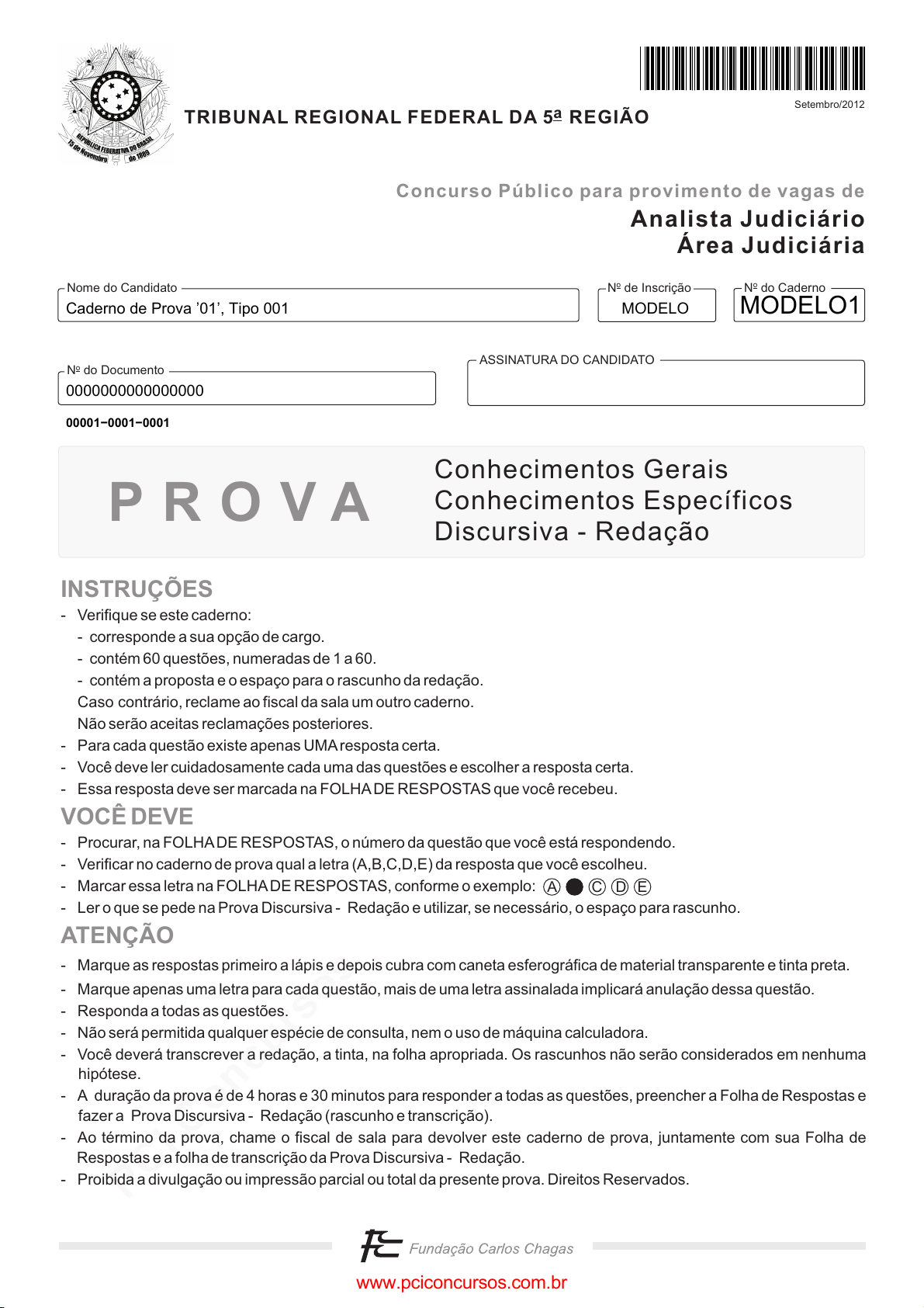 pcimarkpci MjgwNDowMjE0OjkwNjk6NGYyNTphNGFkOmVmZmY6ZmU1YjozNDQ3:U3VuLCAyMyBNYXIgMjAyNSAwMTo0ODo1MCAtMDMwMA== www.pciconcursos.com.br N do CadernooN de Inscriçãoo ASSINATURA DO CANDIDATO N do Documentoo Nome do Candidato Conhecimentos Gerais Conhecimentos Específicos Discursiva - Redação P R O V A INSTRUÇÕES VOCÊ DEVE ATENÇÃO - Verifique se este caderno: - corresponde a sua opção de cargo. - contém 60 questões, numeradas de 1 a 60. - contém a proposta e o espaço para o rascunho da redação. Caso contrário, reclame ao fiscal da sala um outro caderno. Não serão aceitas reclamações posteriores. - Para cada questão existe apenas UMAresposta certa. - Você deve ler cuidadosamente cada uma das questões e escolher a resposta certa. - Essa resposta deve ser marcada na FOLHADE RESPOSTAS que você recebeu. - Procurar, na FOLHADE RESPOSTAS, o número da questão que você está respondendo. - Verificar no caderno de prova qual a letra (A,B,C,D,E) da resposta que você escolheu. - Marcar essa letra na FOLHADE RESPOSTAS, conforme o exemplo: - Ler o que se pede na Prova Discursiva - Redação e utilizar, se necessário, o espaço para rascunho. - Marque as respostas primeiro a lápis e depois cubra com caneta esferográfica de material transparente e tinta preta. - Marque apenas uma letra para cada questão, mais de uma letra assinalada implicará anulação dessa questão. - Responda a todas as questões. - Não será permitida qualquer espécie de consulta, nem o uso de máquina calculadora. - Você deverá transcrever a redação, a tinta, na folha apropriada. Os rascunhos não serão considerados em nenhuma hipótese. - A duração da prova é de 4 horas e 30 minutos para responder a todas as questões, preencher a Folha de Respostas e fazer a Prova Discursiva - Redação (rascunho e transcrição). - Ao término da prova, chame o fiscal de sala para devolver este caderno de prova, juntamente com sua Folha de Respostas e a folha de transcrição da Prova Discursiva - Redação. - Proibida a divulgação ou impressão parcial ou total da presente prova. Direitos Reservados. A C D E Analista Judiciário Área Judiciária Concurso Público para provimento de vagas de Setembro/2012 TRIBUNAL REGIONAL FEDERAL DA 5 REGIÃOa Caderno de Prova ’01’, Tipo 001 MODELO 0000000000000000 MODELO1 00001−0001−0001 www.pciconcursos.com.br pcimarkpci MjgwNDowMjE0OjkwNjk6NGYyNTphNGFkOmVmZmY6ZmU1YjozNDQ3:U3VuLCAyMyBNYXIgMjAyNSAwMTo0ODo1MCAtMDMwMA== www.pciconcursos.com.br 2 TRF5R-Conhecimentos Gerais1 CONHECIMENTOS GERAIS Português Atenção: Para responder às questões de números 1 a 8, considere o texto abaixo. O arroz da raposa Julio Cortázar tem um conto que sai de um palíndromo − “Satarsa”. Um menino brinca de desarticular as palavras. No fundo, um escritor é um sujeito que pela vida afora continua a mexer com as palavras. Para diante delas, estranha esta, questiona aquela. O menino de Cortázar, que devia ser ele mesmo, virava a palavra pelo avesso e se encantava. Saber que a leitura pode ser feita de trás para diante é uma aventura. E às vezes dá certo. No conto “Satarsa”, a palavra é ROMA. Lida ao contrário, também faz sentido. Deixa de ser ROMA e vira AMOR. Para o leitor adulto e apressado, isso pode ser uma bobagem. Para o menino é uma descoberta fascinante. Olhos curiosos, o menino vê a partir daí que o mundo pode ser arrumado de várias maneiras. Não só o mundo das palavras. É a partir dessa possibilidade de mudar que o mundo se renova. E melhora. Ou piora. Não teria graça se só melhorasse. O risco de piorar é fundamental na aventura humana. Mas estou me afastando da história do Cortázar. E sobretudo do que pretendo dizer. Ou pretendia. No embalo das palavras, vou me deixando arrastar de brincadeira, como o menino do conto. Um dia ele encontrou esta frase: “Dábale arroz a la zorra el abad”. Em português, significa: “O vigário dava arroz à raposa”. Soa estranho isso, não soa? Mesmo para um menino aberto ao que der e vier, a frase é bastante surrealista, mas o que importa é que a oração em espanhol pode ser lida de trás para diante. E fica igualzinha. Pois este palíndromo não só encantou o menino Cortázar, como decidiu o seu destino de escritor. Isto sou eu quem digo. Ele percebeu aí que as palavras podem se relacionar de maneira diferente. E mágica. Sem essa consciência, não há poeta, nem poesia. Como a criança, o poeta tem um olhar novo. Lê de trás para diante. Cheguei até aqui e não disse o que queria. Digo então que tentei uma série de anagramas com o Brasil de hoje. Quem sabe virando pelo avesso a gente acha o sentido? (Adaptado de Otto Lara Resende. Bom dia para nascer. S.Paulo: Cia. das Letras, 2011. p.296-7) 1. No texto, o autor sugere que (A) as frases mais estranhas seriam aquelas mais ple- nas de sentido. (B) as palavras só adquiririam sentido quando lidas pelo avesso. (C) o conhecimento do Brasil atual só pode ser aprofundado por meio da poesia. (D) o conto “Satarsa”, de Julio Cortázar, seria autobio- gráfico. (E) a poesia só seria válida quando colocada a serviço da atuação política. 2. O segmento cujo sentido está adequadamente expresso em outras palavras é: (A) sobretudo do que pretendo dizer = mormente do que tenciono exprimir (B) a frase é bastante surrealista = a oração é um tanto quanto pictórica (C) O risco de piorar é fundamental = A possibilidade de onerar é insofismável (D) tentei uma série de anagramas = busquei diferentes antíteses (E) virava a palavra pelo avesso = trocava o vocábulo de lugar _________________________________________________________ 3. Ou pretendia. O verbo empregado nos mesmos tempo e modo que o grifado acima está em: (A) ... ao que der ... (B) ... virava a palavra pelo avesso ... (C) Não teria graça ... (D) ... um conto que sai de um palíndromo ... (E) ... como decidiu o seu destino de escritor. __________________________________________