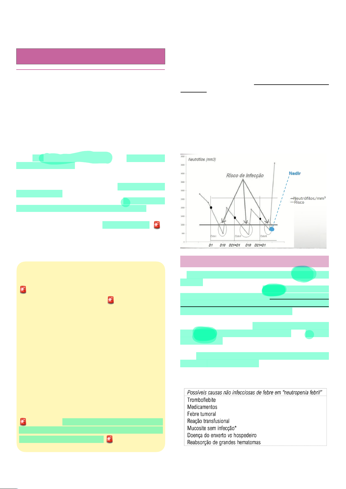 Neutropenia febril CONCEITO Embora a quimioterapia (QT) tenha melhorado o prognostico de pacientes com neoplasia, um importante efeito colateral limita o uso de esquemas mais potentes (com maior chance de cura ou controle da doença), a NEUTROPENIA (queda de polimorfonucleados + bastões). Isso deixa o paciente predisposto a infecções principalmente bacteriana, visto que esse tipo de linfócito defende as barreiras mucocutâneas com sua habilidade fagocítica e grande poder contra bactérias e fungos. Obs.: PMF são os neutrófilos maduros, os bastões são as formas jovens e imaturas Pela relação da neutropenia com o risco de infecção, as causas infecciosas correspondiam a 75% das mortes associadas à QT, antes do advento da antibioticoterapia EMPÍRICA → o curso dessas infecções, no neutropênico, costumava ser fulminante, levando à morte em 12-24h em um paciente que até então encontrava- se em regular estado clinico → a neutropenia febril é uma emergência médica! ! • Conceito de febre: temperatura axilar ≥ 37.8 ºC • Conceito de neutropenia: definida quando a contagem de neutrófilo está abaixo de 1.500 células/ mm3 Recomendações práticas: se quando o paciente entrar no serviço de saúde, não possuir resultado de hemograma para confirmar a neutropenia, ou se após a coleta existe previsão de demora de mais de 30 min para o resultado, o paciente deve ser considerado neutropênico se estiver entre o 10o e o 20o dia pós-QT (pois a maioria dos esquemas quimioterápicos atuais induz neutropenia com duração de 2-3 semanas) Isso porque o NADIR da QT (queda máxima de neutrófilos) ocorre aproximadamente 14 dias após o início do ciclo da QT, sendo o ponto mais baixo da curva de contagem de células sanguíneas → dessa forma, se um paciente no D7 pós-QT, por ex., estiver com 65 anos é um fator de risco independente • Sexo feminino: relacionado com o aumento do risco de NF, mas não das complicações por causa da doença • Tipo e estágio da neoplasia: pacientes com neoplasias hematológicas apresentam incidência 5x maior, quanto mais avançado o estágio, maior o risco • Esquema da quimioterapia e intensidade: pacientes que fazem QT + radioterapia apresentam maior risco, aqueles que são imunossuprimidos possuem aumento do risco de infecções por microrganismos atípicos • Episódios prévios de neutropenia ou de NF: aqueles que receberam antibioticoterapia prévia apresentam maior risco de infecções por fungos e microrganismos resistentes • Fatores associados: baixo nível de albumina (coli Streptococcus (graves) Klebisiella Enterococcus fecalis (graves) Enterobactérias Neutropenia febril As infecções fúngicas raramente são a causa de um primeiro episódio febri l no doente neutropênico, geralmente ela ocorre no evoluir da situação clínica do paciente, como a febre persistente ou recorrente após 1 semana de neutropenia Se a duração da neutropenia for prolongada (> 7 dias), o risco de infecções fúngicas aumenta, inicialmente por “leveduras” presentes na microbiota intestinal, como Candida sp., e posteriormente por “bolores” inalados do meio ambiente, como Aspergillus e Fusarium As infecções virais são raras em doentes de baixo risco, já nos de alto risco, são comuns episódios de reativação de vírus herpes simplex 1 e 2 ou varicela-zoster. Inclusive, a reativação da varicela-zoster é muito mais potente, sendo que o paciente pode possuir mais de 2 dermátomos sendo acometidos A fisiopatologia da neutropenia febril decorre de 2 motivos: do efeito da QT no sistema imune e na barreira mucosa do paciente, além de alterações na imunidade relacionados à própria neoplasia de base EFEITO DA QUIMIOTERAPIA A quimioterapia, que visa destruir células tumorais, também afeta as células saudáveis em rápido crescimento, como as células da medula óssea e os queratinócitos (por isso os cabelos caem) isso porque ela não é seletiva. Isso resulta em uma diminuição na produção de células sanguíneas, incluindo os neutrófilos, tipo de linfócito com função de fagocitose e combate principalmente em infecções bacterianas. Por isso, a neutropenia compromete a resposta imune inata, prejudicando a fagocitose e a produção de mediadores inflamatórios (por isso os sinais de inflamação são pouco evidentes nesses pacientes) Além de afetar a produção de células pela medula, os esquemas com a quimioterapia afeta também a barreira mucosa, levando à lesões na mucosa do TGI que resulta em MUCOSITE. O dano direto às células epiteliais leva a uma alteração na produção de peptídeos antimicrobianos que regulavam a flora local, assim, o comprometimento da barreira mucosa acarreta em múltiplas soluções de descontinuidade e abertura de “portas de entrada” para os microrganismos ali presente. O principal efeito é a translocação bacteriana A translocação bacteriana ocorre quando bactérias presentes no intestino, normalmente restritas ao TGI, conseguem atravessar a barreira mucosa e entrar na corrente sanguínea e em outros tecidos. Isso pode levar a complicações sérias, como sepse e inflamação generalizada.Além disso, a quimioterapia também pode afetar negativamente a flora intestinal saudável (microbiota), que desempenha um papel fundamental na manutenção da integridade da barreira mucosa e no equilíbrio do sistema imunológico intestinal. A disbiose, que é um desequilíbrio na composição da microbiota, pode facilitar a translocação bacteriana EFEITO DA PRÓPRIA NEOPLASIA O risco de diferentes tipos de infecção é influenciado pela neoplasia subjacente e pelos déficits imunológicos associados: • Linfomas (defeitos a função de células T): prejudica a produção de anticorpos, destruição dos complexos imunes e levam a um risco aumento de infecções por organismos intracelulares, ou seja, os atípicos. Como mycobacterium tuberculosos, salmonela, listeria monocytogenes e