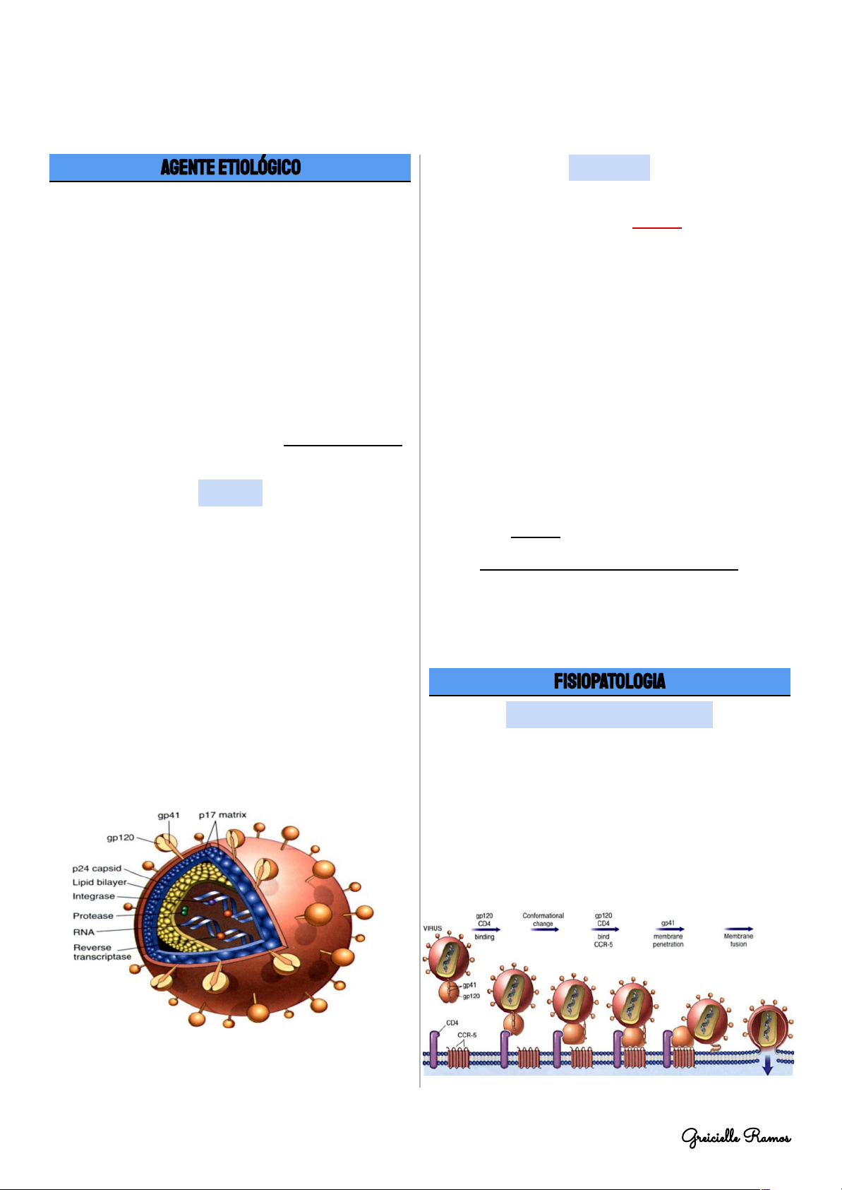 DOENÇAS INFECTOCONTAGIOSAS Infecção pelo HIV AGENTE ETIOLÓGICO O agente etiológico da AIDS é um retrovírus humano do gênero Lentivirus, da família Retroviridae, denominado vírus da imunodeficiência humana (HIV). - a primeira indicação de que este vírus poderia estar relacionado com a AIDS surgiu em 1983, em pacientes com linfadenopatia persistente. Ele é dividido em 2 tipos: HIV 1 - Descoberto na África. Foi denominado primeiro de LAV (vírus associado à linfadenopatia) e em um segundo momento de HTLV III. ● Responsável por quase todos os casos de AIDS no mundo. ● Subdividido em subtipos de A a K HIV 2 - Descoberto em Portugal, mas originado na África. Este tipo é 55% distinto do HIV 1 e é menos patogênico. ● Encontrado principalmente no oeste da áfrica. ESTRUTURA ● RNA ● Envelope ● Enzimas ○ Transcriptase reversa: permite a transcrição do RNA viral em DNA de dupla fita, essencial para a replicação viral ○ Integrase: capaz de incorporar o DNA viral no genoma da célula hospedeira ○ Protease ● Proteínas essenciais ○ gp120: envolvida no processo de penetração na célula hospedeira, através da ligação com moléculas CD4 ○ gp41: envolvida no processo de penetração na célula hospedeira, promovendo a fusão com a membrana celular da célula a ser infectada ○ p24: alvo dos anticorpos usados nos testes sorológicos de diagnóstico TRANSMISSÃO A transmissão do HIV pode ocorrer por diferentes vias, sendo que o material que representa exposição com risco de transmissão do HIV é o sangue. ● Sexual - modo predominante de transmissão ● Perfurocortantes - usuários de drogas injetáveis, manicures, profissionais da saúde ● Vertical - da gestante para o feto A transmissão nas relações sexuais é bidirecional, tanto nas relações heterossexuais quanto nas homossexuais. A probabilidade de transmissão por via sexual é maior nas relações por via anal (mucosa fina e alta vascularização), um pouco menor por via vaginal, e a menor probabilidade da transmissão é por via oral. Essas diferenças se devem às diferenças anatômicas nos órgãos sexuais, como: mucosas, vascularização, rede linfática, área de exposição, presença de outras ISTs ou lesões. E devem-se também à diferenças no intercurso secual, como: lesões por atrito, lubrificação, retenção de fluídos, fluídos sexuais, muco anal e presença de sangue. QUEM DEVE SER TESTADO PARA HIV ● Dúvidas quanto ao status anti-HIV ● Exposição à situação de risco ● Gestantes ● Doadores de sangue ou de órgãos ● Sinais e sintomas de AIDS FISIOPATOLOGIA MECANISMO DE PENETRAÇÃO CELULAR A célula alvo do HIV é o linfócito TCD4. Portanto, ao aproximar-se da membrana deste linfócito, a glicoproteína 120 (gp120) liga-se à molécula CD4 (presente na membrana do linfócito) formando um complexo (gp120 + CD4) que muda de conformação e se liga ao correceptor CCR5 ou ao CXCR4. Em seguida, ocorre uma alteração na conformação da glicoproteína 41 (gp41) e ela promove a fusão do envelope viral à membrana da célula infectada, permitindo que o material genético e as enzimas do vírus adentrem o citoplasma do linfócito. Greicielle Ramos Mobile User quando em tratamento, apesar da chance ser menor, a transmissão pode ocorrer! Mobile User ou epitélio CICLO DE VIDA O principal objetivo do vírus é se replicar/multiplicar, e é para isso que ele adentra a célula alvo, para que se replique utilizando os aparatos desta célula. A enzima transcriptase reversa permite a formação de um DNA de dupla fita a partir do RNA viral, processo denominado transcrição reversa. Este DNA recém formado adentra o núcleo da célula e por ação da enzima integrase, consegue integrar-se ao DNA da célula hospedeira. Assim, quando a célula hospedeira replicar seu DNA, replica juntamente o DNA viral. Este DNA viral replicado sai do núcleo, e por ação da enzima protease, é montada uma nova partícula viral, que sai da célula por brotamento e se dissemina pela corrente sanguínea até atingir outra célula alvo. ➔ A ativação imune persistente, associada à infecção pelo HIV, gera um processo inflamatório crônico com lesão endotelial colaborando para o aumento do risco cardiovascular. ➔ A ação aterogênica do HIV também se manifesta por alterações no metabolismo do colesterol. HISTÓRIA NATURAL DA DOENÇA A infecção pelo HIV é seguida por uma replicação intensa do vírus, de forma que ocorre uma intensa destruição dos linfócitos TCD4. Depois de algumas semanas a replicação viral torna-se menos intensa, possibilitando que a população de TCD4 se recupere um pouco (mas nunca retorna ao que estava antes da infecção), porém esse vírus não deixa de se replicar, mesmo que lentamente, e diminuindo gradualmente a população de TCD4. Até que em dado momento, essa população de linfócitos é tão pequena, que caracteriza-se a AIDS, na qual o sistema imune não é mais capaz de conter a replicação viral, que dispara novamente. FASE AGUDA A fase aguda de infecção pelo HIV, também denominada de Síndrome retroviral aguda, inicia-se cerca de 5 a 30 dias após a transmissão do vírus e caracteriza-se por carga viral elevada e níveis decrescentes de linfócitos TCD4 (queda abrupta) - o teste HIV pode ser negativo. O indivíduo pode ser assintomático, ou apresentar sintomas que podem ser confundidos com um quadro viral inespecífico, como: ● Febre ● Faringite ● Mal estar / mialgia ● Cefaleia ● Exantema ● Emagrecimento ● Adenopatia Esta fase aguda apresenta duração média de 2 a 3 semanas, tendo caráter auto-limitado. Como desenvolvimento da resposta imunológica específica contra o HIV, ocorre um declínio nos níveis de viremia até um valor basal, e uma recuperação parcial na contagem de células CD4. LATÊNCIA CLÍNICA A latência clínica é sequencial à fase aguda,sendo um período de equilíbrio entre a repl