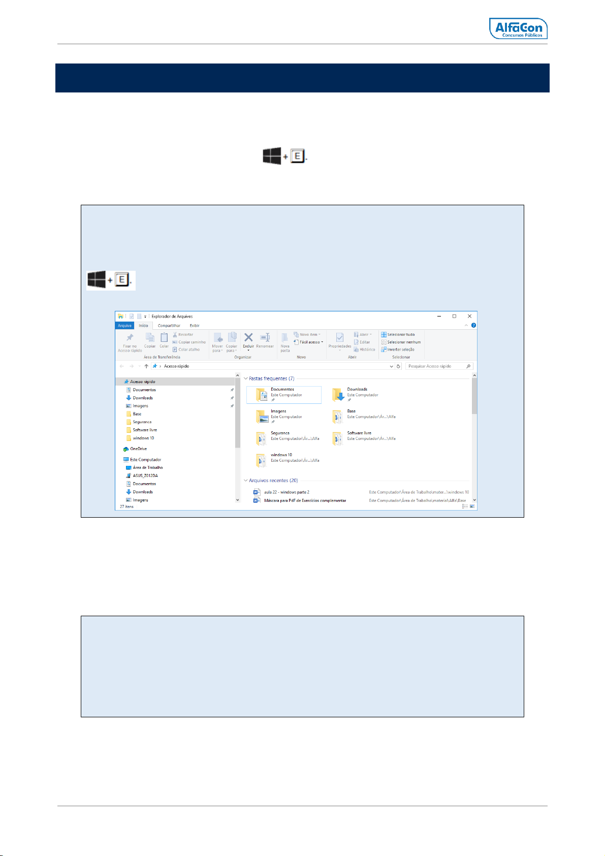 alfaconcursos.com.br MUDE SUA VIDA! 7 QUESTÕES COMENTADAS 1 – ANO: 2020 Banca: Quadrix Órgão: CREFONO PROVA: Assistente Administrativo Uma das formas de se abrir o Explorador de Arquivos no Windows 10 é por meio do teclado. Para isso, basta o usuário pressionar ( ) Certo ( ) Errado SOLUÇÃO Gabarito: Certo O Explorador de arquivos do Windows é o programa usado para gerenciar arquivos e pastas. O atalho para abrir o explorador de arquivos do Windows é . Veja abaixo a janela do Explorador de Arquivos do Windows 10. 2 – ANO: 2020 Banca: Quadrix Órgão: CFO - DF PROVA: Administrador Uma das formas de se abrir o Gerenciador de Tarefas do Windows 10 é por meio das teclas de atalho Ctrl + Shift + Esc. ( ) Certo ( ) Errado SOLUÇÃO Gabarito: Certo O atalho para acessar o Gerenciador de Tarefas do Windows 10 é CTRL + Shift + Esc. O Gerenciador de Tarefas permite ao usuário verificar os programas que estão ativos, analisar o consumo dos recursos do computador. Janela do Gerenciador de tarefas https://www.alfaconcursos.com.br/