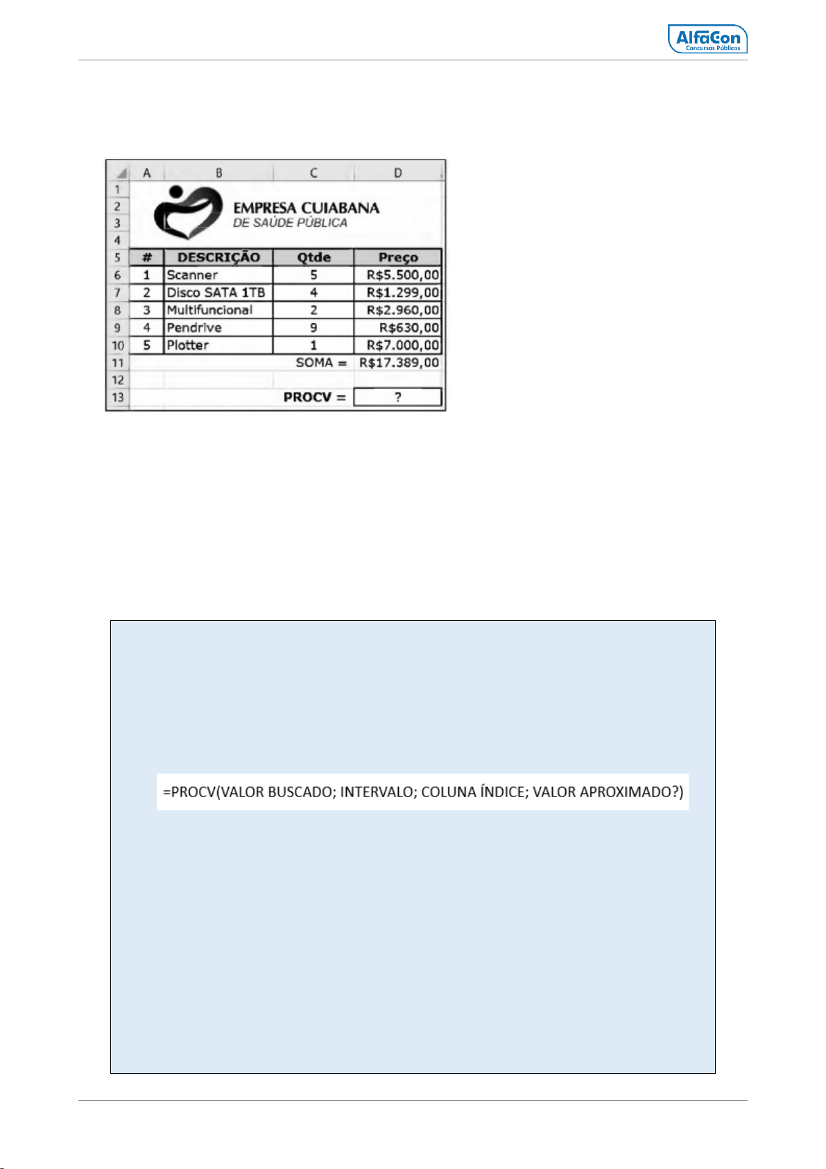 alfaconcursos.com.br MUDE SUA VIDA! 24 19 – ANO: 2019 Banca: SELECON Órgão: Empresa Cuiabana de Saúde Pública - MT PROVA: Advogado A planilha a seguir foi criada no Excel do pacote MSOffice 2016 BR. Na planilha, foram executados os seguintes procedimentos descritos: • em D11 foi inserida uma função que determina a soma de todas as células de D6 a D10, inclusive; • em D13 foi inserida a expressão =PROCV(A9;A6:D10;2;0). A expressão inserida em D11 e o conteúdo mostrado em D13 são, respectivamente: A) =SOMA(D6;D10) e Pendrive B) =SOMA(D6:D10)e Pendrive C) =SOMA(D6;D10) e Plotter D) =SOMA(D6:D10)e Plotter SOLUÇÃO Gabarito: Letra B A função PROCV é usada para encontrar um valor na primeira coluna do intervalo e retornar um valor na mesma linha. Segundo o enunciado da questão, os valores procurados estão no intervalo de C2 até C6, ou seja em uma coluna. Deveremos utilizar a função PROCV. A função PROCV tem a seguinte sintaxe: VALOR BUSCADO é o valor que será localizado na primeira coluna do lado direito do intervalo especificado. INTERVALO é o conjunto de células onde deve ser feita a busca. COLUNA ÍNDICE é a coluna onde está o valor que deve ser retornado pela função. VALOR APROXIMO indica se a função irá retornar apenas valores exatos ou pode localizar valores próximo. Caso seja preenchido verdadeiro só localizará valor próximos ao valor buscado se não tiver nenhum valor com a correspondência exata. Se for preenchido FALSO só irá localizar valores que correspondam exatamente ao valor buscado. A função PROCV(A9;A6:D10;2;0) irá buscar o valor de A9 e retornará o valor da segunda coluna (B) na mesma linha que A9, ou seja retornará “Pendrive”. https://www.alfaconcursos.com.br/
