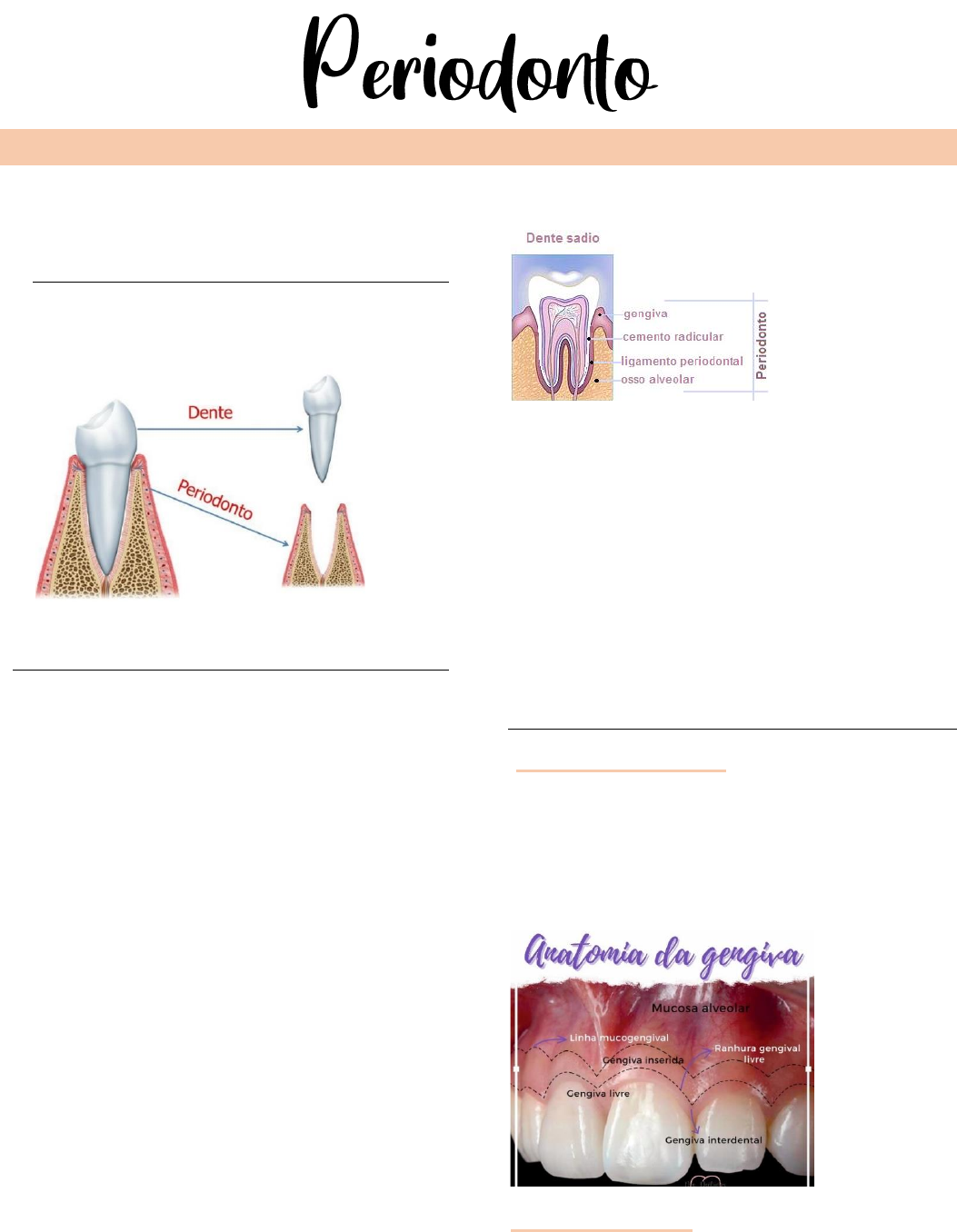 Odontologia - Emelly kathery Cardoso Maierhofer Anatomia e Histologia do Periodonto - Proteção 1 O que é o Periodonto? • Peri = ao redor • odonto= dente Introdução O periodonto é o conjunto dos tecidos que revestem e envolvem o dente. É também chamado de aparato de inserção, estabelecendo uma unidade funcional biológica e evolutiva que sofre modificações com o meio bucal e também modificações decorrentes da idade. As funções do periodonto são inserir o dente no tecido ósseo dos maxilares e manter a integridade da superfície da mucosa mastigatória da cavidade bucal Origem do periodonto: → Fase embrionária → Formação da lãmina dental → Estágio de capuz O periodonto inicia-se na fase embrionária, quando as células da crista neural migram para o primeiro arco braquial. Após a formação da lâmina dental inicia-se uma série de processos (estagio do botão ou broto, estágio do capuz, estágio da campânula, aposição ou coroa e maturação ou raiz.) que resultam na formação de um dente e seus tecidos periodontais. Ele é composto por quatro componentes principais: a gengiva, o ligamento periodontal, o osso alveolar e o cemento. Temos dois periodontos: Periodonto de proteção = ele é queratinizado e encontrado tanto na gengiva como no palato duro = gengiva. Periodonto de sustentação = não é queratinizado e é encontrado em todas as outras estruturas da cavidade = ligamento periodontal, o osso alveolar e o cemento. Obs: O cemento é considerado parte do periodonto porque juntamente com o osso, serve de suporte para as fibras do ligamento periodontal Aspectos clínicos da gengiva Do periodonto de proteção A gengiva é dividida em três porções: • Gengiva marginal/livre. • Gengiva inserida. • Gengiva interdental/interproximal (papila). Gengiva Marginal/Livre • É a parte da gengiva que circunda/contorna o dente em forma de colar. • Pode ser chamada de gengiva marginal ou gengiva livre ou marginal livre. Odontologia - Emelly kathery Cardoso Maierhofer 2 • Espessura bem pequena, em torno de 1 mm. • Possui a vertente interna (onde o fio dental passa, e é encontrado o sulco gengival) e a vertente externa. • É a porção ``mole´´ da gengiva, pois não está aderida como a gengiva inserida. • Zênite gengival: é a porção mais apical da margem gengival. Vai servir para dar uma configuração mais estética na gengiva. A gengiva marginal livre apresenta-se constituída: Vertente marginal - voltada para a cavidade bucal Vertente dental - voltada para o dente forma a parede do sulco gengival colada ao dente • Sulco gengival: é um espaço entre a vertente interna da gengiva e o dente. Possui uma forma de V, o que permite somente a entrada de uma sonda periodontal. A determinação clínica da profundidade desse sulco é um parâmetro diagnóstico importante. A Profundidade histológica do sulco pode variar de 0,69 a 1,5mm e a profundidade clínica de sondagem de um sulco gengival normal é de 2 a 3 mm. Gengiva Inserida • A gengiva inserida é contínua com a gengiva livre, sendo firme, resiliente e fortemente aderida ao periósteo do osso alveolar adjacente. Ela se estende até a linha mucogengival. • A função da gengiva inserida é garantir proteção para que não ocorra retração gengival. • Ranhura gengival: divide gengiva marginal da gengiva inserida. Use a imagem para fazer as identificações: • Junção mucogengival: é a parte final da gengiva inserida e início da mucosa alveolar • Na maxila é mais larga na vestibular dos incisivos e mais estreita nos pré-molares. • Na mandíbula, pela lingual, é mais larga nos molares e mais estreita nos incisivos. Gengiva Interproximal/Interdental Odontologia - Emelly kathery Cardoso Maierhofer 3 • É a porção de gengiva que preenche o espaço entre 2 dentes adjacentes. Ou seja, está entre os dentes. • Ocupa a ameia gengival, que é o espaço interproximal sobe a área de contato interproximal. Uma ameia é um espaço triangular situado perto da gengiva e entre as superfícies proximais de dois dentes adjacentes. As ameias são contínuas aos espaços interproximais entre os dentes . • Formato piramidal nos dentes anteriores. • Já nos dentes posteriores, entre uma papila e outra (vestibular e lingual ou palatina), existe uma região denominada “àrea de col”. Área de col Apresenta- se nos dentes posteriores como uma área ou zona de “col” que corresponde hà uma depressão entre duas papilas, ele é visto lateralmente na união da papila vestibular e palatina (no meio). A região de Col é recoberta por um epitélio NÂO queratinizado. Observe a diferença entre o tamanho da área de col de cada dente. I- Incisivo P- Pré-molar M – Molar Importância clínica da àrea de col !!! As Doenças Periodontais (D.P.) induzidas por placa bacteriana se iniciam nessa região: - Não queratinização - Concavidade dificulta a higienização - Sofre maior acúmulo de biofilme favorecendo a penetração de microrganismos e suas toxinas. Anatomia do periodonto Anatomia macroscópica = que é visível a olho nu. Anatomia microscópica = que só pode ser visto com o microscópio. Aspectos macroscópicos Cor: A cor da gengiva inserida e da gengiva marginal é geralmente descrita como “rosa coral ou rosada” e resulta do suprimento sanguíneo, da espessura e do grau de queratinização do epitélio e da presença de células que contêm pigmentação. A cor pode apresentar alterações de coloração devido à melanina. Odontologia - Emelly kathery Cardoso Maierhofer 4 Pigmentação Fisiológica (Melanina) A melanina é uma proteína que garante a coloração da pele e evita danos da radiação ultravioleta ao nosso DNA. ❖ a melanina é responsável pela pigmentação normal da pele, da gengiva e do resto das membranas mucosas orais; ❖ a melanina está presente em todos os indivíduos normais, contudo está ausente ou gravemente diminuída em indivíd