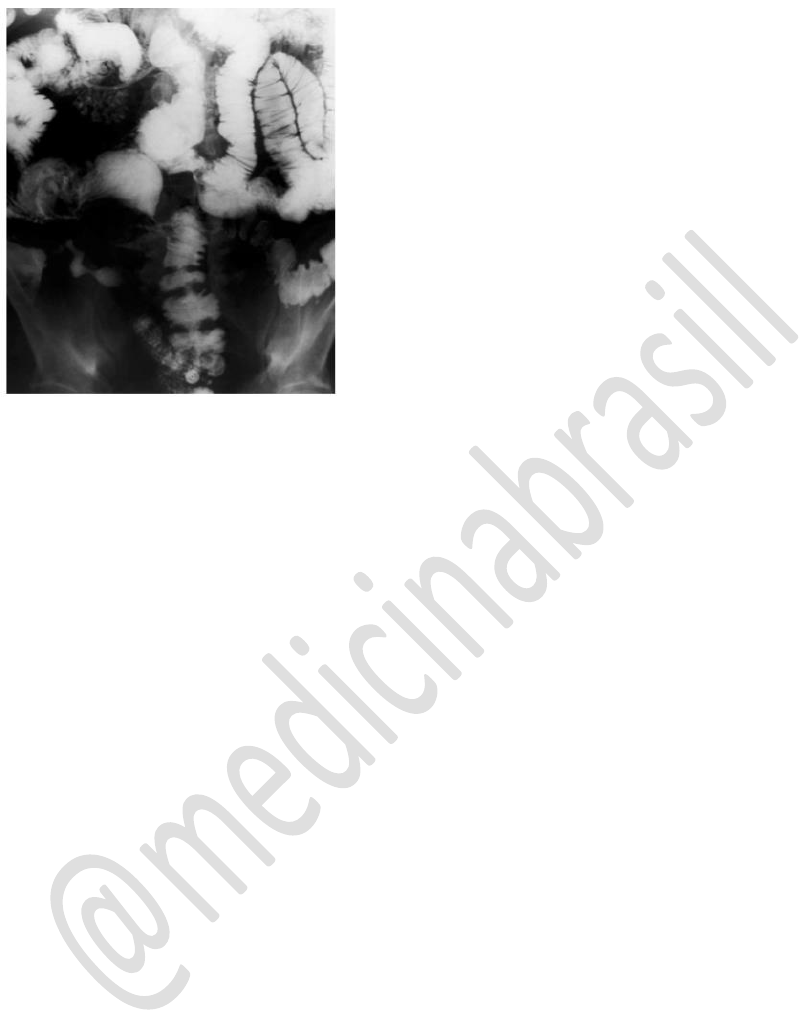 sintomas. Queixa-se de distensão abdominal e de intensa dor em cólica. Sua radiografia contrastada de abdome é exibida a seguir Melhor conduta terapêutica: A) aumentar a dose de prednisona para 50 mg/dia e introduzir nutrição parenteral e ciclosporina. B) ressecar o cólon sigmoide. C) prescrever sulfassalazina. D) ressecar o segmento de delgado comprometido e fazer a reconstrução primária do trânsito intestinal. E) ressecar os segmentos de delgado e de cólon comprometidos e fazer cirurgia de Hartmann e ileostomia. 840. (CREMESP 2010) Um paciente de 55 anos, previamente hígido, é submetido a retossigmoidectomia videolaparoscópica, com insuflação de dióxido de carbono com pressão constante de 14 mmHg. Variável com maior probabilidade de estar elevada, em função do pneumoperitônio: A) resistência vascular sistêmica. B) volume sistólico final do ventrículo esquerdo. C) frequência cardíaca. D) pressão arterial. E) índice cardíaco. 841. (CREMESP 2010) Um homem de 71 anos é levado ao pronto-socorro por dor abdominal difusa intensa há 24 horas. Chega torporoso e com instabilidade hemodinâmica. A família informa que ele é portador de fibrilação atrial crônica, que está tratando. A tomografia computadorizada de abdome mostra gás na veia porta, vesícula biliar de paredes espessadas, sem cálculos e pâncreas normal. A gordura pericecal está infiltrada/densificada. O apêndice não foi identificado, não se vê pneumoperitônio nem espessamento de alças de delgado ou de cólon. Conduta mais adequada para este paciente: A) reanimação volêmica, correção dos distúrbios hidroeletrolíticos e do equilíbrio ácido-básico e antibioticoterapia. B) arteriografia mesentérica. C) laparoscopia.