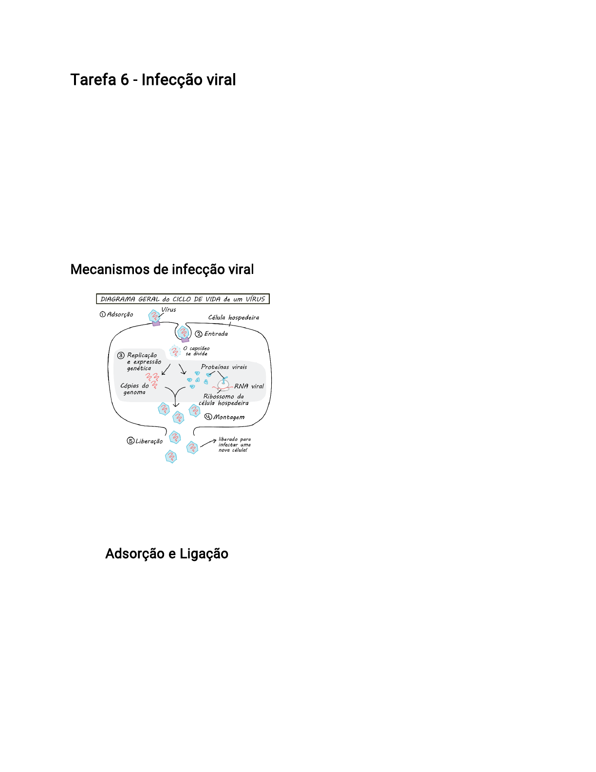El Professor Tarefa 6 - Infecção viral Os vírus utilizam uma variedade de mecanismos para infectar as células hospedeiras e se replicar dentro delas. Em uma escala microscópica, uma infecção viral significa que vários vírus estão usando suas células para fazerem mais cópias de si mesmo. O ciclo de vida do vírus é o conjunto de etapas em que o vírus reconhece e entra em uma célula hospedeira, "reprograma" o hospedeiro, fornecendo instruções na forma de DNA ou RNA viral, e usa os recursos do hospedeiro para produzir mais vírus (o resultado do "programa" viral). Mecanismos de infecção viral Para um vírus típico, o seu ciclo de vida pode ser dividido em cinco grandes passos (apesar que os detalhes desses passos serão diferentes para cada vírus): Adsorção e Ligação: O vírus se liga à superfície da célula hospedeira através de interações específicas entre proteínas virais e receptores celulares na membrana da célula hospedeira. Essa ligação é geralmente altamente específica e determina quais tipos de células o vírus pode infectar. Na ligação, uma proteína específica no capsídeo do vírus "fixa-se" fisicamente em uma molécula específica na membrana da célula hospedeira. Esta molécula, denominada de receptor, é geralmente uma proteína. Um vírus reconhece suas células hospedeiras com base nos receptores que elas carregam, e El Professor uma célula sem receptores para vírus não podem ser infectadas por este vírus. Penetração: Após a ligação, o vírus penetra na célula hospedeira, o que pode ocorrer de várias maneiras: - Fusão de membrana: O envelope viral se funde com a membrana celular, permitindo que o conteúdo viral entre na célula. - Endocitose: O vírus é internalizado na célula hospedeira através da formação de uma vesícula de endocitose, que é então transportada para dentro da célula e o conteúdo viral é liberado no citoplasma. - Desnudamento: Após a penetração, o capsídeo viral (envoltório protetor do vírus) pode se desintegrar, liberando o genoma viral no citoplasma da célula hospedeira. Uma rota típica para a entrada viral é a fusão com a membrana, que é mais comum nos vírus com envelopes. Vírus podem induzir a célula a absorvê-los por um processo de transporte chamado endocitose. Alguns até mesmo injetam seu DNA na célula El Professor Replicação Viral: O genoma viral é replicado dentro da célula hospedeira utilizando a maquinaria de replicação celular. Isso pode envolver a síntese de novos ácidos nucleicos virais e a produção de proteínas virais. Esta etapa envolve copiar o genoma viral e fazer mais proteínas virais, para que novas partículas virais possam ser montadas. Os materiais para estes processos (tais como os nucleotídeos para fazer novos DNA ou RNA) vêm da célula hospedeira, não do vírus. A maior parte da "maquinaria" para replicação e expressão genética é também fornecida pela célula hospedeira. Por exemplo, os RNAs mensageiros (RNAm) que codificam os genes virais são traduzidos em proteínas virais usando os ribossomos da célula hospedeira. Contudo, certas etapas, tal como a cópia do genoma de um vírus de RNA, não podem ser realizadas pelas enzimas da célula hospedeira. Em tais casos, os vírus devem codificar suas próprias enzimas. As proteínas virais produzidas variam de vírus para vírus. Todos os vírus devem codificar proteínas capsídicas, e vírus com envelope tipicamente também codificam proteínas do envelope (que frequentemente auxiliam no reconhecimento de El Professor hospedeiro). Os vírus também podem codificar proteínas que manipulam o genoma do hospedeiro (p.ex. através do bloqueio das defesas do hospedeiro ou da indução da expressão de genes para beneficiar o vírus), auxiliam a replicação do genoma viral, ou desempenham um papel em outras partes do ciclo de vida viral. Montagem Viral: Os componentes virais replicados são montados dentro da célula hospedeira para formar novas partículas virais. Durante a montagem, as proteínas do capsídeo recentemente sintetizadas juntam-se para formar capsômero, que interagem com outros capsômeros para formar o capsídeo inteiro. Alguns vírus, como os vírus cabeça-cauda, primeiramente montam um capsídeo “vazio” e então o enchem com o genoma viral. Outros vírus constroem capsídeos em torno do genoma viral, como apresentado abaixo Liberação: As novas partículas virais são liberadas da célula hospedeira, muitas vezes destruindo a célula hospedeira no processo, enquanto outros saem pelas próprias vias de exportação da célula (exocitose), e outros ainda crescem da membrana plasmática, levando um pequeno pedaço com eles quando saem.. Isso pode ocorrer por lise celular, onde a célula se rompe, ou por brotamento, onde as partículas virais são liberadas sem destruir completamente a célula hospedeira. El Professor Diferenças nos mecanismos de infecção de cada tipo de vírus Os vírus podem variar significativamente em sua estrutura, ciclo de vida e mecanismos de infecção, o que resulta em diferentes estratégias para infectar células hospedeiras. Aqui estão algumas das principais diferenças nos mecanismos de infecção de diferentes tipos de vírus: Vírus de DNA vs. Vírus de RNA: Os vírus de DNA e os vírus de RNA têm estratégias de replicação e mecanismos de infecção distintos. Os vírus de DNA geralmente penetram no núcleo da célula hospedeira, onde seu genoma viral é replicado e transcrições virais são produzidas. Já os vírus de RNA podem replicar-se no citoplasma da célula hospedeira e, em alguns casos, usam uma enzima chamada RNA polimerase dependente de RNA para replicar seu genoma viral. Envelopados vs. Não envelopados: Os vírus envelopados têm uma membrana lipídica derivada da membrana da célula hospedeira que os envolve. Essa membrana pode facilitar a entrada do vírus na célula hospedeira por fusão com a membrana celu