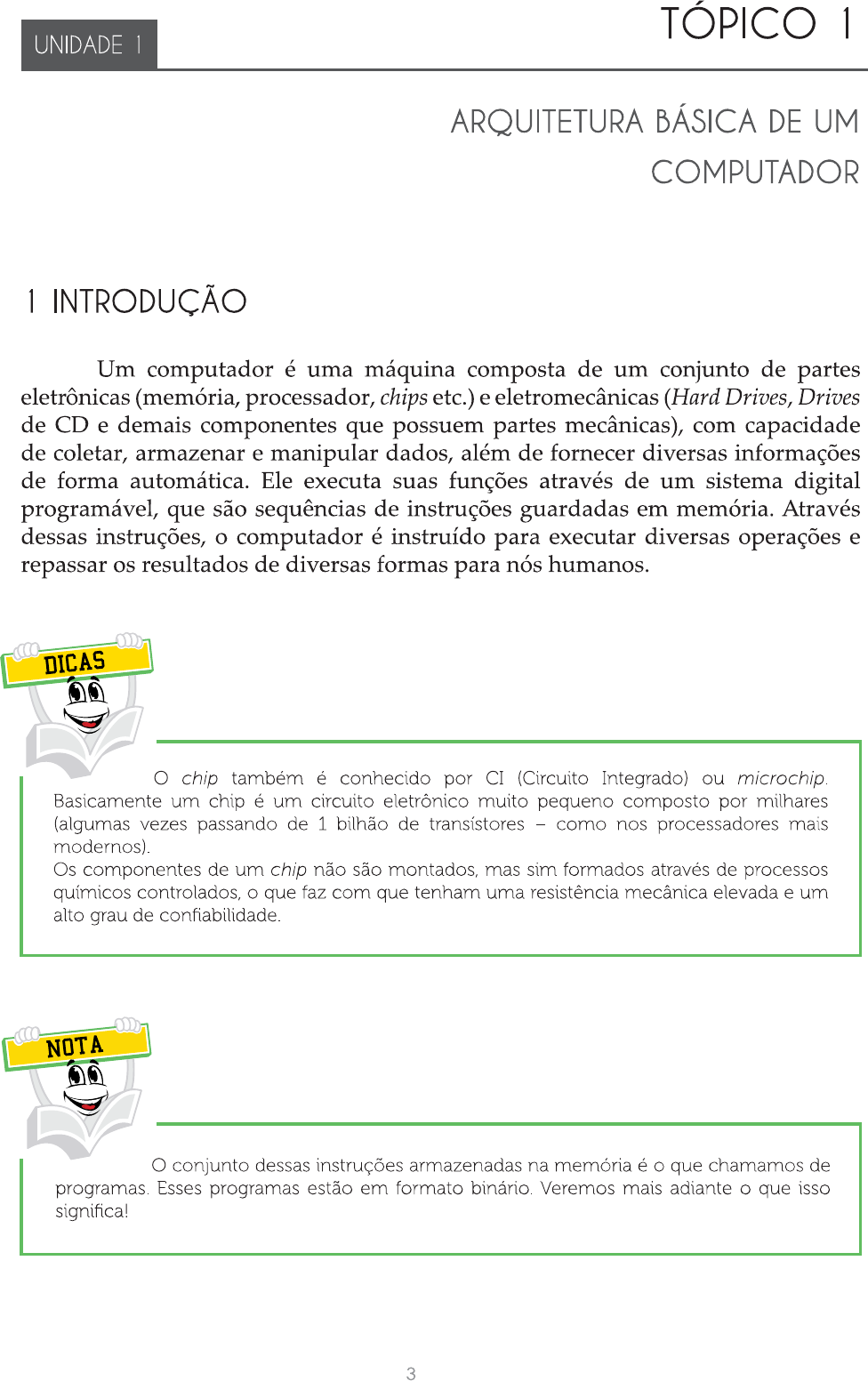 TÓPICO 1 UNIDADE 1 ARQUITETURA BÁSICA DE UM COMPUTADOR 1 INTRODUÇÃO Um computador é uma máquina composta de um conjunto de partes eletrônicas processador, chips etc.) e eletromecânicas (Hard Drives, Drives de CD e demais componentes que possuem partes mecânicas), com capacidade de coletar, armazenar e manipular dados, além de fornecer diversas informações de forma automática. Ele executa suas funções através de um sistema digital programável, que são sequências de instruções guardadas em memória. Através dessas instruções, o computador é instruído para executar diversas operações e repassar os resultados de diversas formas para nós humanos. DICAS chip também é conhecido por CI (Circuito Integrado) ou microchip. Basicamente um chip é um circuito eletrônico muito pequeno composto por milhares (algumas vezes passando de 1 bilhão de como nos processadores mais modernos). Os componentes de um chip não são montados, mas sim formados através de processos químicos controlados, que faz com que tenham uma resistência mecânica elevada e um alto grau de confiabilidade. NOTA conjunto dessas instruções armazenadas na memória é que chamamos de programas. Esses programas estão em formato binário. Veremos mais adiante que isso significa! 3UNIDADE PRINCÍPIOS DA ARQUITETURA DE COMPUTADORES E MATEMÁTICA DIGITAL Atualmente, os computadores são utilizados num variado conjunto de tarefas, tendo em vista não só a execução rápida e viável das mesmas, como também a realização de tarefas humanamente impraticáveis, como grandes armazenamentos de dados. Essas tarefas estão divididas em diversas áreas, conforme veremos na listagem a seguir: tarefas Científicas, como os cálculos balísticos; tarefas Comerciais, como cálculo de folhas de pagamento e contabilidade; tarefas de Simulação, como simulação de tráfegos e grafos matemáticos; tarefas de Controle de Processos, como as executadas em usinas nucleares e grandes indústrias. Um detalhe importante do computador é que ele se diferencia das demais máquinas de cálculo, por diversas características, dentre elas destacamos: alta velocidade na execução de suas operações; grande capacidade de armazenar informações; capacidade de trabalhar ininterruptamente; capacidade de executar longas sequências de operações, como a maioria dos programas computacionais faz. Claro que, como toda máquina, os computadores possuem suas vantagens e desvantagens. Algumas são listadas a seguir: Vantagens: grandes quantidades de dados podem ser processadas em cálculos rápidos; executam longas tarefas que requeiram repetições em diversas fases; fazem cálculos exatos através de fórmulas ou equações complicadas; alta capacidade de armazenar os dados, e formas variadas de representação dos resultados (gráficos, planilhas, listas, imagens etc.). Desvantagens: não são criativos (só executam tarefas programadas); não corrigem erros; ainda não conseguem interpretar de forma eficiente a VOZ humana (claro que em algumas aplicações isso já é possível, mas pouco difundido); não leem manuscritos; o alto custo ainda é uma das suas desvantagens, uma vez que a grande maioria da população não tem acesso a ele; dificuldade em programá-los, isso ainda hoje requer conhecimentos específicos; alto consumo de energia; geração de muito calor, sendo necessário sistemas complexos e caros de refrigeração; suscetível a falhas, como falta de energia, ou queima de componentes. 4TÓPICO 1 ARQUITETURA BÁSICA DE UM COMPUTADOR Apesar das diversas desvantagens que ainda existem no uso dos computadores, o número de vantagens é bem maior, e seria impraticável fazer o levantamento de todas. Mas podemos ter uma ideia dessa grandiosidade ao observarmos que em nosso redor sempre estamos em contato direto ou indireto com o computador. NOTA Você já imaginou hoje um supermercado sem auxílio dos computadores para processar as vendas? Ou já pensou em como seria sistema financeiro hoje sem as máquinas para processar a compensação e os caixas eletrônicos? E um hospital? Já imaginou como seria se não existissem computadores para ajudar nos diagnósticos e exames? Reflita! Sendo assim, a sua compreensão e o entendimento da sua arquitetura e de seu funcionamento são de extrema importância, principalmente aos profissionais da informática. E é com esse objetivo que segue a seguir, em detalhes, a formação básica de um computador e a sua arquitetura funcional. 2 ELEMENTOS BÁSICOS DA ARQUITETURA COMPUTACIONAL Apesar da existência de uma grande diversidade em termos de arquiteturas, pode-se enumerar, num ponto de vista mais genérico, os componentes básicos da arquitetura computacional atual. FIGURA 1 ARQUITETURA VON NEUMANN Unidade de Controle de de Unidade Lógica e Aritmética CPU Disponível em:UNIDADE PRINCÍPIOS DA ARQUITETURA DE COMPUTADORES E MATEMÁTICA DIGITAL A figura anterior destaca os elementos que compõem um computador. Apesar da grande evolução ocorrida na área de informática desde o aparecimento dos primeiros computadores, esquema apresentado na figura pode ser utilizado tanto para descrever um sistema computacional atual como os computadores da década de 40, projetados por engenheiros como John von Neumann. FONTE: Adaptado de: Acesso em: 29 ago. 2012. Por esse motivo, até hoje essa arquitetura é conhecida como Arquitetura de Von Neumann. Os principais elementos que a arquitetura apresenta são: A CPU - Unidade Central de Processamento (o processador): É responsável pelo tratamento de informações armazenadas em memória (programas em código de máquina e dos dados); A Memória: É responsável pela armazenagem dos programas e dos dados. Os Dispositivos de I/O (Entrada e Saída): São os dispositivos responsáveis pelas entradas e saídas de dados do computador, ou seja, pelas interações entre o computador e o mundo externo. Como exemplo de periféricos tem-se o monitor, teclado