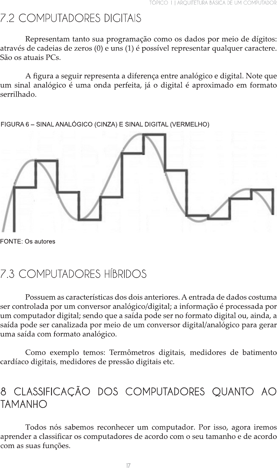 1 ARQUITETURA BÁSICA DE UM COMPUTADOR 7.2 COMPUTADORES DIGITAIS Representam tanto sua programação como os dados por meio de dígitos: através de cadeias de zeros (0) e uns (1) é possível representar qualquer caractere. São os atuais PCs. A figura a seguir representa a diferença entre analógico e digital. Note que um sinal analógico é uma onda perfeita, já o digital é aproximado em formato serrilhado. FIGURA 6 - SINAL ANALÓGICO (CINZA) E SINAL DIGITAL (VERMELHO) FONTE: Os autores 7.3 COMPUTADORES HÍBRIDOS Possuem as características dos dois anteriores. A entrada de dados costuma ser controlada por um conversor analógico/digital; a informação é processada por um computador digital; sendo que a saída pode ser no formato digital ou, ainda, a saída pode ser canalizada por meio de um conversor digital/analógico para gerar uma saída com formato analógico. Como exemplo temos: Termômetros digitais, medidores de batimento cardíaco digitais, medidores de pressão digitais etc. 8 CLASSIFICAÇÃO DOS COMPUTADORES QUANTO AO TAMANHO Todos nós sabemos reconhecer um computador. Por isso, agora iremos aprender a classificar os computadores de acordo com o seu tamanho e de acordo com as suas funções. 17UNIDADE PRINCÍPIOS DA ARQUITETURA DE COMPUTADORES E MATEMÁTICA DIGITAL Atualmente vemos muitos computadores parecidos, mas de acordo com a função que cada um desempenha, temos determinadas definições. Vejamos a seguir a maioria das definições criadas para os computadores: Mainframes: São os computadores de grande porte. Geralmente possuem grande capacidade de memória e processamento rápido. Porém, sua maior característica é o tamanho físico. Os mainframes antigos possuem tamanhos consideráveis, parecendo verdadeiros armários. Os atuais já são menores, e são capazes de oferecer processamento a vários usuários conectados através de terminais diretos ou conexões de rede. Computadores de médio porte: Menos poderosos, porém mais baratos e de tamanho menor que um mainframe; Servidor: Fornece software e outros recursos, como serviços através de uma rede; Minicomputadores: Computadores de uso pessoal, como PC de mesa (desktop) e notebooks. Server Farm: Grande grupo de servidores mantidos por um fornecedor comercial, disponível para o comércio eletrônico e outras atividades. Microcomputadores: Computadores portáteis como: PDA, instrumentos de informação, notebooks e desktops. Servidor de Rede: Poderoso microcomputador utilizado em pequenas LANs, responsável pela conectividade de serviços. 9 CLASSIFICAÇÃO DOS COMPUTADORES QUANTO À FUNÇÃO Em relação à função, os computadores são classificados como: Computador pessoal (PC): Pequeno computador de mesa ou portátil. São nossos notebooks e desktops. Workstation: Computador de mesa com recursos gráficos e matemáticos poderosos. Normalmente são PCs, mas recebem o nome de Workstation por estarem em ambientes empresariais. Supercomputador: Altamente sofisticado e poderoso, executa cálculos complexos. São os mainframes e servidores. Geralmente usados em pesquisas, pois têm altíssimo poder de processamento e grande quantidade de memória. A figura a seguir mostra uma foto do Earth Simulator, que já foi o computador mais rápido do mundo. 18TÓPICO 1 ARQUITETURA BÁSICA DE UM COMPUTADOR FIGURA 7 - EARTH SIMULATOR FONTE: Disponível em: Acesso em: 10 jun. 2012. NOTA Se você quiser saber a lista atualizada dos computadores mais rápidos e potentes do mundo, acesse: . A lista é atualizada duas vezes por ano (novembro e junho). 19RESUMO DO TÓPICO 1 Caro(a) acadêmico(a), neste primeiro tópico você estudou os seguintes aspectos da arquitetura básica de um computador: A arquitetura básica dos computadores persiste a mesma desde a década de 40, projetada pelo engenheiro John von Neumann. Um computador é formado basicamente por quatro unidades: CPU, Memória, Dispositivos de I/O e Barramentos. A CPU é o coração do computador, capaz de executar diversas tarefas de forma rápida e eficiente. A CPU é composta por três unidades, as quais chamamos de: Unidade de Controle (UC), Unidade de Aritmética e Lógica (ULA) e Registradores. É na memória que ficam armazenados os programas para serem executados na CPU. Os Dispositivos de I/O representam a comunicação da CPU com o mundo externo. Os Barramentos são os caminhos por onde os dados trafegam dentro do computador. Compreendeu a diferença entre computadores analógicos e digitais. Estudou a classificação dos computadores, tanto em relação ao tamanho quanto à função. 20AUTOATIVIDADE Olá, acadêmico, agora é só você resolver as questões abaixo e estará reforçando seu aprendizado. 1 Cite os elementos básicos da Arquitetura Von Neumann e a função de cada um. 2 Quais as unidades de compõem uma CPU? Qual a principal função de cada unidade? 3 Cite os diversos tipos de memórias e as diferenças entre eles. 4 O que é o ciclo de busca e execução? Cite um ciclo de busca e execução do mundo real. 5 Cite a classificação dos computadores quanto ao seu tamanho e à sua função. 2122TÓPICO 2 UNIDADE 1 MATEMÁTICA BINÁRIA 1 INTRODUÇÃO Agora que os principais componentes de uma arquitetura computacional já foram citados, iremos mergulhar um pouco mais no mundo dos componentes chamados CIs (Circuitos Integrados), os quais formam, dentre outros dispositivos, os processadores, conhecidos como CPU, além das diversas placas e periféricos encontrados nos computadores. Iniciaremos o estudo dos CIs a partir da formação da sua lógica. Os CIs executam suas funções somente com dados binários, representados pelos números 0 (zero) e 1 (um). Portanto, se as funções dos CIs são efetuadas a partir de números, compreende-se que as suas funções são, na sua grande maioria, operações matemáticas. As operações matemáticas realizadas pelo computador são as mais simples, como a soma, subtração, multiplicação ou divisão. 