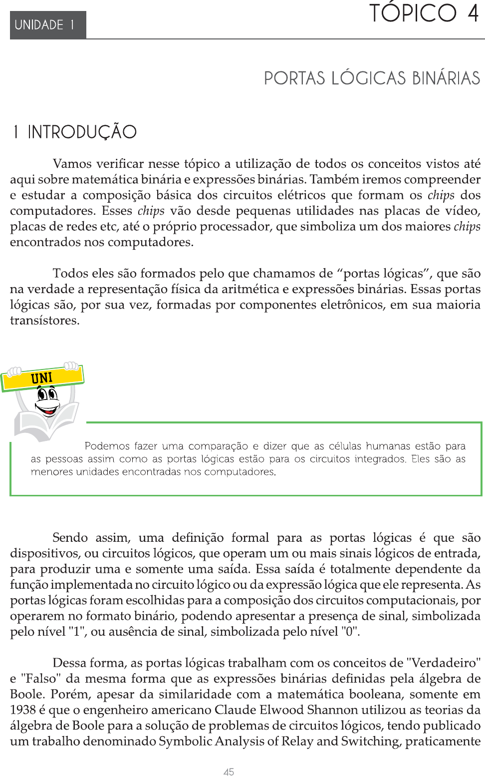 TÓPICO 4 UNIDADE 1 PORTAS LÓGICAS BINÁRIAS 1 INTRODUÇÃO Vamos verificar nesse tópico a utilização de todos os conceitos vistos até aqui sobre matemática binária e expressões binárias. Também iremos compreender e estudar a composição básica dos circuitos elétricos que formam os chips dos computadores. Esses chips vão desde pequenas utilidades nas placas de vídeo, placas de redes etc, até o próprio processador, que simboliza um dos maiores chips encontrados nos computadores. Todos eles são formados pelo que chamamos de "portas lógicas", que são na verdade a representação física da aritmética e expressões binárias. Essas portas lógicas são, por sua vez, formadas por componentes eletrônicos, em sua maioria UNI Podemos fazer uma comparação e dizer que as células humanas estão para as pessoas assim como as portas lógicas estão para os circuitos integrados. Eles são as menores unidades encontradas nos computadores. Sendo assim, uma definição formal para as portas lógicas é que são dispositivos, ou circuitos lógicos, que operam um ou mais sinais lógicos de entrada, para produzir uma e somente uma saída. Essa saída é totalmente dependente da função implementada no circuito lógico ou da expressão lógica que ele representa. As portas lógicas foram escolhidas para a composição dos circuitos computacionais, por operarem no formato binário, podendo apresentar a presença de sinal, simbolizada pelo nível "1", ou ausência de sinal, simbolizada pelo nível "0". Dessa forma, as portas lógicas trabalham com os conceitos de "Verdadeiro" e "Falso" da mesma forma que as expressões binárias definidas pela álgebra de Boole. Porém, apesar da similaridade com a matemática booleana, somente em 1938 é que engenheiro americano Claude Elwood Shannon utilizou as teorias da álgebra de Boole para a solução de problemas de circuitos lógicos, tendo publicado um trabalho denominado Symbolic Analysis of Relay and Switching, praticamente 45UNIDADE PRINCÍPIOS DA ARQUITETURA DE COMPUTADORES E MATEMÁTICA DIGITAL introduzindo na área tecnológica o campo da eletrônica digital. Devido à utilização da álgebra de Boole na eletrônica digital é que os operadores binários (AND, OR, XOR e NOT) dão nomes à maioria das portas lógicas existentes. Concluindo, dizemos que todas as complexas operações computacionais são combinações de operações simples, como somas, subtrações, comparações de bits, movimento de bits, etc. Essas operações estão implementadas dentro dos circuitos eletrônicos. Na figura a seguir vemos um desses circuitos, cuja principal composição se dá pelos arranjos de portas lógicas, também demonstrado na figura 16. Essa, por sua vez, representa a função XOR, através da combinação de outras portas lógicas. FIGURA 15 - CIRCUITO INTEGRADO FONTE: Disponível em jpg> Acesso em: 15 fev. 2007. FIGURA 16 - PORTA LÓGICA A A XOR B B FONTE: Disponível em Acesso em: 15 fev. 2012. 46TÓPICO 4 PORTAS LÓGICAS BINÁRIAS A seguir, vamos estudar as diversas portas lógicas e saber um pouco mais sobre seus conceitos e sua utilização. 2 PORTA LÓGICA OR (OU, +) A porta lógica OR simboliza, assim como o próprio operador binário OU, um circuito de soma entre duas entradas. Os resultados desse circuito seguem os resultados da tabuada booleana (visto anteriormente). UNI Lembre-se de que uma tabela verdade simboliza todas as possíveis combinações binárias de acordo com número de entrada. A fórmula para descobrir número de combinações é 2n, onde "n" é número das entradas. Como as portas lógicas possuem sempre duas entradas, sempre teremos as possibilidades de 22, que nos dá quatro possibilidades. Se ainda tiver dúvidas, volte e reveja como montar esta tabuada no item 5 do capítulo anterior. 2.1 TABELA VERDADE PORTA OR A tabela verdade da porta lógica OR é apresentada a seguir: FIGURA 17 - TABELA VERDADE DA PORTA OR A B A OR B 0 1 1 1 1 1 1 1 FONTE: Os autores 2.2 SAÍDA DA PORTA OR Analisando a tabela verdade da porta OR, define-se que a saída de uma porta OR será o nível lógico 1 se pelo menos uma das entradas for positiva. Caso contrário, se todas forem negativas, a saída será 0. 47UNIDADE PRINCÍPIOS DA ARQUITETURA DE COMPUTADORES E MATEMÁTICA DIGITAL 2.3 SÍMBOLO DA PORTA LÓGICA OR Para representar uma porta lógica OR num circuito eletrônico usa-se o símbolo abaixo, onde A e B são as entradas e S a saída. Lembrando que uma porta lógica sempre produzirá uma única saída. FIGURA 18 - PORTA LÓGICA OR FONTE: Os autores 3 PORTA LÓGICA AND (E, *) A porta lógica AND simboliza, assim como o próprio operador binário E, um circuito de multiplicação entre duas entradas. Os resultados desse circuito também seguem os resultados da tabuada booleana. 3.1 TABELA VERDADE PORTA AND A tabela verdade da porta lógica AND é apresentada a seguir: FIGURA 19 - TABELA VERDADE DA PORTA AND A B A AND B O 0 1 0 1 1 1 1 FONTE: Os Autores 48TÓPICO 4 PORTAS LÓGICAS BINÁRIAS 3.2 SAÍDA DA PORTA AND Sendo assim, pode-se também definir que a saída de uma porta AND será o nível lógico 1 se todas as entradas forem positivas. Caso contrário, se pelo menos uma entrada for negativa, a saída será 0. 3.3 SÍMBOLO DA PORTA LÓGICA AND Para se representar uma porta lógica AND num circuito eletrônico usa-se o símbolo abaixo, onde A e B são as entradas e S a saída. FIGURA 20 - PORTA LÓGICA AND FONTE: Os autores 4 PORTA LÓGICA NOT (Inversor, A porta lógica NOT simboliza, assim como o próprio operador binário NOT, um circuito inversor de sinais. Vale ressaltar que, como estamos utilizando operandos binários, as possibilidades são: 1 como entrada e 0 como saída ou 0 como entrada e 1 como saída. A porta lógica NOT é a única porta que possui somente uma entrada. 4.1 TABELA VERDADE PORTA NOT A tabela verdade da porta lógica NOT é apresentada a seguir: 49UNIDADE PRINCÍPIOS DA ARQUITETURA DE COMPUTADORES E