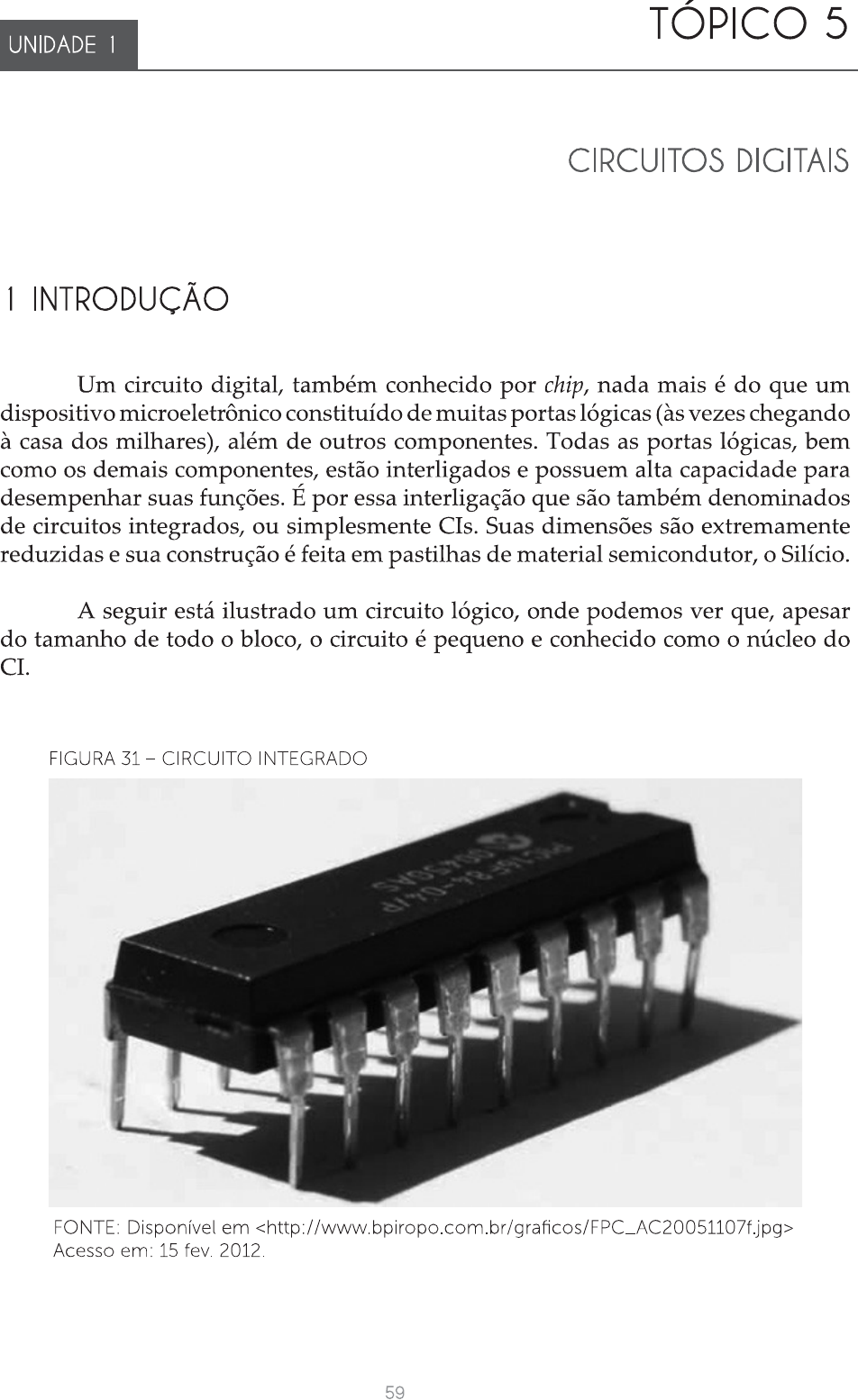 TÓPICO 5 UNIDADE 1 CIRCUITOS DIGITAIS 1 INTRODUÇÃO Um circuito digital, também conhecido por chip, nada mais é do que um dispositivo microeletrônico constituído de muitas portas lógicas (às vezes chegando à casa dos milhares), além de outros componentes. Todas as portas lógicas, bem como os demais componentes, estão interligados e possuem alta capacidade para desempenhar suas funções. É por essa interligação que são também denominados de circuitos integrados, ou simplesmente CIs. Suas dimensões são extremamente reduzidas e sua construção é feita em pastilhas de material semicondutor, o Silício. A seguir está ilustrado um circuito lógico, onde podemos ver que, apesar do tamanho de todo o bloco, o circuito é pequeno e conhecido como o núcleo do CI. FIGURA 31 - CIRCUITO INTEGRADO FONTE: Disponível em Acesso em: 15 fev. 2012. 59UNIDADE PRINCÍPIOS DA ARQUITETURA DE COMPUTADORES E MATEMÁTICA DIGITAL Sabendo que um CI é constituído de portas lógicas, dessa forma, a figura 30 abaixo poderia representar a estrutura interna do CI, bem como a lógica que esse CI representa. Um CI contendo a estrutura lógica a seguir é formado por quatro portas AND. A interligação das portas lógicas representa a expressão binária definida para o CI. Em outras palavras, a função que o CI irá desempenhar. FIGURA 32 - PORTAS DE UM 1 FONTE: Disponível em Acesso em: 15 fev. 2012. 2 CIRCUITOS DIGITAIS COM PORTAS LÓGICAS Como podemos observar, através da figura anterior, na maioria das vezes os CIs são construídos pelas interligações entre portas lógicas. Na verdade, trata- se de dependências entre as portas lógicas, aonde os sinais vão passando de porta em porta, gerando saídas. A saída de uma determinada porta pode representar a entrada de outra porta, e assim por diante, formando um circuito lógico combinacional. Esse aspecto poderá ser visto no circuito a seguir: 60TÓPICO 5 CIRCUITOS DIGITAIS FIGURA 33 CIRCUITO INTEGRADO COM PORTAS LÓGICAS A B C Y FONTE: Disponível em Acesso em: 15 fev. 2007. Sabemos que diversos problemas ou necessidades do mundo real podem ser representados através de expressões binárias. As expressões binárias são representadas por entradas binárias e operadores AND, OR, NOT XOR e seus derivados. Os operadores binários, por sua vez, podem ser representados por portas lógicas que possuem também as entradas binárias. Sendo assim, podemos dizer que: Uma necessidade do mundo real = uma expressão binária = portas lógicas = circuito integrado (ou uma combinação de circuitos integrados). Ou seja, uma vez que se pode representar uma expressão binária através de portas lógicas, juntam-se essas portas lógicas que resolvem a expressão binária e se constrói um CI. Vamos a um exemplo: No tópico 3 desta unidade representamos uma expressão binária sobre o aprendizado de um aluno. Vamos rever o exemplo: Você aprenderá expressões binárias se houver dedicação aos estudos E estiver acompanhando as aulas presenciais. Ou aprenderá expressões binárias se for dedicando aos estudos E fazer os exercícios. E aprender expressões binárias se NÃO for relaxado. Vamos analisar primeiro as variáveis desse problema. O que eu quero como resultado é aprender expressões binárias, então: Aprender expressões binárias = X. As condições para aprender expressões binárias são: Ter dedicação aos estudos = A Acompanhar as aulas presenciais = B Fazer os exercícios = C Não ser relaxado = D' (negação da afirmação Ser Relaxado) 61UNIDADE PRINCÍPIOS DA ARQUITETURA DE COMPUTADORES E MATEMÁTICA DIGITAL Agora, temos que analisar a relação entre as variáveis para decidir quais operadores usar: A e B são dependentes, pois utilizam o E A e C são dependentes, pois utilizam o E D' é obrigatório A e B não é dependente entre A e C, pois utiliza o OU Com isso, podemos montar a expressão binária da seguinte forma: X Nesse exemplo chegamos à expressão binária acima. Agora, como construir um CI a partir dessa expressão binária? É simples, basta sabermos que cada operador binário representa uma porta lógica e qual a sequência matemática correta para a resolução desse problema, ou seja, qual a ordem em que os cálculos são feitos. Na matemática os cálculos são executados na seguinte forma: 1. Resolve-se os parênteses. 2. Resolve-se as inversões. 3. Resolve-se as multiplicações. 4. Resolve-se as somas. Sendo assim, teríamos a criação do circuito lógico a seguir, representando o problema do aprendizado de um aluno. FIGURA 34 CIRCUITO A B C D FONTE: Os autores 3 EXEMPLOS DE CIRCUITOS DIGITAIS A seguir serão apresentados alguns circuitos digitais mais comuns encontrados nos computadores. Serão vistos somente três tipos de circuitos. Os circuitos de soma, os multiplexadores e os decodificadores. 62TÓPICO 5 CIRCUITOS DIGITAIS 3.1 CIRCUITO DE SOMA Para exemplificar uma das operações matemáticas elementares, iremos montar o circuito lógico da operação SOMA. A operação de soma será dividida em duas partes, a primeira exibirá a soma de dois bits separadamente, depois criaremos o circuito da soma de 4 bits. Para se obter o circuito da soma de 8 bits é só acrescentarmos mais somadores unitários. Este circuito também é conhecido como somador simples. Em ambos os exemplos será verificada a tabela verdade. Como exemplo, iremos somar os dois últimos bits dos números binários a seguir: A 1001101 [1] B + 1000001 [1] Esses seriam os bits tratados pelo circuito a seguir. FIGURA 35 - CIRCUITO DE SOMA DE 1 BIT BA Vai 1 Saída FONTE: Os autores Analisando a figura anterior, veremos que as entradas são representadas por A e B. A saída é o resultado da soma e o vai 1 é o transporte para a próxima soma. 63UNIDADE PRINCÍPIOS DA ARQUITETURA DE COMPUTADORES E MATEMÁTICA DIGITAL Em relação à Tabela Verdad e da Soma de dois bits, teríamos a descrição a seguir: FIGURA 36 - TABELA VERDADE DA SOMA DE 1 