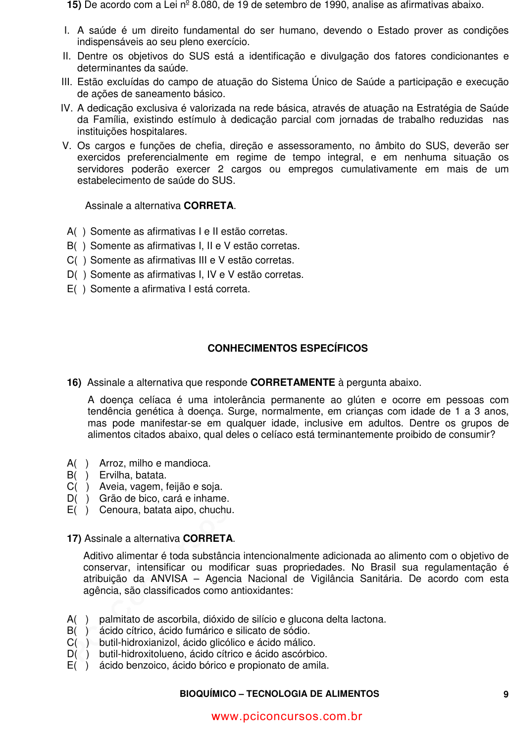 pcimarkpci MDAwMDowMDAwOjAwMDA6MDAwMDowMDAwOmZmZmY6YmZiOTphZTA5:VGh1LCAyNyBNYXIgMjAyNSAwMTowNDoxMSAtMDMwMA== www.pciconcursos.com.br BIOQUÍMICO – TECNOLOGIA DE ALIMENTOS 9 15) De acordo com a Lei no 8.080, de 19 de setembro de 1990, analise as afirmativas abaixo. I. A saúde é um direito fundamental do ser humano, devendo o Estado prover as condições indispensáveis ao seu pleno exercício. II. Dentre os objetivos do SUS está a identificação e divulgação dos fatores condicionantes e determinantes da saúde. III. Estão excluídas do campo de atuação do Sistema Único de Saúde a participação e execução de ações de saneamento básico. IV. A dedicação exclusiva é valorizada na rede básica, através de atuação na Estratégia de Saúde da Família, existindo estímulo à dedicação parcial com jornadas de trabalho reduzidas nas instituições hospitalares. V. Os cargos e funções de chefia, direção e assessoramento, no âmbito do SUS, deverão ser exercidos preferencialmente em regime de tempo integral, e em nenhuma situação os servidores poderão exercer 2 cargos ou empregos cumulativamente em mais de um estabelecimento de saúde do SUS. Assinale a alternativa CORRETA. A( ) Somente as afirmativas I e II estão corretas. B( ) Somente as afirmativas I, II e V estão corretas. C( ) Somente as afirmativas III e V estão corretas. D( ) Somente as afirmativas I, IV e V estão corretas. E( ) Somente a afirmativa I está correta. CONHECIMENTOS ESPECÍFICOS 16) Assinale a alternativa que responde CORRETAMENTE à pergunta abaixo. A doença celíaca é uma intolerância permanente ao glúten e ocorre em pessoas com tendência genética à doença. Surge, normalmente, em crianças com idade de 1 a 3 anos, mas pode manifestar-se em qualquer idade, inclusive em adultos. Dentre os grupos de alimentos citados abaixo, qual deles o celíaco está terminantemente proibido de consumir? A( ) Arroz, milho e mandioca. B( ) Ervilha, batata. C( ) Aveia, vagem, feijão e soja. D( ) Grão de bico, cará e inhame. E( ) Cenoura, batata aipo, chuchu. 17) Assinale a alternativa CORRETA. Aditivo alimentar é toda substância intencionalmente adicionada ao alimento com o objetivo de conservar, intensificar ou modificar suas propriedades. No Brasil sua regulamentação é atribuição da ANVISA – Agencia Nacional de Vigilância Sanitária. De acordo com esta agência, são classificados como antioxidantes: A( ) palmitato de ascorbila, dióxido de silício e glucona delta lactona. B( ) ácido cítrico, ácido fumárico e silicato de sódio. C( ) butil-hidroxianizol, ácido glicólico e ácido málico. D( ) butil-hidroxitolueno, ácido cítrico e ácido ascórbico. E( ) ácido benzoico, ácido bórico e propionato de amila. www.pciconcursos.com.br www.pciconcursos.com.br pcimarkpci MDAwMDowMDAwOjAwMDA6MDAwMDowMDAwOmZmZmY6YmZiOTphZTA5:VGh1LCAyNyBNYXIgMjAyNSAwMTowNDoxMSAtMDMwMA== www.pciconcursos.com.br BIOQUÍMICO – TECNOLOGIA DE ALIMENTOS 10 18) Com relação aos aditivos alimentares, assinale a alternativa CORRETA. A( ) Umectantes são substâncias capazes de evitar a perda de umidade dos alimentos. B( ) Edulcorantes são substâncias artificiais ou naturais que estabilizam a cor dos alimentos. C( ) A antocianina e a cantaxantina são corantes artificiais. D( ) A legislação em vigência não permite o uso de aromatizantes artificiais. E( ) Nitratos e nitritos não são conservadores, mas intensificam a cor de produtos cárneos. 19) Com relação aos agrotóxicos, é CORRETO afirmar que: A( ) agrotóxicos são termolábeis, portanto, não existem em alimentos enlatados. B( ) os agrotóxicos não são solúveis em solventes orgânicos, portanto o vinagre não é recomendado para sua remoção. C( ) vegetais cultivados organicamente podem ser tratados com agrotóxicos. D( ) os agrotóxicos não são solúveis em água. E( ) o diclorofeniltricloroetano (DDT) não pode ser fabricado nem ser utilizado em todo o território brasileiro. 20) Assinale a alternativa que completa CORRETAMENTE a afirmativa abaixo. A razão entre a pressão de vapor de água de um alimento ou solução e a pressão de vapor da água pura, sob uma mesma temperatura, é denominada de... A( ) água ligada. B( ) atividade de água. C( ) água livre. D( ) água combinada. E( ) disponibilidade aquosa. 21) O método de Kjeldahl para determinação de nitrogênio orgânico é amplamente utilizado para determinar proteína em alimentos, multiplicando-se o teor de nitrogênio encontrado por um determinado fator de conversão. Com relação a este fator, é CORRETO afirmar que: A( ) é sempre 6,25. B( ) não é necessário citar o fator quando o resultado for expresso em proteína. C( ) deve ser corrigido em função da temperatura. D( ) baseia-se na concentração de nitrogênio existente nos diferentes tipos de proteínas. E( ) é sempre 6,50. 22) Assinale a alternativa que completa CORRETAMENTE a afirmativa abaixo. Uma determinação analítica muito importante para óleos e gorduras é a medida do grau de insaturação. Esta medida chama-se tecnicamente de... A( ) índice de saponificação. B( ) índice de peróxido. C( ) índice de TBA. D( ) índice de iodo. E( ) índice esteárico. www.pciconcursos.com.br www.pciconcursos.com.br