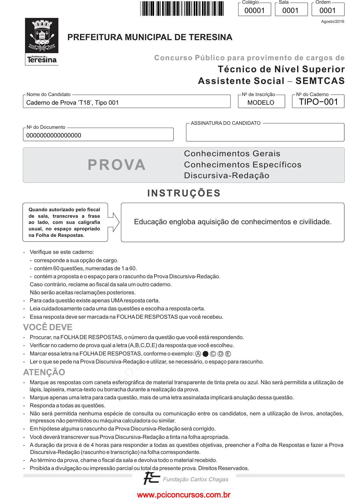 pcimarkpci MjgwNDowMjE0Ojg4ZTE6NjdkZTphNGFkOmVmZmY6ZmU1YjozNDQ3:VGh1LCAyNyBNYXIgMjAyNSAwMDozODo1NCAtMDMwMA== www.pciconcursos.com.br N do CadernooN de Inscriçãoo ASSINATURA DO CANDIDATO N do Documentoo Nome do Candidato Técnico de Nível Superior Assistente Social SEMTCAS� Concurso Público para provimento de cargos de Agosto/2016 Colégio Sala Ordem Quando autorizado pelo fiscal de sala, transcreva a frase ao lado, com sua caligrafia usual, no espaço apropriado na Folha de Respostas. INSTRUÇÕES PROVA Educação engloba aquisição de conhecimentos e civilidade. Conhecimentos Gerais Conhecimentos Específicos Discursiva-Redação PREFEITURA MUNICIPAL DE TERESINA A C D E - Verifique se este caderno: - corresponde a sua opção de cargo. - contém 60 questões, numeradas de 1 a 60. - contém a proposta e o espaço para o rascunho da Prova Discursiva-Redação. Caso contrário, reclame ao fiscal da sala um outro caderno. Não serão aceitas reclamações posteriores. - Para cada questão existe apenas UMAresposta certa. - Leia cuidadosamente cada uma das questões e escolha a resposta certa. - Essa resposta deve ser marcada na FOLHADE RESPOSTAS que você recebeu. - Procurar, na FOLHADE RESPOSTAS, o número da questão que você está respondendo. - Verificar no caderno de prova qual a letra (A,B,C,D,E) da resposta que você escolheu. - Marcar essa letra na FOLHADE RESPOSTAS, conforme o exemplo: - Ler o que se pede na Prova Discursiva-Redação e utilizar, se necessário, o espaço para rascunho. - Marque as respostas com caneta esferográfica de material transparente de tinta preta ou azul. Não será permitida a utilização de lápis, lapiseira, marca-texto ou borracha durante a realização da prova. - Marque apenas uma letra para cada questão, mais de uma letra assinalada implicará anulação dessa questão. - Responda a todas as questões. - Não será permitida nenhuma espécie de consulta ou comunicação entre os candidatos, nem a utilização de livros, anotações, impressos não permitidos ou máquina calculadora ou similar. - Em hipótese alguma o rascunho da Prova Discursiva-Redação será corrigido. - Você deverá transcrever sua Prova Discursiva-Redação a tinta na folha apropriada. - A duração da prova é de 4 horas para responder a todas as questões objetivas, preencher a Folha de Respostas e fazer a Prova Discursiva-Redação (rascunho e transcrição) na folha correspondente. - Ao término da prova, chame o fiscal da sala e devolva todo o material recebido. - Proibida a divulgação ou impressão parcial ou total da presente prova. Direitos Reservados. VOCÊ DEVE ATENÇÃO 16-08 1852 Caderno de Prova ’T18’, Tipo 001 MODELO 0000000000000000 TIPO−001 00001 0001 0001 www.pciconcursos.com.br pcimarkpci MjgwNDowMjE0Ojg4ZTE6NjdkZTphNGFkOmVmZmY6ZmU1YjozNDQ3:VGh1LCAyNyBNYXIgMjAyNSAwMDozODo1NCAtMDMwMA== www.pciconcursos.com.br 2 PMPID-Conhec.Gerais3 CONHECIMENTOS GERAIS Português Atenção: Para responder às questões de números 1 a 8, considere o texto abaixo. Há um comentário frequentemente encontrado nos meios de comunicação ou mesmo em conversas cotidianas: “O carnaval de hoje não é mais o mesmo. Transformou-se em um grande empreendimento turístico. Perdeu a autenticidade.” Em seu sentido amplo, esse comentário aplica-se a diversas modalidades de cultura popular: não só às festas, mas também ao artesanato, à música, à dança, à culinária. Pode ser expresso na forma de um lamento e de um incontido sentimento de nostalgia. Em outras palavras, circula de modo amplo e difuso em nosso cotidiano uma perspectiva sobre as culturas populares na qual estas são apresentadas sob o signo da perda. Supõe-se que elas conheceram em sua longa história um momento no qual teriam florescido na sua forma mais autêntica e próxima às expectativas daqueles que as produzem. Mas desde então, como consequência das transformações históricas e em especial da chamada modernização, essas formas socioculturais teriam cada vez mais perdido seus atributos definidores. Essa narrativa é seguramente poderosa e tem notável capacidade de convencimento. No entanto, um fantasma ronda os estudos sobre as culturas populares. Elas não desapareceram; continuam a existir e se reproduzir: festas regionais, como o bumba meu boi; as festas do Divino Espírito Santo; as festas de Reis; as inúmeras modalidades de música popular ou folclórica produzidas em diversas regiões do Brasil. Os exemplos podem se estender facilmente. O que importa assinalar, no entanto, é que essas formas de cultura popular continuam a ser produzidas no tempo presente e de modo criativo; e não parecem indicar, ao contrário do que se afirma obsessivamente, que estejam em processo de desaparecimento. O problema evidentemente não está na cultura popular, mas nas perspectivas que postulam sua existência arcaica e seu inevitável desaparecimento. Trata-se de um fantasma produzido pelos que se recusam a reconhecer que elas expressam visões de mundo diferentes. Muitas vezes, essas formas socioculturais estão associadas à oposição entre um mundo rural estável e harmônico e um mundo urbano industrializado e “inautêntico”. Contudo, pesquisas de antropologia social ou cultural já demonstraram que as culturas populares, estejam elas situadas no mundo rural ou nas grandes cidades, desempenham funções sociais e simbólicas fundamentais para sua persistência e reprodução. Desse modo, festas, artesanatos, lendas, formas musicais, dança, culinária articulam sim- bolicamente concepções coletivas de sociedade. As culturas populares não se constituem em agregados de traços culturais passíveis de serem inventariados. Elas consistem efetivamente em sistemas de práticas sociais. Os comentários usuais sobre uma suposta perda de autenticidade das culturas populares na atualidade esquecem que elas não são o espelho de nossas categorias e classificações; o que elas oferecem de m
