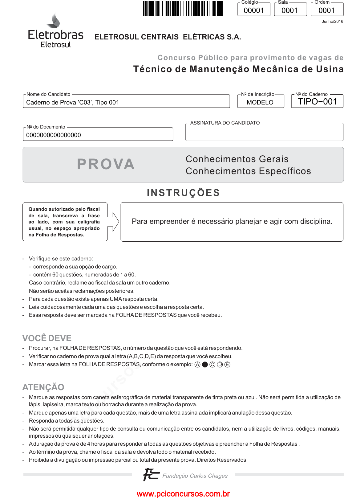 pcimarkpci MjgwNDowMjE0Ojg4ZTE6NjdkZTphNGFkOmVmZmY6ZmU1YjozNDQ3:VGh1LCAyNyBNYXIgMjAyNSAwMDozNzo1OCAtMDMwMA== www.pciconcursos.com.br N do CadernooN de Inscriçãoo ASSINATURA DO CANDIDATO N do Documentoo Nome do Candidato Técnico de Manutenção Mecânica de Usina Concurso Público para provimento de vagas de Junho/2016 Colégio Sala Ordem Quando autorizado pelo fiscal de sala, transcreva a frase ao lado, com sua caligrafia usual, no espaço apropriado na Folha de Respostas. INSTRUÇÕES PROVA Para empreender é necessário planejar e agir com disciplina. Conhecimentos Gerais Conhecimentos Específicos A C D E - Verifique se este caderno: - corresponde a sua opção de cargo. - contém 60 questões, numeradas de 1 a 60. Caso contrário, reclame ao fiscal da sala um outro caderno. Não serão aceitas reclamações posteriores. - Para cada questão existe apenas UMAresposta certa. - Leia cuidadosamente cada uma das questões e escolha a resposta certa. - Essa resposta deve ser marcada na FOLHADE RESPOSTAS que você recebeu. - Procurar, na FOLHADE RESPOSTAS, o número da questão que você está respondendo. - Verificar no caderno de prova qual a letra (A,B,C,D,E) da resposta que você escolheu. - Marcar essa letra na FOLHADE RESPOSTAS, conforme o exemplo: - Marque as respostas com caneta esferográfica de material transparente de tinta preta ou azul. Não será permitida a utilização de lápis, lapiseira, marca texto ou borracha durante a realização da prova. - Marque apenas uma letra para cada questão, mais de uma letra assinalada implicará anulação dessa questão. - Responda a todas as questões. - Não será permitida qualquer tipo de consulta ou comunicação entre os candidatos, nem a utilização de livros, códigos, manuais, impressos ou quaisquer anotações. - Aduração da prova é de 4 horas para responder a todas as questões objetivas e preencher a Folha de Respostas . - Ao término da prova, chame o fiscal da sala e devolva todo o material recebido. - Proibida a divulgação ou impressão parcial ou total da presente prova. Direitos Reservados. VOCÊ DEVE ATENÇÃO ELETROSUL CENTRAIS ELÉTRICAS S.A. Caderno de Prova ’C03’, Tipo 001 MODELO 0000000000000000 TIPO−001 00001 0001 0001 www.pciconcursos.com.br pcimarkpci MjgwNDowMjE0Ojg4ZTE6NjdkZTphNGFkOmVmZmY6ZmU1YjozNDQ3:VGh1LCAyNyBNYXIgMjAyNSAwMDozNzo1OCAtMDMwMA== www.pciconcursos.com.br 2 ELETR-Conhecimentos Gerais1 CONHECIMENTOS GERAIS Língua Portuguesa Atenção: As questões de números 1 a 5 referem-se ao texto abaixo. Abu Dhabi constrói cidade do futuro, com tudo movido a energia solar Bem no meio do deserto, há um lugar onde o calor é extremo. Sessenta e três graus ou até mais no verão. E foi exatamente por causa da temperatura que foi construída em Abu Dhabi uma das maiores usinas de energia solar do mundo. Os Emirados Árabes estão investindo em fontes energéticas renováveis. Não vão substituir o petróleo, que eles têm de sobra por mais 100 anos pelo menos. O que pretendem é diversificar e poluir menos. Uma aposta no futuro. A preocupação com o planeta levou Abu Dhabi a tirar do papel a cidade sustentável de Masdar. Dez por cento do planejado está pronto. Um traçado urbanístico ousado, que deixa os carros de fora. Lá só se anda a pé ou de bicicleta. As ruas são bem estreitas para que um prédio faça sombra no outro. É perfeito para o deserto. Os revestimentos das paredes isolam o calor. E a direção dos ventos foi estudada para criar corredores de brisa. (Adaptado de: “Abu Dhabi constrói cidade do futuro, com tudo movido a energia solar”. Disponível em: http://g1.globo.com/globo- reporter/noticia/2016/04/abu-dhabi-constroi-cidade-do-futuro-com-tudo-movido-energia-solar.html) 1. A construção de uma das maiores usinas de energia solar do mundo em Abu Dhabi se justifica pela preocupação dos Emirados Árabes em (A) eliminar as fontes de calor, especialmente no verão. (B) preservar as minas de petróleo que ainda restam. (C) emitir menos poluentes durante a geração de energia. (D) fornecer energia a baixo custo para a população local. (E) pôr fim imediato à poluição gerada pelo uso do petróleo. 2. Acerca da cidade de Masdar, é correto afirmar que (A) foi projetada com estratégias para reduzir o calor. (B) permanece no papel, pois sua execução é inviável. (C) partiu de um projeto testado antes em outra região. (D) foi planejada durante uma época anterior aos carros. (E) é bem convencional, inspirada nas grandes metrópoles. 3. A preocupação com o planeta levou Abu Dhabi a tirar do papel a cidade sustentável de Masdar. (3 o parágrafo) Ao substituir-se a forma “levou” pela construção “fez com que”, o segmento sublinhado deverá ser substituído, preservando-se a correlação verbal, por (A) tirará. (B) tira. (C) tirava. (D) tirasse. (E) tirar. 4. Os revestimentos das paredes isolam o calor. (3 o parágrafo) Essa oração está corretamente reescrita na voz passiva em: (A) Isola o calor os revestimentos das paredes. (B) O calor é isolado pelos revestimentos das paredes. (C) Isolam-se o calor ao ser revestido as paredes. (D) O calor é que isola os revestimentos das paredes. (E) Os revestimentos das paredes são isolado do calor. 5. Considere as seguintes passagens do texto: I. E foi exatamente por causa da temperatura que foi construída em Abu Dhabi uma das maiores usinas de energia solar do mundo. (1 o parágrafo) II. Não vão substituir o petróleo, que eles têm de sobra por mais 100 anos pelo menos. (2 o parágrafo) III. Um traçado urbanístico ousado, que deixa os carros de fora. (3 o parágrafo) IV. As ruas são bem estreitas para que um prédio faça sombra no outro. (3 o parágrafo) O termo “que” é pronome e pode ser substituído por “o qual” APENAS em (A) I e II. (B) II e III. (C) I, II e IV. (D) I e IV. (E) III e IV. Caderno de Prova ’C03’, Tipo 001 www.pciconcursos.com.br pcimarkpci MjgwNDowMjE0Ojg4ZTE6NjdkZTphNGFkO