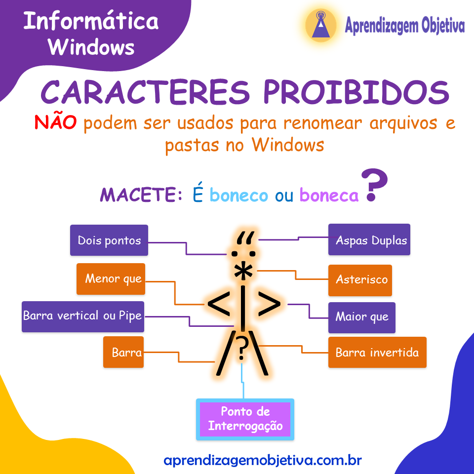 Informática Aprendizagem Objetiva Windows CARACTERES PROIBIDOS NÃO podem ser usados para renomear arquivos e pastas no Windows MACETE: boneco ou boneca É ? Dois pontos Aspas Duplas * Menor que Asterisco Barra vertical ou Pipe Maior que Barra Barra invertida Ponto de Interrogação