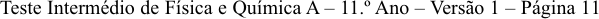 5.3. Admita que dispunha de uma solução aquosa de amoníaco de concentração mássica 2,50 × 102 g dm−3, e que pretendia preparar, a partir daquela solução concentrada, 500 cm3 de uma solução diluída, de concentração 0,400 mol dm−3. 5.3.1. Calcule o volume de solução concentrada que teria de medir para preparar a solução pretendida. Apresente todas as etapas de resolução. 5.3.2. Na diluição efectuada utilizou água destilada, de pH igual a 7,04. Seleccione a única opção que refere o valor correcto da concentração de iões H3O+ na referida água. (A) 9,12 × 10−8 mol dm−3 (B) 1,00 × 10−7 mol dm−3 (C) 1,10 × 107 mol dm−3 (D) 8,48 × 10−1 mol dm−3 5.3.3. Seleccione a única opção que contém os termos que preenchem, sequencialmente, os espaços seguintes, de modo a obter uma afirmação correcta. Na solução aquosa diluída de NH3, a 25 ºC, a concentração de iões OH−(aq) é 2,7 × 10−3 mol dm−3 e a concentração de iões H3O+(aq) é ____________ mol dm−3 , o que permite concluir que essa solução é _____________. (A) 3,7 × 10−12 … ácida (B) 2,7 × 1011 … ácida (C) 2,7 × 1011 … básica (D) 3,7 × 10−12 … básica Teste Intermédio de Física e Química A – 11.º Ano – Versão 1 – Página 11 Teste Intermédio - Abril de 2010Página 177 Utilizador Rectangle