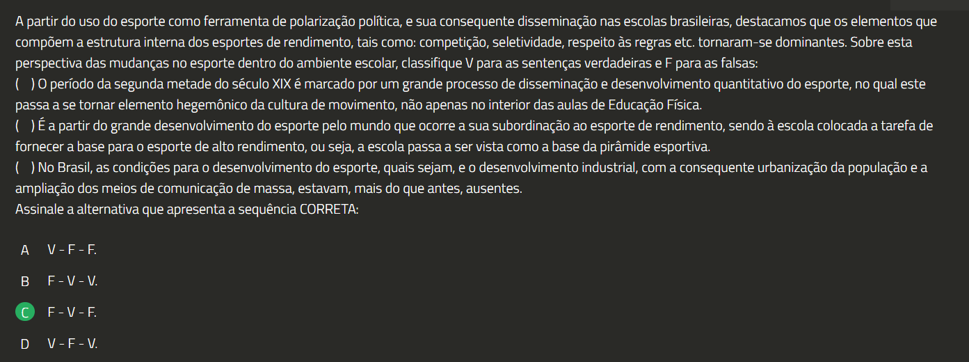 A partir do uso do esporte como ferramenta de polarização política, e sua disseminação nas escolas brasileiras, destacamos que os elementos que compõem a estrutura interna dos esportes de rendimento, tais como: competição, seletividade, respeito às regras etc. tornaram-se dominantes. Sobre esta perspectiva das mudanças no esporte dentro do ambiente escolar, classifique V para as sentenças verdadeiras e F para as falsas: ( ) período da segunda metade do século XIX é marcado por um grande processo de disseminação e desenvolvimento quantitativo do esporte, no qual este passa a se tornar elemento hegemônico da cultura de movimento, não apenas no interior das aulas de Educação Física. ( ) É a partir do grande desenvolvimento do esporte pelo mundo que ocorre a sua subordinação ao esporte de rendimento, sendo à escola colocada a tarefa de fornecer a base para esporte de alto rendimento, ou seja, a escola passa a ser vista como a base da pirâmide esportiva. ( ) No Brasil, as condições para desenvolvimento do esporte, quais sejam, e desenvolvimento industrial, com a urbanização da população e a ampliação dos meios de comunicação de massa, estavam, mais do que antes, ausentes. Assinale a alternativa que apresenta a CORRETA: A V - F - F. B F - V - V. C F V F. D V - V.