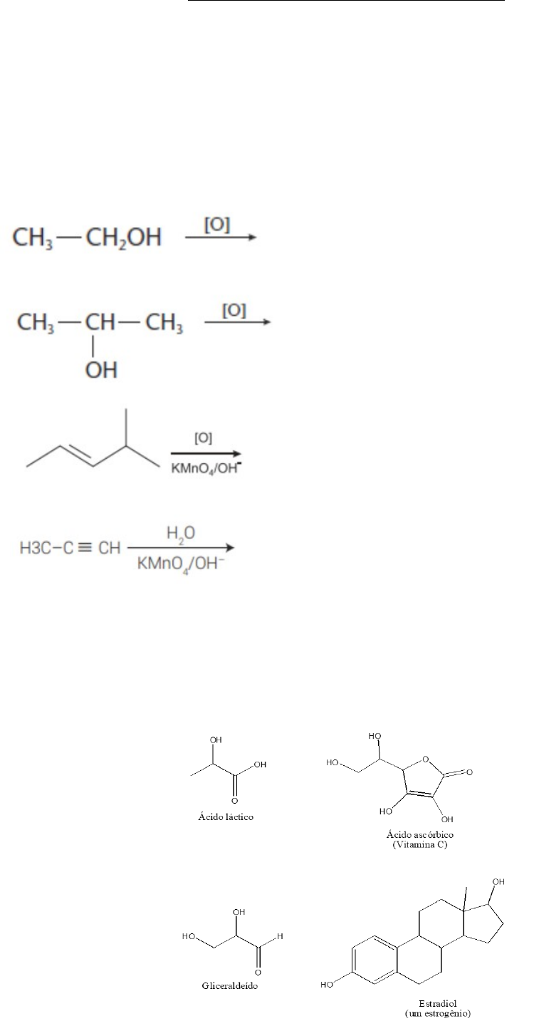 QUESTÕES DE REAÇÕES ORGÂNICAS A oxidação dos álcoois é uma reação química importante na Química Orgânica e pode ser promovida por agentes oxidantes como permanganato de potássio (KMnO₄) e dicromato de potássio (K₂Cr₂O₇) em diferentes meios, bem como pelo oxigênio do ar na presença de catalisadores como cobre ou platina. Considerando a estrutura molecular dos álcoois, apresente o produto formado através da reação de oxidação de álcoois primários, secundários e terciários. Além disso, dê o nome do composto orgânico formado: I – II – III – IV – A quiralidade dos compostos orgânicos tem grande impacto na química medicinal, sendo um fator determinante na segurança e eficácia dos medicamentos. O estudo dos carbonos quirais permite o desenvolvimento de fármacos mais seletivos e com menos efeitos colaterais, melhorando os tratamentos disponíveis. Conforme as moléculas das substâncias apresentadas abaixo: Indique com um círculo quais os átomos em cada uma das moléculas vistas a seguir são centros de quiralidade? 01 – No dia a dia do químico orgânico, são empregadas reações de substituição nas sínteses orgânicas. Nessas reações, é possível identificar, por exemplo, um nucleófilo, espécie deficiente de elétrons, o substrato, reagente orgânico, e o grupo abandonador, grupamento que se desliga do substrato e carrega consigo o par de elétrons. Dada a reação a seguir, indique o nucleófilo, o substrato e o grupo abandonador: A) CH3CH3CH3S– (nucleófilo); CH3–I (substrato); I– (grupo abandonador). B) CH3–I (nucleófilo); CH3CH3CH3S– (substrato); I– (grupo abandonador). C) I– (nucleófilo); CH3CH3CH3S– (substrato); CH3– I (grupo abandonador). D) I– (nucleófilo); CH3– I (substrato); CH3CH3CH3S– (grupo abandonador). E) CH3CH3CH3SCH3 (nucleófilo); CH3– I (substrato); CH3CH3CH3S– (grupo abandonador). Resolução: O nucleófilo deve estar presente no reagente. Como tem afinidade por carga positiva, a espécie CH3CH3CH3S–, carregada negativamente, é o nucleófilo. O CH3–I é o substrato, pois é orgânico e é um dos reagentes. Perceba que, no rompimento da ligação, o iodeto (I–) é o grupo abandonador que carrega o par de elétrons da reação. Veja a identificação na reação: 02 – Os compostos orgânicos não são tão reativos quanto os inorgânicos. Dessa forma, ao trabalhar com síntese orgânica, é preciso conhecer a reatividade dos compostos, sendo que muitas dessas reações necessitam de iniciadores, catalisador, bases ou ácidos fortes ou, ainda, oxidantes ou redutores no meio reacional. Diante do exposto, analise as afirmativas a seguir: I - O AlCl3 é uma base de Lewis, e seus átomos têm a camada de valência completa. II - A amônia (NH3) é uma base de Lewis, pois pode doar o par de elétrons. III - O termo "carbocátion" se refere a uma espécie na qual o carbono é deficiente de elétrons e atua como ácido de Lewis. Está correto o que se afirma em: A) I e II. B) apenas I. C) I, II e III. D) II e III. E) apenas III. Resolução: I. O alumínio do grupo III tem apenas três elétrons (e-) de valência compartilhados com o cloro e alcança 6- na camada de valência. II. A amônia é a base de Lewis mais comum. O nitrogênio apresenta 5 e- na camada de valência, onde um par isolado pode ser doado. III. Os átomos de carbono adquirem carga negativa ao perderem elétrons. Como têm a capacidade de receber um par de e-, se comportam como ácidos de Lewis. 03 – Ao falarmos de alimentos orgânicos, estamos falando de vegetais produzidos sem o uso de agrotóxicos e adubação química. Esse contexto difere do termo "orgânica" na química, para a qual os compostos que contêm átomos de carbono são orgânicos. No século XIX, Berzelius defendia a teoria da força vital, segundo a qual as substâncias oriundas do reino animal e vegetal não poderiam ser sintetizadas em laboratório. Essa teoria cai por terra com a síntese de amônia, por Wöhler, em 1828. Por que essa síntese propicia a refutação da teoria da força vital? A) Ao sintetizar a amônia, Wöhler prova que é possível sintetizar substâncias inorgânicas em laboratório. Segundo o conceito da época, as substâncias orgânicas podiam ser encontradas apenas no reino mineral. B) Com a síntese da amônia, foi descoberto o átomo de carbono. Essa descoberta leva a uma nova definição de química orgânica, sendo a parte da química que estuda compostos que contenham átomos de carbono. C) Ao realizar a síntese orgânica, Wöhler comprova que é possível recriar tecidos vegetais e animais em laboratório. Assim, a teoria do vitalismo sofre uma derrocada, pois substâncias tidas como orgânicas são sintetizadas. D) A amônia formada está presente na urina, que era uma substância tida como orgânica. Segundo o conceito da época, substâncias oriundas de animais e plantas eram orgânicas. E) A teoria do vitalismo é refutada porque, com a síntese da amônia, Wöhler descobre que nessa substância não existem átomos de carbono. Dessa forma, a amônia não pode ser classificada como substância orgânica. Resolução: A síntese da ureia é a primeira síntese orgânica registrada e marca o desenvolvimento da química orgânica. Derruba, ainda, a ideia de compostos orgânicos que não poderiam ser sintetizados em laboratório. A ureia foi obtida por Wöhler, em 1828, pelo aquecimento do cianato de amônio. Uma vez sintetizada a amônia em laboratório, a teoria do vitalismo é confrontada, pois não teve origem no meio vegetal e animal, e sim do cianato de amônio (NH4CNO), um sal inorgânico. Atualmente, a química orgânica estuda os compostos que contenham carbono em sua estrutura. Por sua vez, a amônia em si não é uma substância orgânica, pois não integra átomos de C na estrutura. 04 – Desde a primeira síntese orgânica, promovida por Wöhler, a química orgânica evoluiu muito, seja com a hid